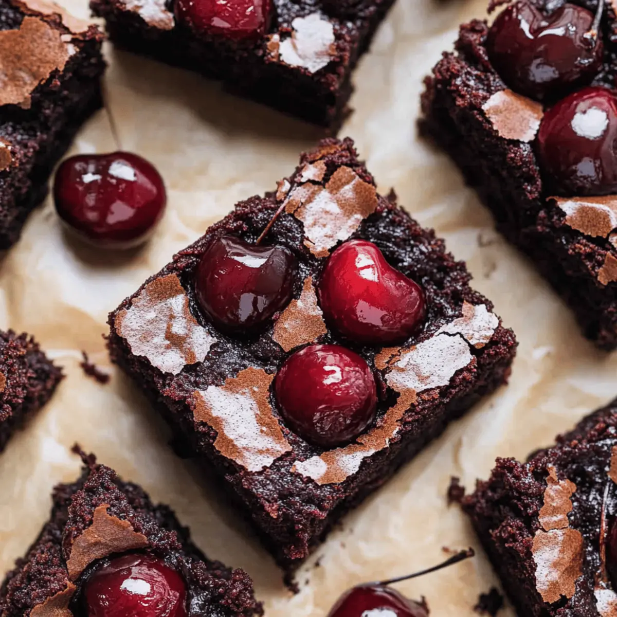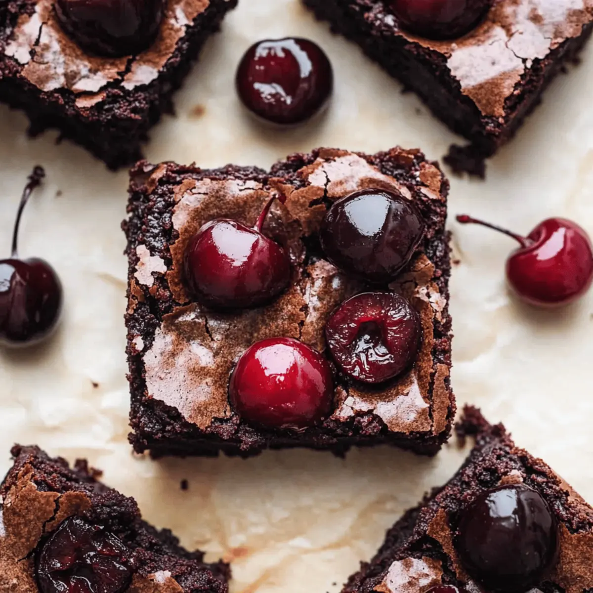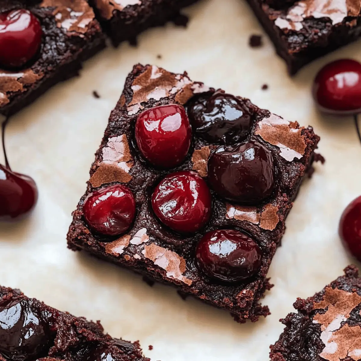 Jump to Recipe Print RecipeThe aroma of warm chocolate swirled with roasted cherries is an invitation to indulge that no one can resist. As I made these Roasted Chocolate Cherry Brownies, I couldn’t help but be transported to my favorite bakery, where the treats always seem too good to share. This fudgy delight is not only easy to make, but it also celebrates the seasonal sweetness of fresh cherries, elevating your typical brownie experience. Imagine sinking your teeth into a rich chocolate base, only to encounter the delightful tartness of the cherries bursting from within. Perfect for gatherings or a cozy night in, these brownies promise to be the star of any dessert table. Are you ready to create a treat that’s equal parts simple and sensational? What makes these brownies irresistible? Fudgy Delight: These Roasted Chocolate Cherry Brownies are incredibly rich and moist, creating an indulgent bite that may just spoil you for all other desserts. Seasonal Flavor: Utilizing fresh cherries brings a tartness that beautifully balances the sweetness, making it a seasonal treat worth savoring. Easy to Make: With straightforward steps, even novice bakers will find joy in creating this simple yet delectable dessert. Crowd-Pleasing Appeal: Perfect for gatherings or cozy nights, they are sure to impress friends and family with their gourmet flavor. Versatility: Customize by adding nuts or mixing in other fruits like raspberries for a delightful twist—or consider serving them warm with a scoop of ice cream for an elevated experience! Roasted Chocolate Cherry Brownies Ingredients For the Brownies Cherries – Fresh, cut in half; they provide natural sweetness and fruitiness. If fresh cherries aren’t available, use thawed frozen cherries instead. Sugar – White granulated sugar enhances sweetness; brown sugar can be substituted for a richer flavor. Eggs – Large eggs and 1 egg yolk act as a binder while adding richness; make sure they’re at room temperature for the best results. Unsalted Butter – Melted for moisture and flavor; you can substitute it with coconut oil for a dairy-free option. Oil – Canola or vegetable oil adds moisture; olive oil can provide a unique flavor twist. Vanilla Extract – Pure extract enhances sweetness; consider swapping it for almond extract for a different taste. All-Purpose Flour – Sifted to provide structure; for a gluten-free version, use a 1:1 gluten-free flour blend. Dutch Process Cocoa Powder – Adds deep chocolate flavor; do not substitute with regular cocoa powder to maintain richness. Cornstarch – Recommended for creating a chewy texture; it’s optional but adds to the fudginess of the brownies. Salt – Essential for enhancing flavor; be sure not to omit it. Semi-Sweet Chocolate Chips – For a rich, chocolate experience; feel free to use milk chocolate for a sweeter result. For the Topping Roasted Cherries – These add a beautiful, sweet-tart contrast; reserve some for topping the brownies before serving. These Roasted Chocolate Cherry Brownies promise a delightful blend of rich chocolate and seasonal fruit flavors that will keep you returning for more! Step‑by‑Step Instructions for Roasted Chocolate Cherry Brownies Step 1: Preheat and Prepare Begin by preheating your oven to 400°F (200°C). Line a baking sheet with parchment paper and arrange the halved cherries on it. Sprinkle them with sugar to enhance their sweetness. Roast the cherries for 10 minutes until they become tender and slightly caramelized. Once done, remove them from the oven and allow them to cool as you prepare the brownie batter. Step 2: Reduce Oven Temperature Next, lower the oven temperature to 325°F (163°C). While it cools, grease an 8×8 inch baking dish and line the bottom and sides with parchment paper for easy removal later. This size is perfect for these Roasted Chocolate Cherry Brownies, ensuring they bake evenly and develop a beautiful crust. Step 3: Mix Dry Ingredients In a mixing bowl, sift together the all-purpose flour, Dutch process cocoa powder, cornstarch, and salt. This step is crucial to prevent lumps and ensure a smooth batter. Set this dry mixture aside, as we will combine it with our wet ingredients to create the rich base for our fudgy brownies. Step 4: Beat Eggs and Sugar In a separate large mixing bowl, combine the eggs, egg yolk, and sugar. Using a whisk attachment, beat on high speed for about 5 minutes until the mixture becomes pale and fluffy, significantly increasing in volume. This aeration is essential for achieving that coveted crinkle top on your Roasted Chocolate Cherry Brownies. Step 5: Combine Wet Ingredients Melt the unsalted butter and let it cool slightly. In a small bowl, mix the melted butter with canola oil and vanilla extract. Slowly add this fragrant mixture to the fluffy egg and sugar mixture while mixing on low speed. This infusion of flavors adds richness to the brownies, perfectly complementing the cherries. Step 6: Fold Dry Ingredients Carefully fold the dry ingredient mixture into the wet ingredients until they are mostly combined. Be gentle to avoid deflating the batter. Once nearly mixed, gently incorporate half of the roasted cherries and semi-sweet chocolate chips, allowing them to nestle into the batter and bring bursts of flavor to your Roasted Chocolate Cherry Brownies. Step 7: Bake Pour the brownie batter into your prepared baking dish, smoothing the top with a spatula. Place it in the oven and bake for 40 to 50 minutes. The edges should be set, while the center remains slightly underdone for that fudgy texture. A toothpick inserted into the center should come out with a few moist crumbs attached. Step 8: Cool and Serve Once baked, remove the dish from the oven and let the brownies cool completely at room temperature. For added firmness, transfer them to the freezer for about 15 minutes. Before serving, top with the remaining roasted cherries, slice into squares, and enjoy the indulgent goodness of these