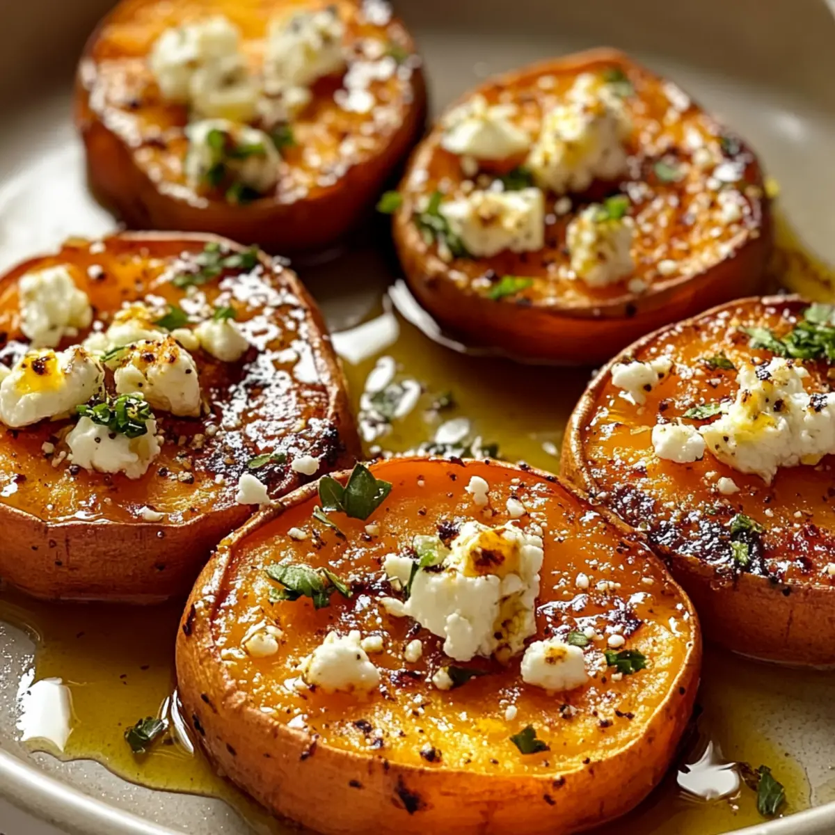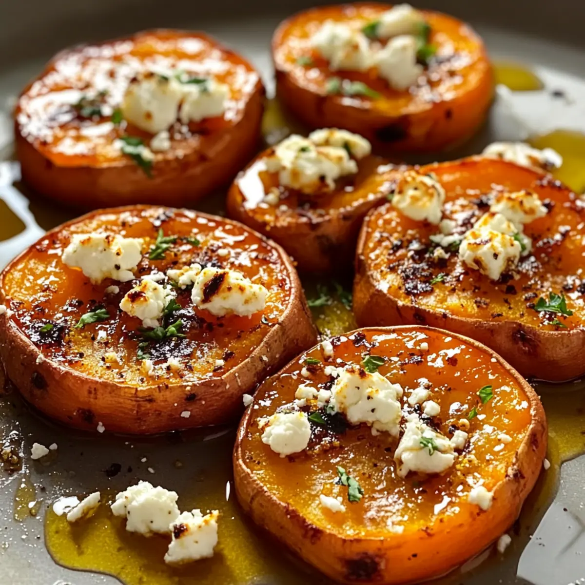 • Prepare to indulge in the delightful flavor of Roasted Sweet Potato Rounds with Honey & Feta.
