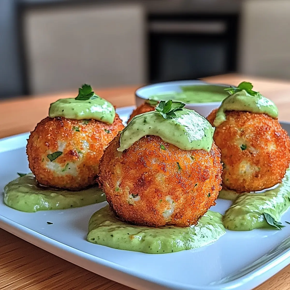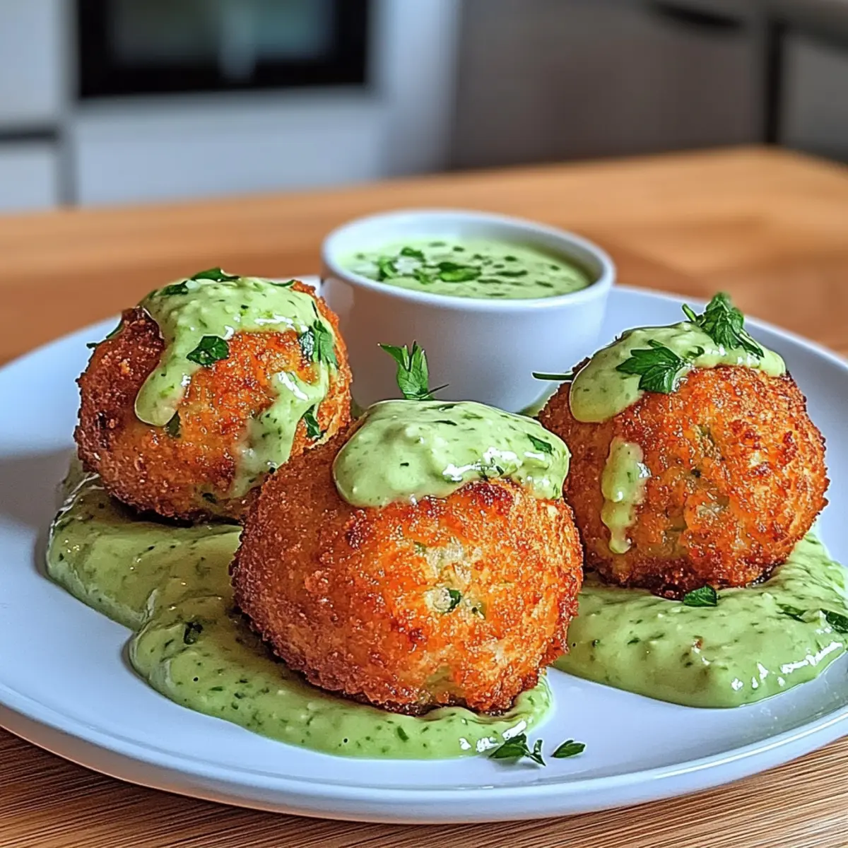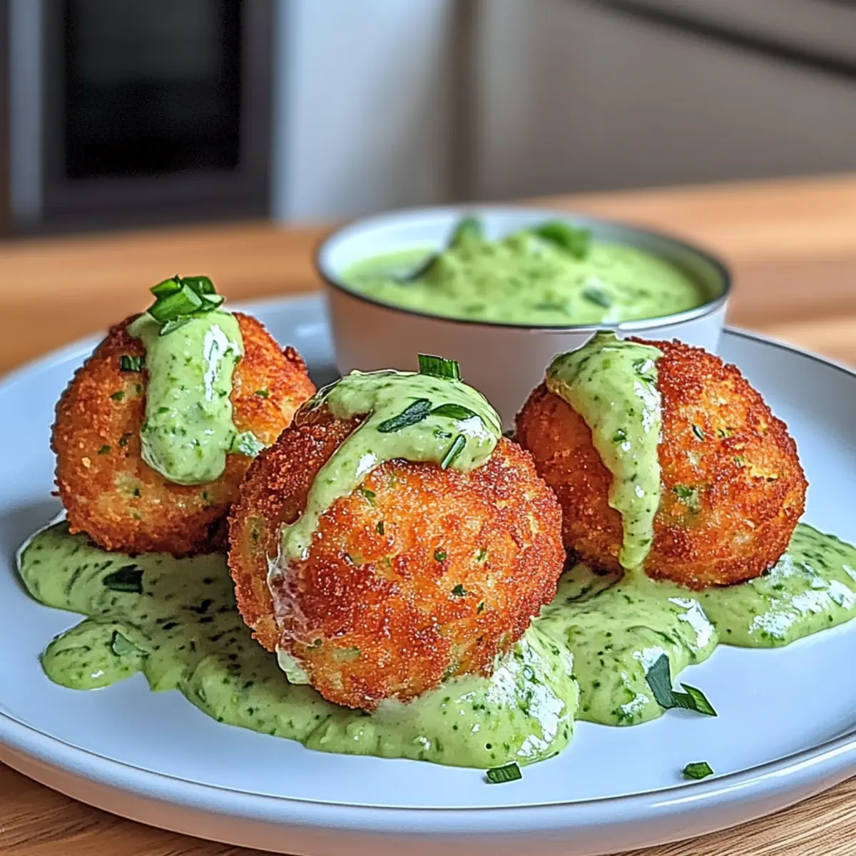 Jump to Recipe Print RecipeAs I stood by the kitchen counter, the irresistible scent of fresh salmon brought back memories of summer evenings by the coast. This crispy Salmon Balls with Creamy Avocado Sauce recipe is a delectable way to enjoy this tender fish, wrapped in a crunchy exterior that’s surprisingly easy to prepare. Not only do these little gems make for a healthy appetizer, but they also impress your guests while being perfect for any occasion—from casual get-togethers to cozy family dinners. With minimal prep time and a boost of omega-3s, you’ll be savoring each bite, guilt-free. Ready to elevate your next meal? Let’s dive into this simple yet remarkable recipe! Why are these salmon balls irresistible? Crispy, golden-brown and bursting with flavor! These salmon balls are a delightful twist on a classic seafood dish, serving as a crowd-pleasing appetizer or light main course. Protein-packed with healthy omega-3s, they cater to health-conscious eaters without sacrificing taste. Plus, with just a sprinkle of fresh herbs and a creamy avocado sauce, they are as visually appealing as they are delicious! For a change, try them alongside our Honey Sriracha Salmon for a spicy fusion. Embrace creativity by substituting canned salmon or adding crumbled feta—versatility at its best! Salmon Balls with Creamy Avocado Sauce Ingredients For the Salmon Balls Fresh Salmon – the star of the dish; make sure to flake it finely for the best texture. Breadcrumbs – essential for binding; gluten-free options work equally well! Egg – helps hold everything together; substitute with a flax or chia egg for a vegan version. Chopped Fresh Herbs (e.g., parsley, dill) – brightens the flavor; feel free to use any herbs you like. Lemon Juice – adds a tangy freshness; opt for freshly squeezed for the best zing. Garlic Powder – amps up the flavor; fresh garlic can be used for a more intense kick. Salt and Pepper – vital for seasoning; adjust to suit your taste. For the Creamy Avocado Sauce Ripe Avocados – creamy and rich; ensure they are perfectly ripened for smooth blending. Greek Yogurt – adds tanginess and creaminess; can be swapped for a dairy-free yogurt if preferred. Additional Lemon Juice – enhances the sauce’s brightness; balances out the creaminess beautifully. Salt and Pepper – brings everything together; seasoning can be adjusted to your liking. Embrace this incredible dish: the Salmon Balls with Creamy Avocado Sauce are sure to impress! Step‑by‑Step Instructions for Salmon Balls with Creamy Avocado Sauce Step 1: Preheat the Oven Begin by preheating your oven to 375°F (190°C). This ensures your salmon balls will cook evenly and achieve that lovely golden-brown color. While the oven heats up, gather your baking sheet and line it with parchment paper for easy cleanup later. Step 2: Prepare the Salmon In a large mixing bowl, flake the fresh salmon into small pieces using a fork or your fingers. Aim for manageable, bite-sized flakes to create a perfect texture for your salmon balls. The freshness of the salmon is vital for ensuring those savory flavors shine through in each bite. Step 3: Combine the Ingredients Next, add the breadcrumbs, beaten egg, chopped herbs, lemon juice, garlic powder, salt, and pepper to the bowl with the salmon. Using a spatula, gently stir the mixture until all ingredients are well-combined, forming a cohesive and fragrant salmon mixture. This will create a delightful base for your salmon balls. Step 4: Shape the Balls With lightly wet hands, scoop out portions of the mixture and roll them into balls about 1 inch in diameter. Make sure the mixture is tightly packed so that the salmon balls hold their shape during baking. Place the freshly shaped salmon balls on the prepared baking sheet, ensuring they are evenly spaced. Step 5: Bake the Salmon Balls Slide the baking sheet into the preheated oven and bake the salmon balls for 20 to 25 minutes. Keep an eye on them, and look for a golden-brown crust and a firm touch to indicate they are thoroughly cooked. This delightful step is where your kitchen will fill with mouthwatering aromas. Step 6: Make the Creamy Avocado Sauce While the salmon balls are baking, prepare the creamy avocado sauce. In a blender, combine ripe avocados, Greek yogurt, additional lemon juice, salt, and pepper. Blend until smooth and creamy, adjusting seasoning if necessary. This luscious sauce will be a perfect complement to the crispy salmon balls. Step 7: Serve and Enjoy Once the salmon balls are golden and ready, remove them from the oven and let them cool slightly. Serve warm with the creamy avocado sauce on the side for dipping. These salmon balls with creamy avocado sauce promise to be a delicious treat for you and your family—perfect for any occasion. Make Ahead Options These delicious Salmon Balls with Creamy Avocado Sauce are perfect for meal prep enthusiasts! You can prepare the salmon mixture up to 24 hours in advance; simply cover the bowl with plastic wrap and refrigerate it to maintain freshness. If you’re looking to save time, you can even shape the salmon balls and store them in an airtight container for up to 3 days in the refrigerator. When you’re ready to serve, just bake the shaped balls according to the instructions, and they will be just as crispy and delicious! To keep the creamy avocado sauce vibrant, prepare it right before serving to prevent browning, ensuring all components retain their delightful flavors and textures. Expert Tips for Salmon Balls with Creamy Avocado Sauce Perfect Salmon Texture: Use finely flaked salmon to ensure the texture of the balls is just right—too large pieces can make them fall apart. Crispy Option: For extra crunch, consider shallow or deep frying the salmon balls instead of baking. This provides a delightful golden crust! Moisture Matters: Maintain an internal temperature of 145°F to keep the salmon moist and safe. Use a meat thermometer for accuracy. Avocado 