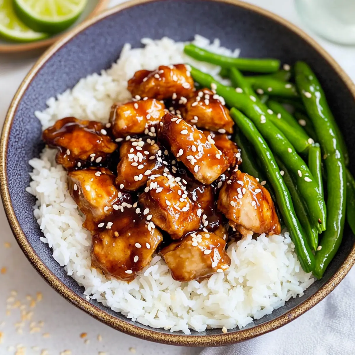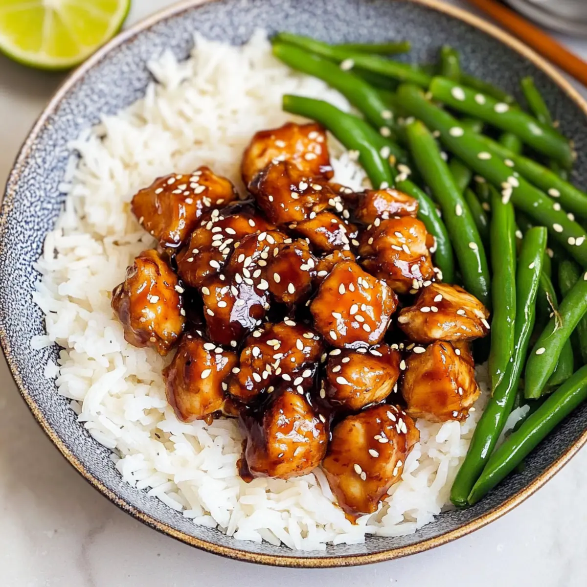 Jump to Recipe Print RecipeAs I tossed the sesame seeds into the hot skillet, the intoxicating aroma of my Healthy Sesame Chicken filled the kitchen, whisking me back to the bustling streets of my favorite Asian market. This recipe is more than just a quick dinner option; it involves a delightful blend of flavors that make it taste even better than takeout while keeping it low-carb and protein-rich. In just 25 minutes, you can whip up this satisfying dish that combines tender chicken with a caramelized sauce. Whether you’re looking to impress guests or simply want a comforting meal at home, this recipe is bound to become a weeknight favorite. Are you ready to discover how to make this healthier version of your beloved sesame chicken? Why is Healthy Sesame Chicken a Must-Try? Packed with protein: Each serving boasts an impressive protein content that keeps you full and satisfied. Quick to prepare: Made in just 25 minutes, this dish is perfect for busy weeknights. Low-carb delight: Enjoy a guilt-free meal that fits into your healthy eating plan. Flavor-packed: The combination of coconut aminos and ginger adds depth to every bite, making it better than takeout. Versatile options: Switch it up by using tofu or different veggies like bell peppers if you’re looking for variety. For another quick dish, check out this Oven Baked Chicken recipe that gives you effortless flavor! Sesame Chicken Ingredients For the Chicken • Boneless, skinless chicken breasts – The main source of protein; substitute chicken thighs for a juicier texture. For the Sauce • Avocado oil – Ideal for sautéing; olive oil or refined coconut oil can be used as a substitute. • Coconut aminos – Adds a savory flavor; low sodium soy sauce works if needed. • Honey – Provides sweetness; maples syrup can serve as a vegan alternative. • Toasted sesame oil – Essential to achieve that rich sesame flavor; avoid substituting with regular sesame oil. • Ground ginger – Adds warmth; fresh ginger can be swapped at a 1:1 ratio here. • Garlic cloves, minced – Enhances flavor; fresh is best, but garlic powder is a fine alternative in a pinch. • Rice vinegar – Offers tanginess; can be omitted, using extra coconut aminos instead. • Black pepper – For seasoning; freshly cracked black pepper is recommended for the best flavor. • Lime zest and juice – Brightens up the dish; omit if citrus flavor isn’t your preference. For Garnishing • Sesame seeds – A delightful garnish; chopped green onions can also be used. For the Side • Cooked green beans – A great vegetable side; substitute with broccoli or any preferred veggies. • Cooked white rice – Serves as the base; switch to cauliflower rice for a low-carb option. With these Sesame Chicken ingredients in hand, you’re just moments away from creating a dish that’s not only healthy but also bursting with flavor! Step‑by‑Step Instructions for Sesame Chicken Step 1: Prepare the Ingredients Begin by cutting the boneless, skinless chicken breasts into 1-inch cubes, ensuring uniformity for even cooking. While you prep the chicken, cook the white rice and green beans according to the package instructions, usually around 15-20 minutes. This sets the stage for your quick and healthy sesame chicken dish while these components cook simultaneously. Step 2: Heat the Pan In a large skillet, heat 2 tablespoons of avocado oil over medium-high heat for about 1 minute. Look for the oil to shimmer slightly, indicating it’s hot enough for sautéing. This step ensures your tender chicken browns beautifully, creating that delicious outer crust integral to the flavor of your sesame chicken. Step 3: Sauté the Chicken Add the cubed chicken to the hot skillet in a single layer, being careful not to overcrowd the pan. Sauté the chicken for approximately 10-12 minutes, turning occasionally, until it’s golden brown on all sides and reaches an internal temperature of 165°F. This visual cue and tender texture promise a mouthwatering result in your healthy sesame chicken. Step 4: Mix the Sauce While the chicken cooks, whisk together the sauce ingredients in a mixing bowl. Combine coconut aminos, honey, toasted sesame oil, minced garlic, ground ginger, rice vinegar, and freshly cracked black pepper until fully incorporated. This sauce will elevate your sesame chicken, adding a rich, savory flavor that’s both sweet and tangy—perfect for coating your chicken. Step 5: Set Aside the Chicken Once the chicken is beautifully browned, carefully remove it from the skillet and set it aside on a plate. Keep it warm while you prepare the sauce. This allows the flavors to meld and ensures your healthy sesame chicken is succulent and loaded with tasty goodness during the mixing process. Step 6: Cook the Sauce Pour the prepared sauce mixture into the same hot pan, stirring gently to deglaze it and incorporate any flavorful bits stuck to the bottom. Cook on medium-high heat for 3-5 minutes until the sauce is bubbling and slightly thickened, watching closely to prevent burning. This step brings out the depth of flavor and creates that irresistible glaze for the sesame chicken. Step 7: Combine Chicken and Sauce Return the sautéed chicken to the skillet and gently toss it in the bubbling sauce to coat thoroughly. Let it cook for an additional 2-3 minutes over medium heat, allowing the chicken to absorb the flavors of the sauce. The rich, glossy coating brings your healthy sesame chicken to life, ready for serving. Step 8: Serve with Sides Finally, serve your quick and healthy sesame chicken over a bed of cooked white rice and alongside the steamed green beans. For an extra touch, sprinkle sesame seeds on top and drizzle with lime juice to brighten the dish. Enjoy your meal that tastes even better than takeout! Sesame Chicken Variations & Substitutions Customize your Healthy Sesame Chicken to tantalize your taste buds! Embrace creativity in the kitchen as you experiment with flavors