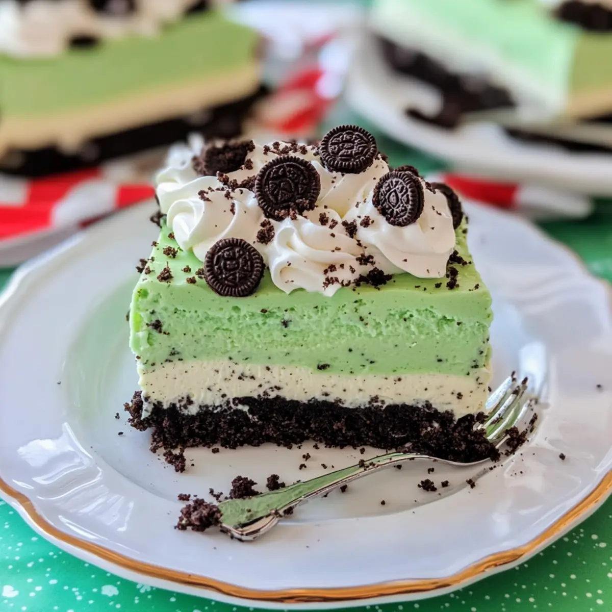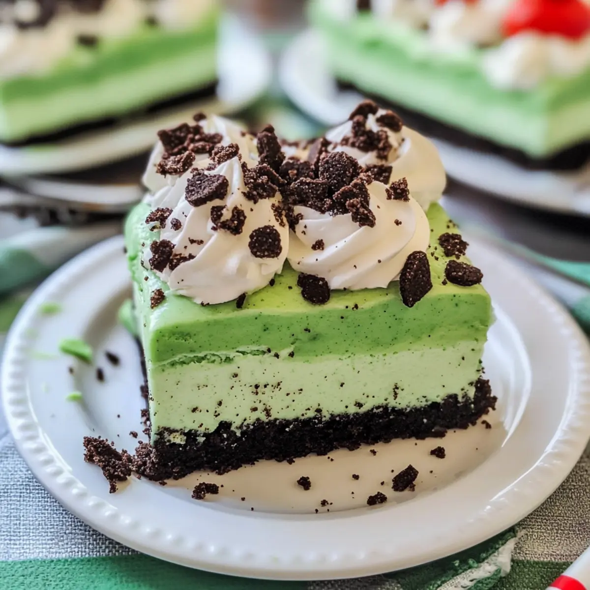Jump to Recipe Print RecipeAs I prepared my kitchen for St. Patrick’s Day, the aroma of freshly crushed Oreos filled the air, transporting me back to childhood memories of festive treats. This Shamrock Shake Lasagna combines the nostalgic flavors of mint and chocolate into a refreshing, layered dessert that’s perfect for celebrating the season. Not only is it a breeze to whip up, but this vegetarian delight is also a showstopper that will impress both family and friends. With rich, creamy layers and a fun twist on the classic Shamrock Shake, your guests will be begging for the recipe! Are you ready to dive into this delightful dessert that brings joy to the table? Why is Shamrock Shake Lasagna a Must-Try? Visual Treat: The vibrant green layers not only catch the eye but also evoke the festive spirit of St. Patrick’s Day. Flavor Explosion: A delicious blend of mint and chocolate that feels like a refreshing shake, making it a unique dessert experience. Easy to Make: With simple steps and readily available ingredients, this recipe is perfect for both novice and experienced cooks. Versatile Options: Customize it with chocolate flair or make it dairy-free without losing its charm. Crowd-Pleasing Delight: Bring it to gatherings, and watch your friends and family rave about your creation—it’s a guaranteed hit! This Shamrock Shake Lasagna is perfect for those looking to impress without spending hours in the kitchen. Enjoy it as a standalone dessert or with a side of freshly brewed coffee to elevate your dessert game! Shamrock Shake Lasagna Ingredients For the Crust • Oreos – Adds structure and a rich chocolate flavor as the base; you can substitute with chocolate graham crackers for a unique twist. • Butter – Binds the crushed Oreos together; consider using coconut oil for a dairy-free option. For the Cheesecake Layer • Cream Cheese – Provides a creamy texture and tangy flavor; ensure it’s well softened for smooth mixing. • Powdered Sugar – Sweetens the filling; erythritol can be used for a sugar-free alternative. • Cool Whip – Essential for a light, airy texture in the layers; feel free to swap for homemade whipped cream. For the Pudding Mixture • Milk – Hydrates and combines the pudding mix; any milk variety works, including non-dairy options. • Cheesecake Instant Pudding Mix – Critical for achieving the desired thickness and flavor in this shamrock shake lasagna. • Mint Extract – Intensifies the mint flavor; omit if a milder flavor is preferred. • Green Gel Food Coloring – Adds a festive touch; adjust the amount based on the vibrancy you desire. Step‑by‑Step Instructions for Shamrock Shake Lasagna Step 1: Preheat the Oven Begin by preheating your oven to 375°F (190°C). While it warms up, grab a 9 x 13 inch baking pan and spray it generously with non-stick cooking spray. This will ensure your delicious Shamrock Shake Lasagna releases easily after baking, preventing any sticky surprises! Step 2: Prepare the Crust In a food processor, finely crush the Oreos until they resemble sand. Next, in a mixing bowl, combine the crushed Oreos with melted butter, mixing well until it forms a cohesive mixture. Press this mixture firmly into the bottom of your prepared baking pan. Bake for about 8 minutes, and then take it out to cool completely. Step 3: Make the Cheesecake Layer Once the Oreo crust is cooled, it’s time to create the creamy cheesecake layer. In a mixing bowl, use a hand mixer to beat together softened cream cheese and powdered sugar until smooth and creamy. Gently fold in one tub of Cool Whip until well combined. Spread this mixture evenly over the cooled Oreo crust, forming a delightful layer ready for the next step. Step 4: Prepare the Pudding Mixture In another large mixing bowl, whisk together the milk and cheesecake instant pudding mix until thoroughly blended and slightly thickened. Then, carefully fold in the remaining Cool Whip to introduce a light and fluffy texture. Add mint extract and a few drops of green gel food coloring to achieve that iconic Shamrock Shake color. Mix until the color is uniform. Step 5: Assemble the Lasagna Now it’s time for the final assembly of the Shamrock Shake Lasagna! Spread the mint-flavored pudding mixture over the cheesecake layer, smoothing it out with a spatula to create an even top layer. For an extra touch, you can sprinkle additional crushed Oreos on top, enhancing both flavor and presentation. Step 6: Chill and Serve Cover the baking pan with plastic wrap and chill your Shamrock Shake Lasagna in the refrigerator for at least 4 hours, or until it is set and firm. This cooling time allows the flavors to meld and the layers to stabilize. Once ready, slice into squares and serve chilled for a delightful dessert that will impress your guests! Shamrock Shake Lasagna Variations Customize your Shamrock Shake Lasagna to suit your taste and dietary needs with these fun and flavorful variations! Flavor Adjustment: Swap mint extract for vanilla for a delightful twist that’s equally indulgent and aromatic. Dairy-Free Option: Use almond cream cheese and non-dairy whipped topping to create a vegan version that everyone can enjoy! Chocolate Boost: Incorporate chocolate pudding mix alongside the cheesecake layer for an extra chocolatey dimension that’ll make dessert lovers swoon. Crunchy Texture: Add a layer of chopped nuts, like pecans or walnuts, between the cheesecake and pudding layers for a satisfying crunch. Fruit Infusion: Layer in some fresh berries, like sliced strawberries or raspberries, for a fruity contrast that adds freshness and zing. Mint Chocolate Layer: Fold in mini chocolate chips with the mint pudding layer for an extra minty chocolate explosion that pairs perfectly with the Oreo crust. Heat Level: For a twist of spice, sprinkle a small amount of chili powder into the pudding mixture for a unique flavor experience that elevates the mint! Colorful Layers: Use different gel food colo