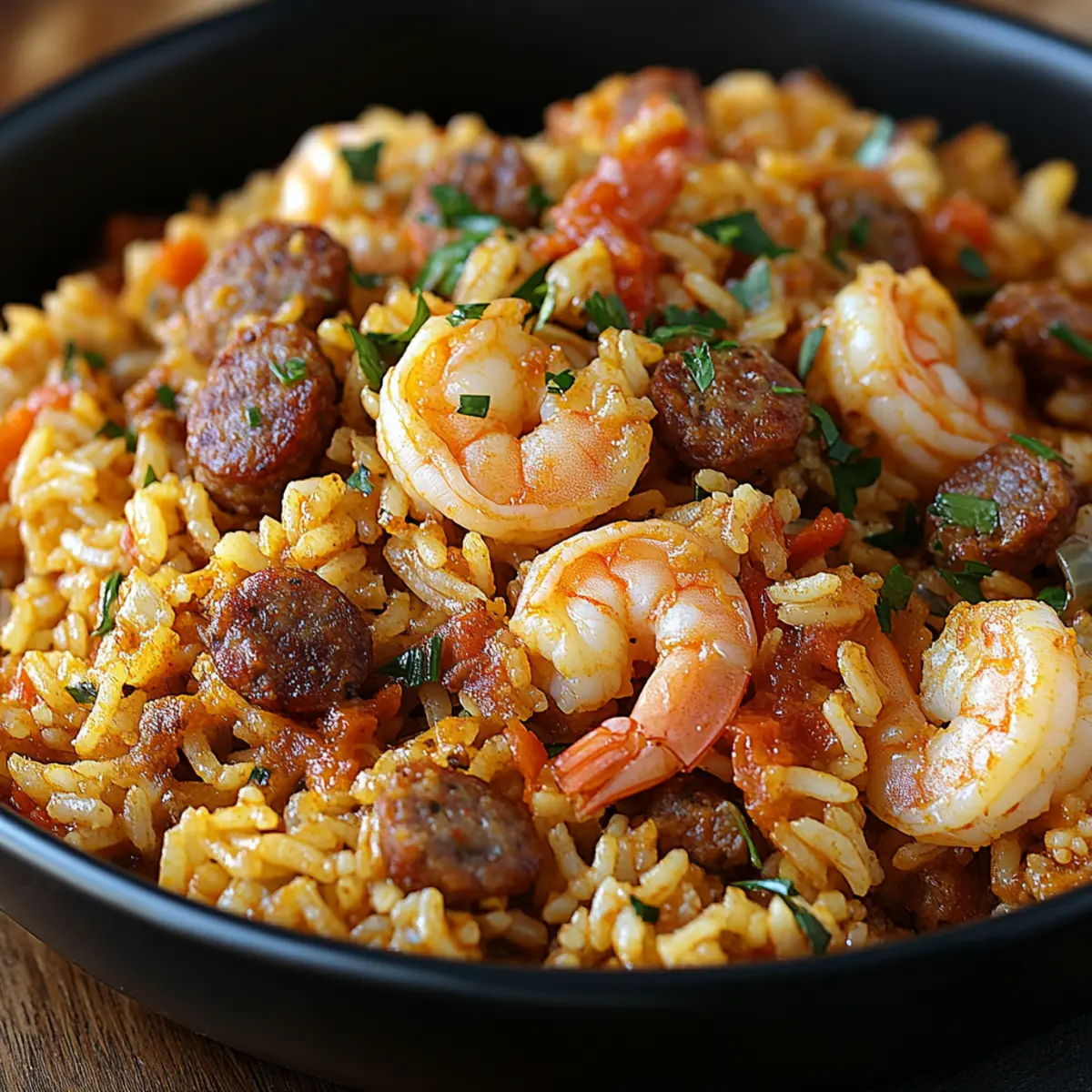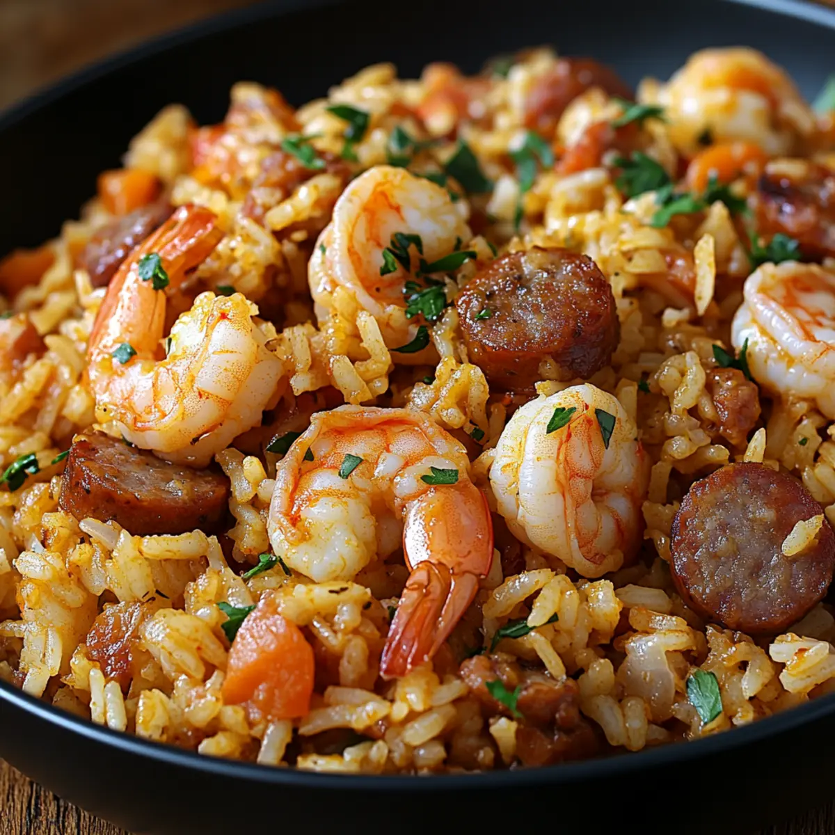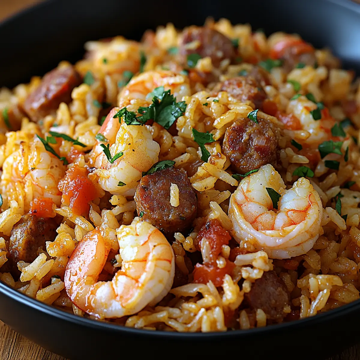 Jump to Recipe Print RecipeAs I stood in my kitchen, the savory aroma of spices sizzling on the stove instantly took me back to summers spent in the South, surrounded by family and laughter. This Shrimp Sausage Dirty Rice recipe captures that essence perfectly, blending comforting smoky flavors with a hint of spice in a single pot. This dish is not only a crowd-pleaser, but it also comes together quickly, making it an ideal choice for busy weeknights. With options to swap in chicken or tofu, you can easily tailor it to fit your and your family’s preferences. Are you ready to dive into a bowl of flavor and warmth? Let’s bring a taste of Southern comfort to your table! Why is Shrimp Sausage Dirty Rice a must-try? Comforting and Flavorful: This dish combines smoky sausage and tender shrimp in a delightful medley that warms your soul. One-Pot Wonder: The convenience of cooking everything in one pot saves you time and minimizes cleanup—perfect for hectic evenings. Customizable Options: Whether you prefer chicken, tofu, or even want to add more veggies like corn or peas, this recipe easily adapts to fit any dietary preference! Family-Friendly: It’s a guaranteed crowd-pleaser that brings everyone around the table, reminiscent of family gatherings filled with laughter. Quick Preparation: You can whip this up in no time, making it ideal for weeknight meals when you crave something satisfying yet simple. Try pairing it with Fried Rice Savor for even more deliciousness! Shrimp Sausage Dirty Rice Ingredients For the Rice • Long-grain white rice – This is the foundation, giving the dish its structure; jasmine or brown rice can be delicious alternatives. For the Protein • Cooked shrimp – Adds tender bites of protein; chicken or tofu can also be used for variations. • Ground sausage – Infuses the dish with savory goodness; consider turkey sausage for a leaner option. For the Liquid • Chicken broth – Deepens flavor and moisture; vegetable broth works well for a vegetarian version. For Cooking • Vegetable oil – Ideal for sautéing; feel free to swap in olive oil for added flavor. For the Veggie Base • Onions – Essential for aroma and depth; both red and yellow onions are interchangeable. • Bell peppers – Bring sweetness and vibrant color; any variety will do—green for a touch of bitterness, red for extra sweetness. • Garlic – A must for that punchy flavor; fresh is best, but garlic powder can be used in a pinch. For Thickening and Flavoring • Flour – Helps to thicken the dish; substitute with cornstarch for a gluten-free option. • Seasonings (oregano, thyme, garlic powder, onion powder, chili powder, black pepper, cayenne pepper) – A balanced blend that adds complexity and heat; adjust cayenne for your preferred spice level. Dive into making your very own Shrimp Sausage Dirty Rice—the ultimate comfort food experience awaits! Step‑by‑Step Instructions for Shrimp Sausage Dirty Rice Step 1: Prepare the Shrimp Heat a large skillet over medium-high heat and add a drizzle of vegetable oil. Season the cooked shrimp with salt and pepper, then sauté them for 2–3 minutes on each side until they turn pink and opaque. Once done, set the shrimp aside on a plate to keep warm while you prepare the other ingredients for your Shrimp Sausage Dirty Rice. Step 2: Cook the Sausage In the same skillet, add a bit more oil if needed and reduce the heat to medium. Add the ground sausage, breaking it up with a spatula as it cooks for about 5–7 minutes, or until it’s nicely browned and cooked through. The sausage should be crumbly and golden—this will form the hearty base for your Shrimp Sausage Dirty Rice. Step 3: Sauté the Vegetables Once the sausage is beautifully browned, toss in the diced onions and bell peppers. Sauté them for about 5 minutes until they’re softened and fragrant, stirring occasionally. Add minced garlic in the last minute of cooking, allowing it to heat through and release its delicious aroma, enriching the flavor profile of your dish. Step 4: Incorporate the Seasonings Sprinkle the oregano, thyme, garlic powder, onion powder, chili powder, black pepper, and cayenne over the cooked vegetables and sausage mixture. Stir in the flour, mixing well to create a thickening base. Cook this mixture for about 2 minutes, allowing the spices to bloom and infuse all the ingredients in your Shrimp Sausage Dirty Rice. Step 5: Simmer with Broth Pour the chicken broth into the skillet and bring it to a gentle simmer over medium heat. Allow the mixture to simmer for 5–7 minutes, stirring occasionally, until it thickens slightly and the flavors meld beautifully, creating a savory and aromatic base for your rice to absorb. Step 6: Combine with Rice Add the long-grain white rice to the skillet, stirring well to incorporate it into the mix. Let this combination simmer for another 5 minutes on low heat, ensuring the rice absorbs the flavorful broth and becomes tender. This step is crucial for achieving that comforting texture in your Shrimp Sausage Dirty Rice. Step 7: Fold in the Shrimp Finally, gently fold the sautéed shrimp back into the rice mixture. Stir to combine, being careful not to break the shrimp. Allow it to heat through for an additional 2-3 minutes, ensuring everything is hot and blended perfectly, inviting everyone to enjoy a delightful bowl of Shrimp Sausage Dirty Rice. How to Store and Freeze Shrimp Sausage Dirty Rice Fridge: Store your Shrimp Sausage Dirty Rice in an airtight container in the refrigerator for up to 3 days. This will help maintain its moisture and flavor. Freezer: For longer storage, freeze the dish in a sealed freezer-safe container for up to 2 months. Just be sure to let it cool completely before freezing to prevent ice crystals. Reheating: When ready to enjoy, reheat in a skillet over medium heat or in the microwave. Add a splash of chicken broth to keep the rice moist and restore its lovely texture. Make-Ahead Tip: Prepare 