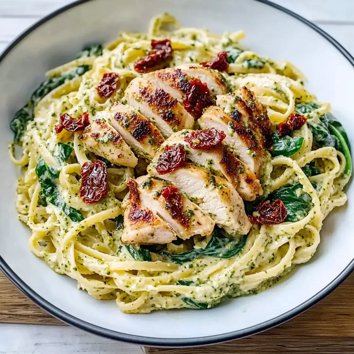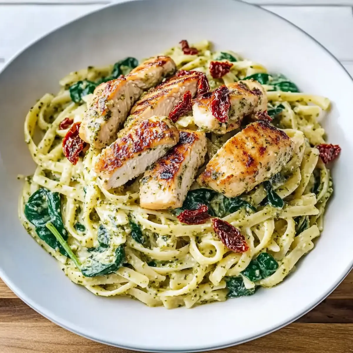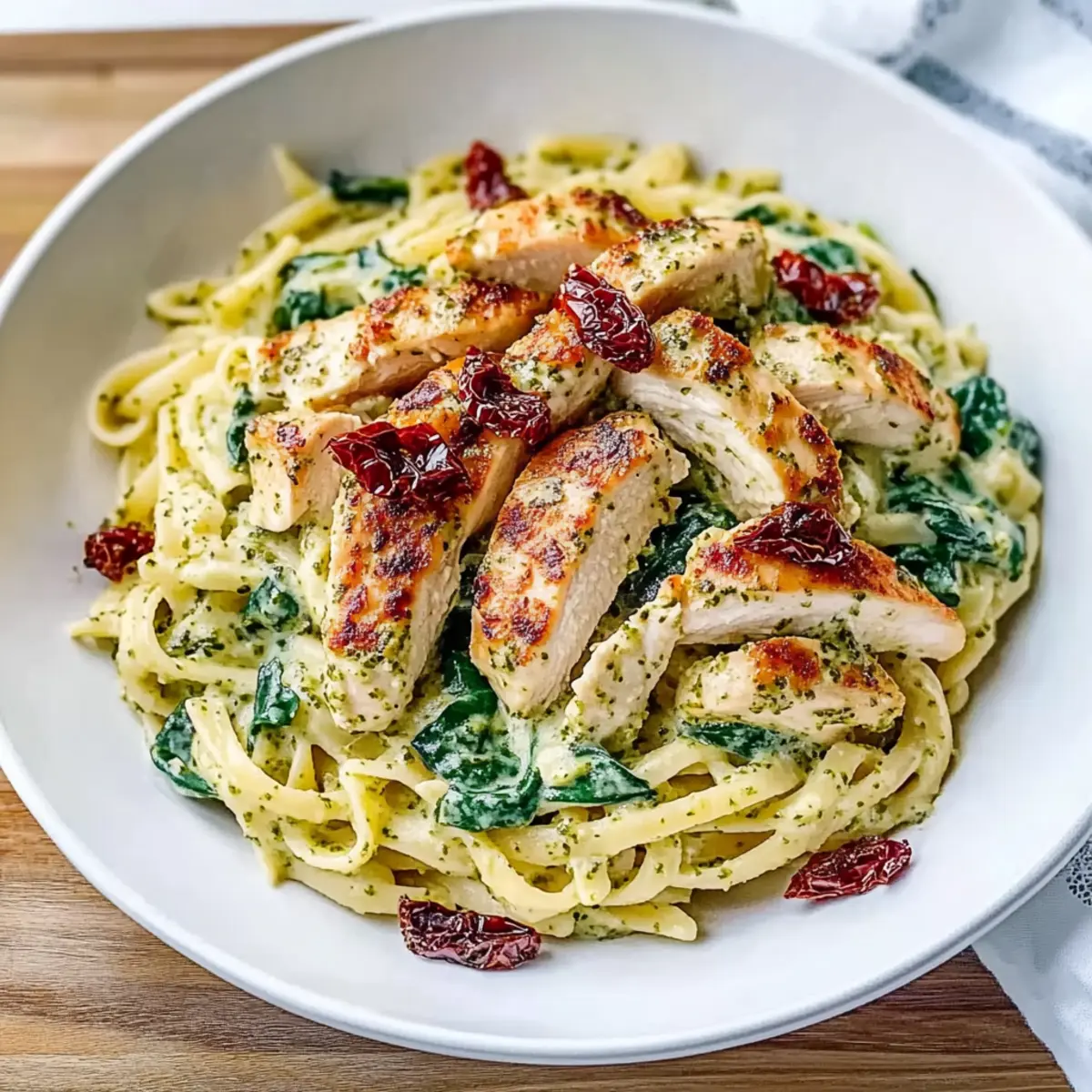 Jump to Recipe Print RecipeAs the pasta bubbles merrily in the pot, the kitchen fills with a symphony of sizzling sounds and enticing aromas. There’s nothing quite like whipping up a bowl of Simple Creamy Chicken Pesto Pasta with Spinach to soothe a busy day. This quick dinner recipe comes together in about 30 minutes, making it an impeccable choice for those weeknights when you crave something comforting yet fresh. With succulent pieces of chicken paired with a luscious pesto cream sauce, vibrant spinach, and sweet sun-dried tomatoes, you’re in for a delightful flavor experience. Trust me—this dish is not just family-friendly but also perfect for anyone looking to swap the fast food frenzy for a wholesome home-cooked meal. Are you ready to bring some Italian flair to your dinner table? Let’s dive into this delicious recipe! Why is this pasta dish so delightful? Quick and Easy: In just about 30 minutes, you’ll have a hearty meal on the table, making it perfect for those busy weeknights. Rich, Creamy Sauce: The pesto cream sauce is a game-changer, coating the pasta beautifully and mingling with sweet sun-dried tomatoes for added flavor. Family-Friendly: This dish is approachable and kid-approved, satisfying even the pickiest of eaters, making it a staple you’ll turn to again and again. Versatile Options: Feel free to switch out the chicken for shrimp or tofu, or even play around with different pasta shapes and greens, like adding kale for a nutritious twist! Healthy Ingredients: Packed with spinach and a boost from sun-dried tomatoes, this dish is not just delicious but also nourishing. Crowd-Pleaser: Serve it at family dinners or gatherings with friends—everyone will be going back for seconds. Pair it with a fresh side salad or garlic bread for a complete meal, and you might find yourself experimenting with other recipes like Oven Baked Chicken or Street Corn Pasta Salad to wow your guests! Simple Creamy Chicken Pesto Pasta with Spinach Ingredients For the Pasta Pasta – A short shape like penne or rotini works wonderfully for this dish. For the Chicken Chicken Breasts – This is your main protein; consider turkey or tofu as tasty substitutes. For the Seasoning Garlic Powder – A hint of aromatic flavor; opt for fresh garlic for an even bolder taste. Salt & Pepper – Essential seasonings to enhance all the flavors in your dish. For Cooking Olive Oil – Ideal for pan-searing chicken, adding richness; avocado oil is a great alternative. Butter – Adds creaminess to the sauce; use vegan butter for a dairy-free option. For the Sauce All-Purpose Flour – Thickens the sauce to create that luxurious creamy texture; gluten-free flour works too. Chicken Broth – Provides depth and flavor; swap it for vegetable broth for a vegetarian version. Heavy Cream – Key for richness in the sauce; half-and-half or plant-based cream can lighten things up. Pesto – The star of the sauce, giving it that delightful basil flavor—homemade or store-bought works fine. Lemon Juice – Brightens the dish and balances the creaminess; fresh lime juice could work in a pinch. Sun-Dried Tomatoes – These add sweetness and acidity; for a lighter touch, use fresh cherry tomatoes instead. Baby Spinach – Adds a pop of color and nutrition; kale can offer a different texture and taste. For the Finish Parmesan Cheese – Optional garnish for a nutty finish; sprinkle nutritional yeast for a dairy-free alternative. Let’s gather these ingredients and bring this Simple Creamy Chicken Pesto Pasta with Spinach to life, creating a heartwarming meal that will cheer up any busy weeknight! Step‑by‑Step Instructions for Simple Creamy Chicken Pesto Pasta with Spinach Step 1: Cook the Pasta Begin by bringing a large pot of salted water to a rolling boil. Add a short pasta shape like penne or rotini and cook according to package instructions until al dente, typically around 8-10 minutes. Once cooked, reserve half a cup of the starchy pasta water, and then drain the pasta in a colander, setting it aside while you prepare the rest of the dish. Step 2: Sauté the Chicken In a large skillet, heat 2 tablespoons of olive oil and 1 tablespoon of butter over medium heat. Season the sliced chicken breasts with garlic powder, salt, and pepper. Once the oil glistens, add the chicken to the skillet. Cook each side for about 5-6 minutes, until they’re golden brown and the internal temperature reaches 165°F. Remove the chicken from the skillet and set it aside to rest. Step 3: Prepare the Sauce Base In the same skillet, add 2 tablespoons of all-purpose flour to the drippings, stirring constantly for about 1 minute. Gradually pour in 1 cup of chicken broth while scraping the bottom of the pan to release the flavorful browned bits. Continue stirring until the mixture is well mixed and slightly thickened, around 2-3 minutes. This will be the flavorful base for your Simple Creamy Chicken Pesto Pasta with Spinach. Step 4: Create the Creamy Sauce After the sauce base has thickened, reduce the heat to low. Carefully stir in 1 cup of heavy cream, ½ cup of pesto, and the juice of half a lemon. Add in ½ cup of chopped sun-dried tomatoes. Allow the sauce to simmer gently for about 5 minutes, letting the flavors meld together while ensuring it doesn’t boil. Step 5: Add the Greens Once the sauce has thickened nicely, stir in 2 cups of fresh baby spinach. Cook for an additional 2-3 minutes or until the spinach wilts down completely. The vibrant green of the spinach adds both nutrition and color to your Simple Creamy Chicken Pesto Pasta, enhancing the overall dish. Step 6: Combine Pasta and Sauce Now, add the drained pasta to the skillet with the creamy sauce and spinach. Toss everything together until the pasta is well coated in the luscious sauce. If the sauce appears too thick, gradually incorporate the reserved pasta water, a few tablespoons at a time, until you reach your desired consistency. Step 7: Finish with Chicken Fina