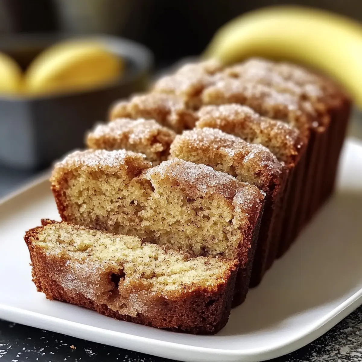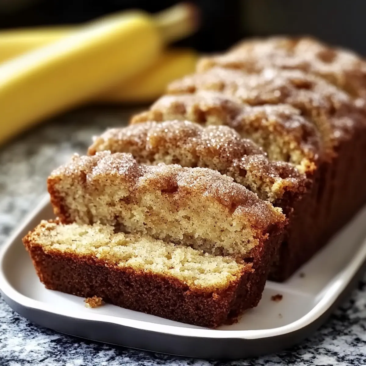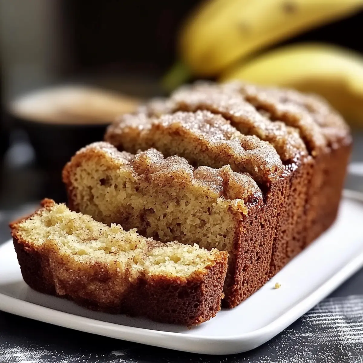 Jump to Recipe Print RecipeAs I stood in my kitchen, the scent of cinnamon and sugar wafting through the air, I realized I had just stumbled upon the perfect way to elevate my leftover bananas. Snickerdoodle Banana Bread is not just a solution for overripe fruits; it’s a delightful twist on a classic that combines the comforting essence of snickerdoodles with the moist, tender crumb of banana bread. This recipe stands out not only for its incredible flavor but also because it’s incredibly easy to whip up—ideal for busy mornings or cozy afternoon snacks. Plus, it’s versatile enough to accommodate various dietary needs, allowing for vegan and gluten-free adaptations. Are you ready to transform those ripe bananas into a warm loaf of happiness? Let’s get started! Why is this recipe a must-try? Irresistible Flavor: The fusion of cinnamon and sugar creates a sweet, comforting aroma that fills your kitchen, inviting everyone to gather around. Ease of Preparation: With simple ingredients and straightforward steps, you can whip up this delightful loaf in no time. Perfect for beginner bakers! Versatile Adaptations: Whether you’re vegan or gluten-free, this Snickerdoodle Banana Bread can be tailored to suit your dietary needs, ensuring everyone can enjoy a slice. Crowd-Pleasing Appeal: This bread is perfect for brunch, snacks, or dessert—it’s sure to be a hit with family and friends. Save Time: Bake in bulk and enjoy the deliciousness throughout the week, paired beautifully with your favorite coffee or tea. For more comforting ideas, check out my recipe for Garlic Naan Bread or try the delectable Banana Split Bars for a sweet treat! Snickerdoodle Banana Bread Ingredients For the Batter Ripe Bananas – Adds natural sweetness and moisture; opt for bananas with brown spots for the best flavor. All-Purpose Flour – Provides structure; can substitute with half whole wheat for a denser texture. Granulated Sugar – Sweetness component; can use honey or maple syrup for lighter sweetness. Brown Sugar – Enhances moisture and adds depth of flavor. Baking Soda – Leavening agent that helps the loaf rise and keeps it light. Salt – Balances sweetness and boosts overall flavor. Ground Cinnamon – Star flavor component that gives the bread its distinctive snickerdoodle essence. Eggs – Provides structure and moisture; can substitute with a flax egg (1 tbsp ground flaxseed + 3 tbsp water) for a vegan option. Butter – Adds richness; can substitute with a plant-based alternative for a dairy-free version. Milk – Moisture component; non-dairy alternatives like almond or oat milk can be used. For the Topping Sugar for Topping – Optional but recommended for added crunch and sweetness; enhances the delightful experience of your Snickerdoodle Banana Bread. Step‑by‑Step Instructions for Snickerdoodle Banana Bread Step 1: Preheat Oven Begin your cozy baking adventure by preheating your oven to 350°F (175°C). This temperature allows your Snickerdoodle Banana Bread to bake evenly, creating a golden crust that enhances its delicious flavor. Make sure to position your oven rack in the center for the best heat distribution. Step 2: Mash Bananas In a large mixing bowl, peel and add about 3 ripe bananas. Using a fork or a potato masher, mash them until smooth, leaving some small lumps for delightful texture. This step infuses the batter with natural sweetness and moisture, essential for your perfect Snickerdoodle Banana Bread. Step 3: Mix Wet Ingredients In a separate bowl, combine melted butter, two eggs, and ½ cup of milk. Whisk these ingredients together until well-blended and smooth. Gradually pour this mixture into the mashed bananas, stirring continuously until everything is nicely incorporated, creating a rich, creamy base for the bread. Step 4: Combine Dry Ingredients In another bowl, whisk together 1 ½ cups of all-purpose flour, 1 teaspoon of baking soda, ¼ teaspoon of salt, 1 tablespoon of ground cinnamon, ½ cup of granulated sugar, and ½ cup of brown sugar. Make sure the dry ingredients are evenly mixed, as this will ensure your Snickerdoodle Banana Bread rises perfectly and tastes divine. Step 5: Fold Mixtures Together Gently fold the dry ingredient mixture into the wet banana mixture using a spatula or a wooden spoon. Mix just until incorporated, being careful not to overmix, as this can lead to a dense loaf. The batter should be slightly lumpy, and that’s okay—this creates a tender texture in your Snickerdoodle Banana Bread. Step 6: Prepare Pan Take a 9×5-inch loaf pan and generously grease it with butter or non-stick spray. Pour the batter into the prepared pan and smooth the top with a spatula. This step helps ensure that your delightful Snickerdoodle Banana Bread releases easily after baking. Step 7: Add Topping To elevate your bread, mix a bit of granulated sugar with a teaspoon of ground cinnamon in a small bowl. Sprinkle this mixture generously over the top of your batter before it goes into the oven. This step adds a beautiful, crunchy topping that enhances both the flavor and presentation of your Snickerdoodle Banana Bread. Step 8: Bake Place the loaf pan in the preheated oven and bake for 50 to 60 minutes. To check for doneness, insert a toothpick into the center; it should come out clean or with a few moist crumbs. Once baked, the top will be golden brown and slightly domed, signaling perfection. Step 9: Cool Once baked, remove the Snickerdoodle Banana Bread from the oven and let it cool in the pan for about 10 minutes. After that, carefully transfer it to a wire rack to cool completely. This cooling process helps the flavors deepen and allows for easy slicing later on. What to Serve with Snickerdoodle Banana Bread Indulging in a slice of warm, sweet banana bread invites a cozy gathering around the table, filled with laughter and delightful flavors. Creamy Coffee: The mellow richness of a creamy cup of coffee beautifully complements the sweet cinnamon notes in 
