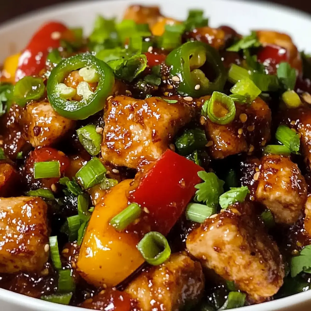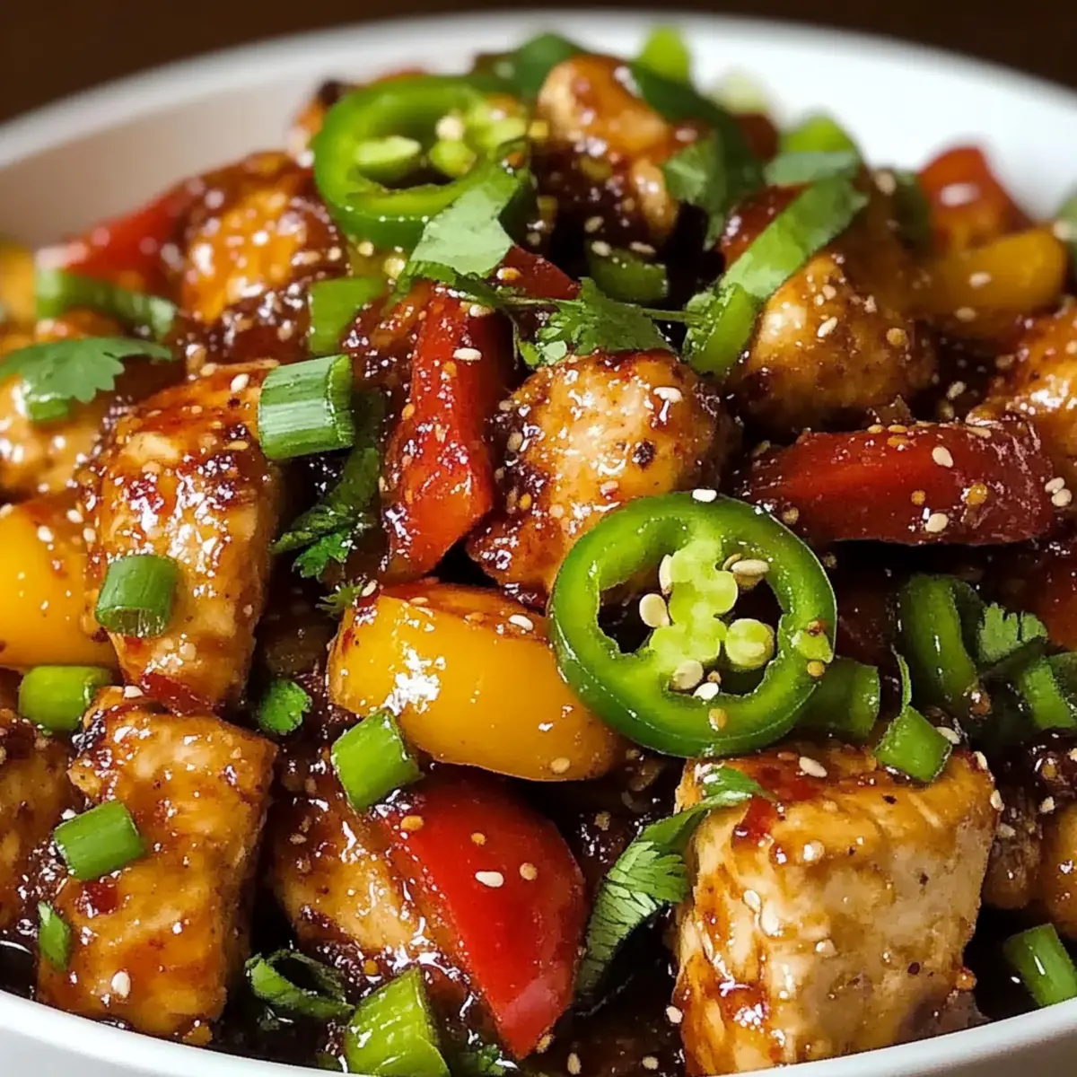 Jump to Recipe Print RecipeAs the aroma of sizzling chicken fills the kitchen, I can’t help but feel a surge of excitement. Tonight, I’m whipping up a Spicy Jalapeño Chicken Stir-Fry that’s ready in just 25 minutes, making it the perfect solution for busy weeknights. This dish combines tender chicken with colorful bell peppers, all enveloped in a bold, flavorful sauce that’s customizable to your taste. One of the best parts? It’s not just quick and easy; it’s also low in calories, so you can indulge without the guilt. Whether you prefer it fiery or with just a hint of heat, this stir-fry has you covered. Ready to bring vibrant flavors to your dinner table? Let’s dive into this delightful recipe! Why is this stir-fry a must-try? Speedy Preparation: Whip up this dish in just 25 minutes, making it perfect for those hectic weeknights. Flavor Explosion: The aromatic blend of jalapeños, soy sauce, and hoisin sauce creates a tantalizing taste that will excite your palate. Customizable Goodness: You can easily adjust the spice level or swap in your favorite vegetables, making it versatile for everyone. Nutrient-Dense Delight: With lean chicken and colorful veggies, you’ll enjoy a nutritious meal that’s low-calorie yet satisfying. Crowd-Pleaser: This stir-fry is a hit at family dinners or casual gatherings—everyone will rave about it! Don’t forget to check out my tips on how to store leftovers so you can savor this dish again! Spicy Jalapeño Chicken Stir-Fry Ingredients • Get ready to spice things up! For the Chicken Boneless, Skinless Chicken Breast – This lean protein forms the base of your stir-fry; chicken thighs can be used for a richer flavor. For the Veggies Bell Peppers (Red, Yellow, Green) – Adds sweetness and crunch; feel free to swap with zucchini or snap peas for a different twist. Minced Garlic – Infuses the dish with aromatic depth; use garlic powder as a quick substitute if needed. Fresh Jalapeño – Provides extra heat; remove seeds for a milder kick. Chopped Green Onions – Adds fresh flavor and a pop of color; chives can be used instead. Fresh Cilantro – Enhances the freshness; omit if you’re not a fan of cilantro. For the Sauces Olive Oil – Perfect for sautéing and adding depth; sesame oil will give an Asian flair to the dish. Soy Sauce – This brings umami and saltiness; opt for tamari if you’re looking for a gluten-free version. Hoisin Sauce – Adds a sweet complexity; teriyaki sauce works as a substitute if needed. Sriracha – Introduces some serious heat; adjust according to your spice preference. Step‑by‑Step Instructions for Spicy Jalapeño Chicken Stir-Fry Step 1: Heat the Pan Begin by pouring 2 tablespoons of olive oil into a large skillet or wok over medium-high heat. Allow the oil to heat until it shimmers, signaling it’s ready for cooking. This usually takes about 1-2 minutes. Ensure you don’t let it smoke, which can indicate it’s too hot. Step 2: Cook the Chicken Add bite-sized pieces of boneless, skinless chicken breast to the hot skillet. Season the chicken with salt and pepper, then sauté for 5-7 minutes, turning frequently. Cook until the chicken is golden brown and no longer pink in the center, achieving that perfect tender texture for your Spicy Jalapeño Chicken Stir-Fry. Step 3: Introduce the Vegetables Once the chicken is cooked through, stir in the chopped bell peppers and minced garlic. Sauté these for about 3-4 minutes, allowing the peppers to soften slightly while retaining a satisfying crunch. The vibrant colors will blossom in the pan, making the dish visually appealing. Step 4: Add the Sauces Pour in the soy sauce, hoisin sauce, and sriracha into the skillet, stirring everything together to ensure each piece is well coated. Continue to cook for another 2-3 minutes, allowing the sauce to heat through and slightly thicken, creating a glossy finish for your Spicy Jalapeño Chicken Stir-Fry. Step 5: Garnish and Serve Remove the skillet from heat, and top your stir-fry with fresh jalapeño slices, chopped green onions, and cilantro for a refreshing burst of flavor. Serve immediately for the best taste, either over fluffy steamed rice or noodles to make it a comforting meal. Spicy Jalapeño Chicken Stir-Fry Variations Feel free to get creative and make this spicy stir-fry your own with these fun ideas! Dairy-Free: Swap regular soy sauce for a tamari option to make this dish gluten-free while keeping it dairy-free. Paleo-Friendly: Use coconut aminos instead of soy sauce and add additional vegetables like cauliflower rice for a satisfying, grain-free meal. Vegetarian: Substitute chicken with firm tofu or tempeh; both will absorb the lovely flavors of the sauce beautifully. Extra Crunch: Toss in some cashews or peanuts at the end for an added layer of crunch and nutty flavor that complements the stir-fry. Sauce Variations: Replace hoisin sauce with teriyaki sauce or sweet chili sauce for a different flavor profile that still brings sweetness to the dish. Herb Boost: Add fresh basil along with cilantro for a fresh, aromatic twist that enhances the flavors of the stir-fry. Heat Adjustments: If you’re not too keen on spicy food, use bell peppers and a touch of smoked paprika instead of jalapeños for a milder taste. Umami Punch: Incorporate mushrooms for an earthy flavor and satisfying texture. Varieties like shiitake or portobello work especially well in stir-fry! If you’re looking for more flavor inspirations, consider adding a quick pickled cucumber salad for a refreshing contrast or trying a sweet-and-sour twist with additional pineapple. Whatever your choice, this stir-fry is a canvas for delicious possibilities! Expert Tips for Spicy Jalapeño Chicken Stir-Fry Perfectly Cooked Chicken: Ensure chicken is evenly browned but avoid overcooking. This keeps the meat juicy and tender, making your Spicy Jalapeño Chicken Stir-Fry irresistible. Crisp Veggies: Add firmer vegetables like broccoli or snap 