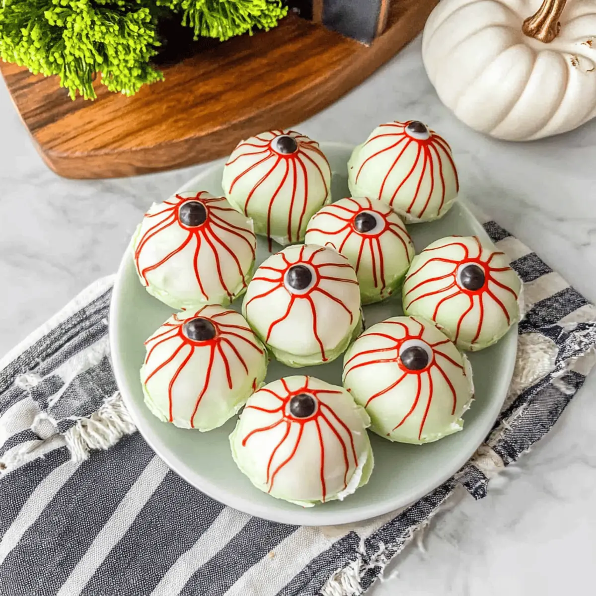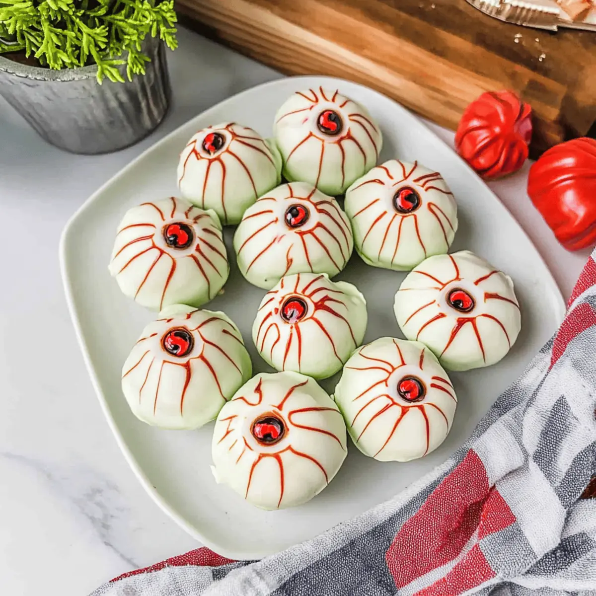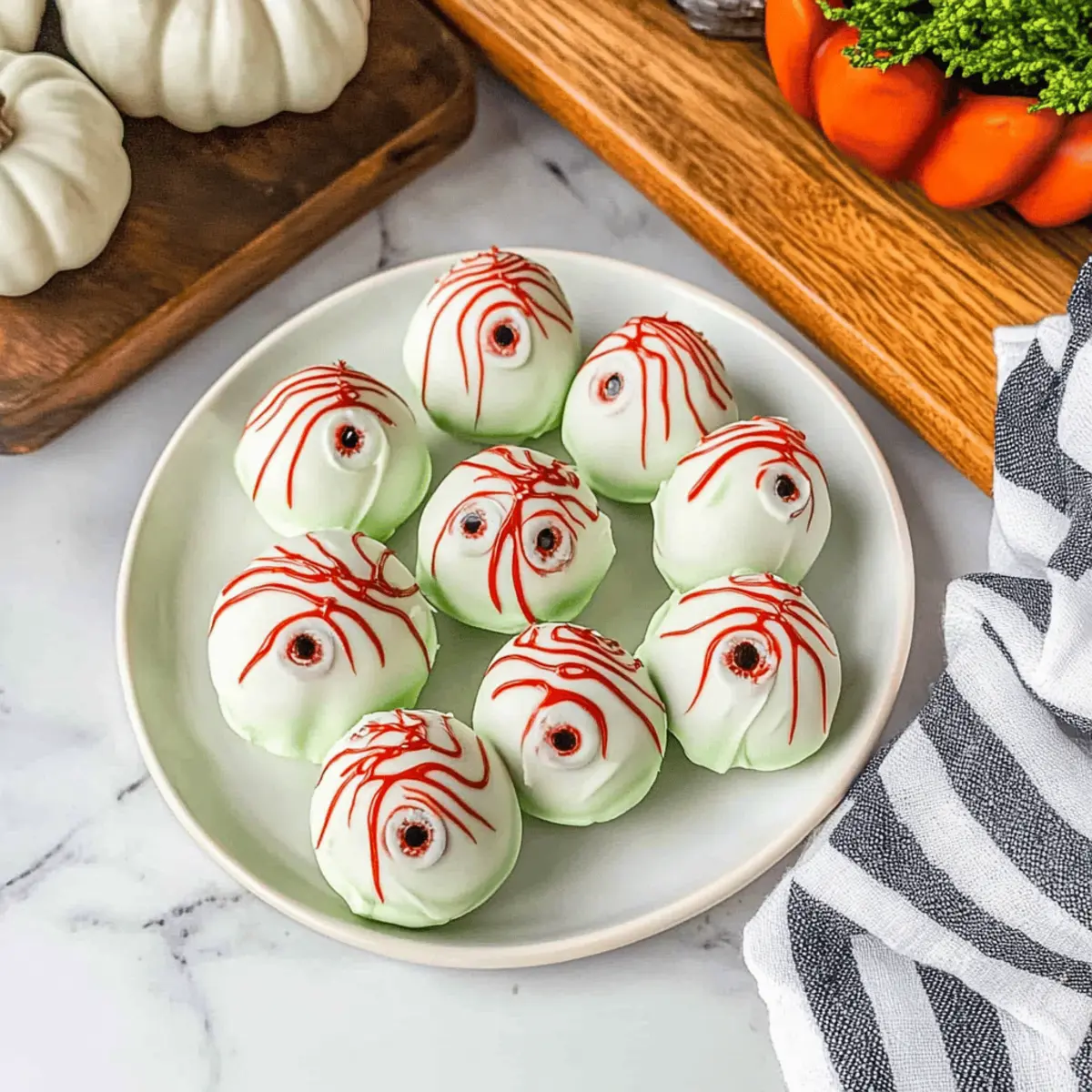 Jump to Recipe Print RecipeAs I was rummaging through my pantry for something to whip up for our Halloween gathering, I stumbled upon a treasure trove of ingredients just waiting to be transformed. Enter my Spooky Eyeball Truffles, a delightful no-bake creation bursting with sweet fun that both kids and adults will adore! Not only are these creepy treats easy to throw together, but they also invite little hands into the kitchen for some festive family bonding. With their playful design and sweet, creamy flavor, these truffles will surely become the highlight of your spooky celebrations. Ready to turn some ordinary ingredients into a frightfully fun confection? Let’s dive in! Why Are These Eyeball Truffles Special? Delightfully Interactive: These Spooky Eyeball Truffles are a great way to involve kids in the kitchen, creating a memorable cooking experience. No-Bake Convenience: With no baking required, these treats save you time while still impressing everyone at your spooky gathering. Eye-Catching Presentation: The creepy design not only looks fantastic but is sure to spark conversations among guests! Customizable Fun: Easily switch out flavors and colors, allowing for personalized designs that suit your Halloween theme. Consider experimenting with other kid-friendly recipes for more festive ideas! Sweet Satisfaction: The creamy, sweet filling combined with a crunchy exterior highlights a flavor explosion that guests of all ages will relish. Spooky Eyeball Truffles Ingredients Let’s gather everything you’ll need for these delightfully creepy treats! For the Truffles Vanilla Oreos – Provides a sweet, cookie-based foundation, but chocolate sandwich cookies can add a twist. Cream Cheese – Crucial for a smooth and creamy texture; try reduced-fat cream cheese if you want a lighter option. Green Food Coloring – Just a few drops create a ghoulish hue; adjust the amount for a lighter or darker green! For the Coating Vanilla Almond Bark – This sweet coating gives the truffles their signature look; feel free to swap it for chocolate melts for a richer flavor. Red Candy Melts – Perfect for creating spooky vein details; melted dark chocolate works as an excellent alternative! For Decoration Candy Eyeballs – They provide the final creepy touch; if you can’t find them, get creative with other themed candies you love! Now, let’s uncover the magic of crafting your own Spooky Eyeball Truffles in the kitchen together! Step‑by‑Step Instructions for Spooky Eyeball Truffles Step 1: Crush the Cookies Begin by placing 13 ounces of vanilla Oreos into a sturdy ziplock bag or food processor. Crush them until they become fine crumbs, resembling sand, which should take about 2-3 minutes. This crumbly base is essential for your Spooky Eyeball Truffles, so aim for a uniform texture. Transfer the crumbs to a large mixing bowl, ready for the next step. Step 2: Mix in the Cream Cheese To your Oreo crumbs, add 8 ounces of softened cream cheese. Using a hand mixer, blend the mixture on medium speed until it becomes smooth and well combined, taking about 2-3 minutes. The texture should resemble a thick, green cookie dough. This creamy base will help shape your truffles, making them delicious and easy to mold. Step 3: Add the Color Now, it’s time to bring your truffles to life! Incorporate about 10 drops of green food coloring into the mixture and stir until you achieve your desired shade of spooky green. Depending on your preference, you can add more or fewer drops. The color should be vivid and playful, enhancing the Halloween aesthetic of your Spooky Eyeball Truffles. Step 4: Form the Truffles Using your hands, scoop about 1.5 tablespoons of the mixture and roll it into balls. Place each truffle onto a parchment-lined baking sheet, ensuring they are spaced evenly apart. You should create around 20-24 truffles in total. Once formed, the truffles will be cute and round, perfect for the next spooky step! Step 5: Freeze the Truffles To help the truffles maintain their shape during dipping, place the baking sheet in the freezer for about 1 hour. This step is crucial and allows the truffles to solidify, making them easier to coat later. After freezing, they should feel firm to the touch and be ready for a delicious coating of chocolate. Step 6: Melt the Coatings As the truffles freeze, melt 24 ounces of vanilla almond bark and ½ cup of red candy melts in separate microwave-safe bowls. Heat in 30-second intervals, stirring in between, until fully melted and smooth, which usually takes about 1-2 minutes. Make sure each coating is glossy and free of lumps, ready to bring your Spooky Eyeball Truffles to life! Step 7: Coat the Truffles Using two forks, dip each frozen truffle into the melted almond bark, ensuring an even coat. Allow any excess chocolate to drip off before placing them back on the parchment-lined tray. This step transforms your truffles into glorious, eyeball-like treats, so take your time to cover them completely while the coating is still warm. Step 8: Create the Veins Once all truffles are dipped and on the tray, grab a toothpick and dip it into the red candy melts. Carefully draw vein lines on each truffle’s surface, leaving space in the center for the candy eyeballs. This detail adds to the spooky effect, making your Spooky Eyeball Truffles look both creepy and captivating! Step 9: Attach the Candy Eyes While the coating is still wet, gently press a candy eyeball onto the center of each truffle. The chocolate will help the eyes adhere perfectly. Take a moment to align them neatly and make sure they stand out. Watch as your truffles come alive, each one looking like a genuine spooky eyeball, ready for Halloween fun. Step 10: Let Them Set Finally, let the truffles sit at room temperature for about 5 minutes to allow the coating to harden. Once set, they’ll have a nice glossy finish and will be ready to devour. Arrange your delightful and spooky creations on a platter, and get read