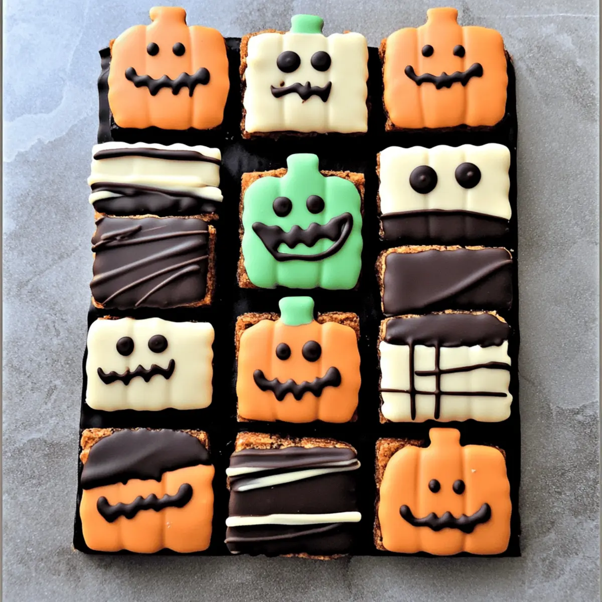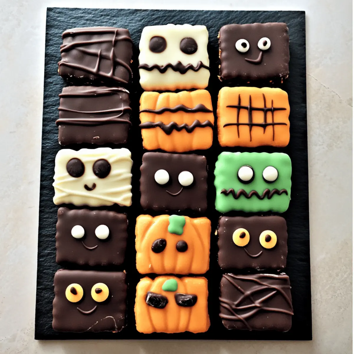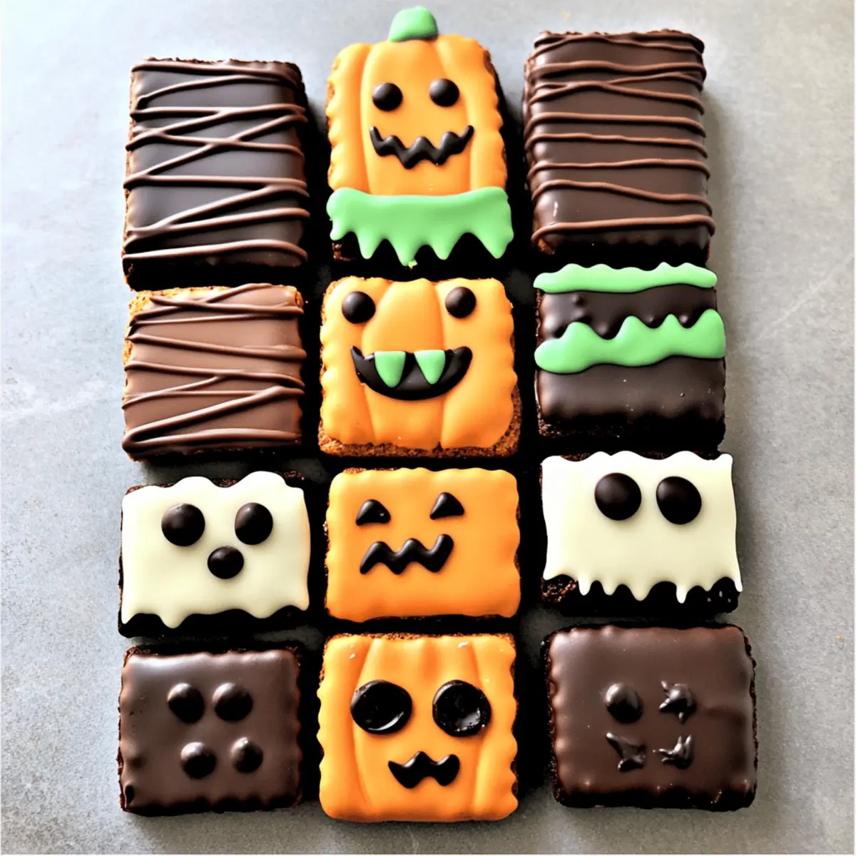 Jump to Recipe Print RecipeA faint giggle echoes through the kitchen as I stir a pot of melted chocolate, excitement bubbling in the air. This Halloween, I’m swapping traditional treats for something much cuter: Spooky Graham Crackers! These fun Halloween treats transform ordinary graham crackers into delightful character creations like Black Cats, Frankenstein, and Mummies, all covered in rich, chocolatey goodness. Not only are they fun to make and decorate, but they’re also quick and perfect for kids of all ages, making them a fantastic choice for family gatherings or classroom parties. Plus, they’re gluten-free, so everyone can join in on the fun! Are you ready to bring some holiday cheer with these adorable snacks that are sure to elicit smiles instead of scares? Let’s dive into the recipe together! Why are Spooky Graham Crackers a must-try? Delightfully Fun: These Spooky Graham Crackers transform a simple snack into a whimsical Halloween treat that kids and adults will adore. Creative Expression: With designs like Black Cats and Mummies, everyone can unleash their inner artist, making this perfect for family gatherings or classroom activities. Quick and Easy: Even beginner bakers will find joy in this recipe, as it’s simple to whip up and requires no complicated techniques. Gluten-Free Options: By using gluten-free graham crackers, these treats are inclusive, ensuring that everyone can indulge in the seasonal fun. Perfect for Sharing: These charming snacks are ideal for care packages or Halloween parties, inviting friends and family to enjoy a bite of creativity! Spooky Graham Crackers Ingredients For the Cracker Base • Graham Crackers – Essential for forming the spooky characters; opt for gluten-free ones to accommodate dietary needs. For the Chocolate Coatings • Dark Melting Chocolate – Provides a rich and decadent flavor; can be swapped for milk chocolate for a sweeter touch. • White Melting Chocolate – Perfect for coating and decoration; consider using white chocolate chips as an alternative. • Candy Coloring – Key for achieving vibrant Halloween colors in your designs; avoid regular food coloring, as it can seize the chocolate. For Character Decorations • Mini Chocolate Chips – Great for adding texture and as spooky eyes on your creative characters. • Candy Eyes – Vital for bringing your ghosts, mummies, and pumpkins to life with personality and charm. Get ready to bring some festive fun into your kitchen this Halloween season with these Spooky Graham Crackers! Step‑by‑Step Instructions for Spooky Graham Crackers Step 1: Prepare the Work Area Begin by gathering all your ingredients and equipment to make the Spooky Graham Crackers. Line a baking pan with wax or parchment paper to catch any chocolate drips. Make sure your work surface is clean and organized, so you can easily access everything as you create your spooky characters. Step 2: Melt Chocolates In separate microwave-safe bowls, add your dark melting chocolate and white melting chocolate. Heat them in the microwave in 30-second intervals, stirring in between until completely melted and smooth—this should take about 1 to 2 minutes. Keep an eye on the chocolate to prevent overheating, which can change its texture. Step 3: Create Character Coatings – Black Cat and Frankenstein Start by dipping each graham cracker into the melted dark chocolate to create a Black Cat. Make sure to coat each cracker evenly, then place it on the lined baking pan. For Frankenstein, dip another cracker in melted green chocolate, using a spoon to create a smooth layer. Add candy eyes and pipe dark chocolate features like a mouth to complete the spooky look. Step 4: Create Character Coatings – Ghost and Mummy Next, coat a graham cracker in melted white chocolate to design a Ghost. Once covered, add mini chocolate chips for eyes and pipe on a small mouth with melted dark chocolate. For the Mummy, dip another cracker in the white chocolate, then place candy eyes on top and drizzle more white chocolate in zig-zags across the surface for that fun, bandaged effect. Step 5: Create Character Coatings – Pumpkin For the Pumpkin character, melt orange chocolate and coat a graham cracker thoroughly. After that, use dark chocolate to draw eyes and a mouth, then add green chocolate leaves at the top for a final, whimsical touch. Make sure each decoration is distinct to bring your spooky characters to life! Step 6: Chill Once all your Spooky Graham Crackers are decorated, carefully place the baking pan into the refrigerator. Chill the characters for about 5-10 minutes, allowing the chocolate coating to set properly. This step helps ensure that all your decorations stay intact and makes the process easier for any additional touches you may want to add. Step 7: Final Touches After the chilling period, remove the graham crackers from the refrigerator and allow them to come to room temperature for a few minutes. This will make any final decoration easier, such as adding more details with melted chocolate or colored sprinkles. Get creative and make adjustments to ensure your Spooky Graham Crackers are ready to impress! Spooky Graham Crackers Variations & Substitutions Feel free to get creative and personalize your Spooky Graham Crackers with these delightful variations! Gluten-Free: Use gluten-free graham crackers so everyone can indulge in your festive treats without worry. They’ll taste just as delicious! Chocolate Swap: Experiment with different chocolates like white, milk, or even butterscotch melting wafers for unique flavor sensations. The sweet variety can surprise and delight your taste buds! Colorful Characters: Incorporate candy melts in various colors to create vibrant designs for holidays beyond Halloween. Think pastel colors for spring or red and green for Christmas – let your imagination roam! Fruity Fun: Add fresh fruit decorations such as thinly sliced strawberries or bananas to give your spooky charac