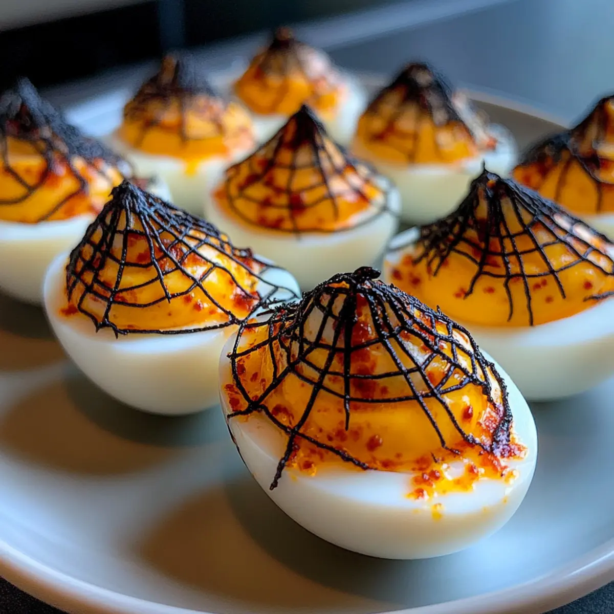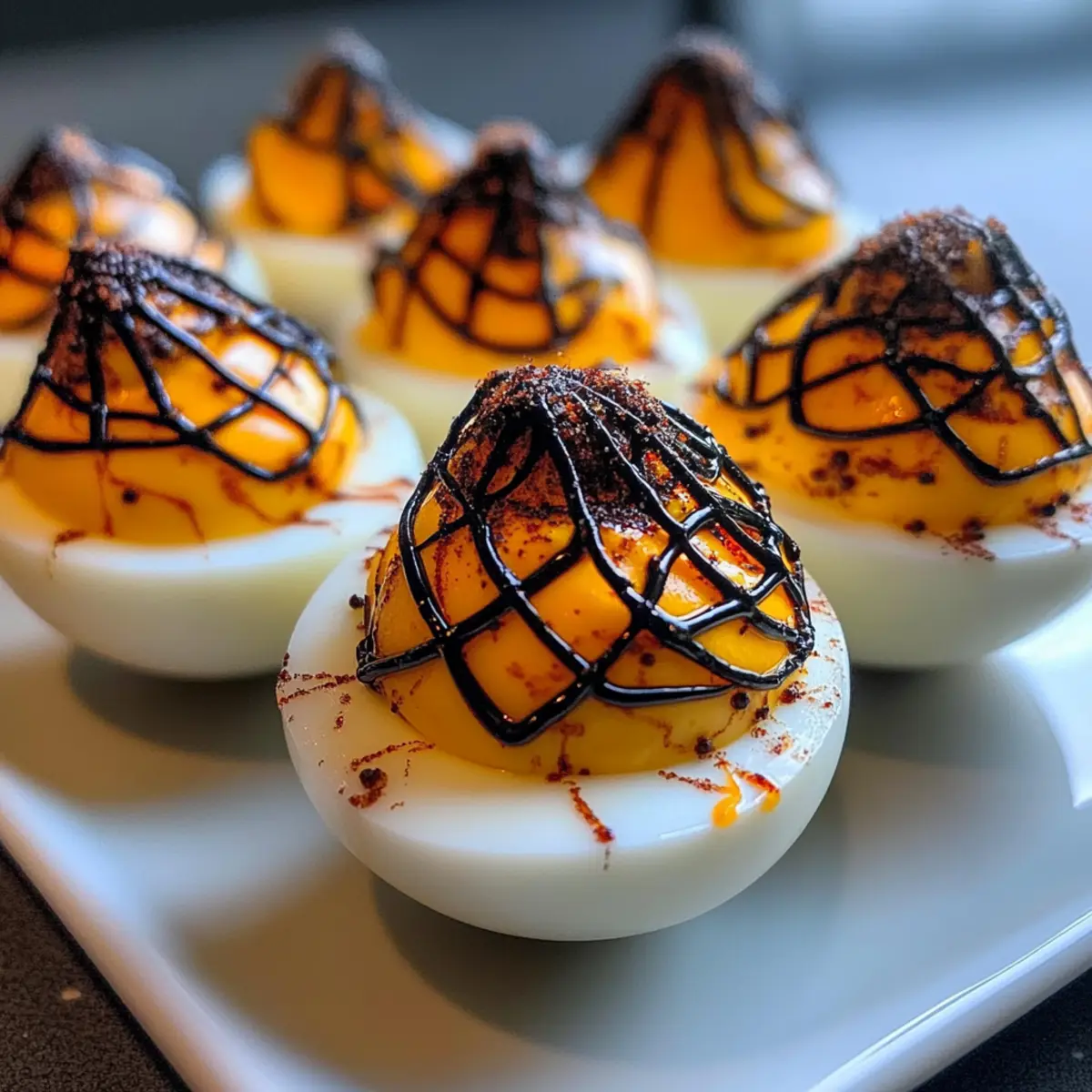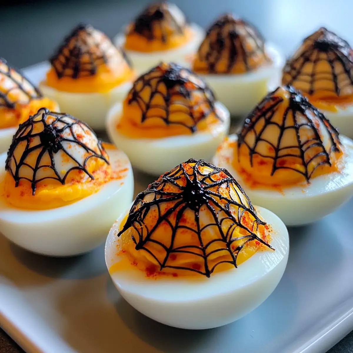 Jump to Recipe Print RecipeAs I rummaged through my refrigerator, a burst of inspiration struck me: Halloween was right around the corner! These Spooky Spiderweb Deviled Eggs are a playful twist on the classic appetizer, sure to captivate your guests at any festive gathering. Imagine serving up these eerie, black-veined beauties, featuring a creamy yolk filling that’s both tangy and irresistible. Not only are they a low-carb and gluten-free delight, but they’re also incredibly easy to prepare, allowing you to whip them up ahead of time for a stress-free celebration. Whether you’re planning a spooky soirée or simply looking to impress, these delectable deviled eggs are the perfect trick to treat your loved ones this season. Are you ready to make your Halloween gathering unforgettable? Why Are These Deviled Eggs Spooky? Visual Appeal: The striking spiderweb design on these deviled eggs creates an eye-catching centerpiece that will wow your guests at any Halloween gathering. Creamy Filling: With a tangy yolk mixture enhanced by Dijon mustard and apple cider vinegar, each bite is deliciously satisfying. Versatile Recipe: Feel free to experiment with colors; try orange for a pumpkin twist or add edible flower petals for an elegant touch. Make-Ahead Convenience: Prepare these tasty treats in advance for stress-free entertaining, so you can focus on enjoying the festivities. Diet-Friendly: These deviled eggs are not only low-carb and gluten-free but also cater to vegetarian diets, making them a great option for diverse gatherings. Spooky Spiderweb Deviled Eggs Ingredients For the Eggs • Eggs – Use large hard-boiled eggs for the best results. • Water – Necessary for the soaking solution to create the spiderweb effect. For the Spiderweb Effect • Black Food Coloring Gel – Provides a deep, rich color for the spiderweb design; opt for gel over liquid for best results. • White Vinegar – Helps set the black coloring during rinsing, ensuring a clean appearance. For the Filling • Mayonnaise – Adds creaminess to the yolk mixture; substitute with avocado for a lower-fat option. • Dijon Mustard – Enhances the filling’s tanginess; yellow mustard can be swapped in for a milder flavor. • Apple Cider Vinegar – Brightens the yolk filling; regular vinegar works in a pinch. • Kosher Salt – Elevates flavor and texture; kosher is preferred for its coarseness. • Black Pepper – Freshly ground gives the best flavor and a bit of heat. For the Garnish • Smoked Paprika – Dust over the eggs for added flavor and a pop of color; regular paprika can be used as a substitute. • Black Sesame Seeds – Perfect for crunch and decoration; optional but adds a nice touch. • Chives – Adds color and a fresh taste; green onions can be used as a replacement. Each of these ingredients contributes to the delicious, festive nature of the Spooky Spiderweb Deviled Eggs, making them a fantastic treat for Halloween that your guests will adore! Step‑by‑Step Instructions for Spooky Spiderweb Deviled Eggs Step 1: Prepare Eggs Begin by gently cracking the cooled hard-boiled eggs, ensuring the shells are cleanly fractured. In a bowl, combine water with black food coloring gel—enough to fully submerge the eggs. Soak the cracked eggs in this solution for at least 3 hours or preferably overnight. This will create the spooky spiderweb effect on the egg whites. Step 2: Rinse Eggs Once the eggs have soaked, carefully remove them from the coloring solution and rinse them under cool running water. Add a splash of white vinegar during rinsing to set the color, ensuring the spiderweb design appears vivid and clean. Pat the eggs dry with a paper towel before peeling them to reveal your beautifully colored egg whites. Step 3: Mix Filling Slice the peeled eggs in half lengthwise and gently scoop the yolks into a mixing bowl. Using a fork, mash the yolks until smooth, then add in mayonnaise, Dijon mustard, apple cider vinegar, kosher salt, and black pepper. Mix thoroughly until the filling is creamy and well combined, ensuring a delightful tang that complements the Spooky Spiderweb Deviled Eggs. Step 4: Color Yolks (optional) For an extra festive flair, consider blending in a drop of green or purple food coloring into the yolk mixture. This step adds a fun surprise element to your filling as you prepare your Spooky Spiderweb Deviled Eggs. Stir the coloring in until you reach your desired shade, creating a more striking contrast with the egg whites. Step 5: Fill Egg Whites Now it’s time to bring the deviled eggs together! Spoon or pipe the creamy yolk mixture back into the hollowed egg whites, filling them generously. Using a piping bag can create a neat and professional look for your Spooky Spiderweb Deviled Eggs. Aim for a slightly domed filling, making them an attractive centerpiece for your Halloween platter. Step 6: Garnish To finish, dust your filled Spooky Spiderweb Deviled Eggs with smoked paprika for a touch of color and flavor. Optionally, sprinkle black sesame seeds or chopped chives over the top for added crunch and visual appeal. Chill the eggs in the refrigerator until you’re ready to serve, allowing the flavors to meld, and enjoy this festive treat with friends and family. Make Ahead Options These Spooky Spiderweb Deviled Eggs are perfect for meal prep and can save you time on the day of your gathering! You can soak the hard-boiled eggs in the black food coloring solution up to 24 hours in advance to create that eerie spiderweb effect. Additionally, you can prepare the yolk filling and refrigerate it separately for up to 3 days. When you’re ready to assemble, simply fill the egg whites with the prepared yolk mixture, garnish with smoked paprika, and chill until serving. This way, your deviled eggs will be just as delightful and spooky, allowing you more time to enjoy the festivities with your guests! Spooky Spiderweb Deviled Eggs Variations Feel free to unleash your creativity and m