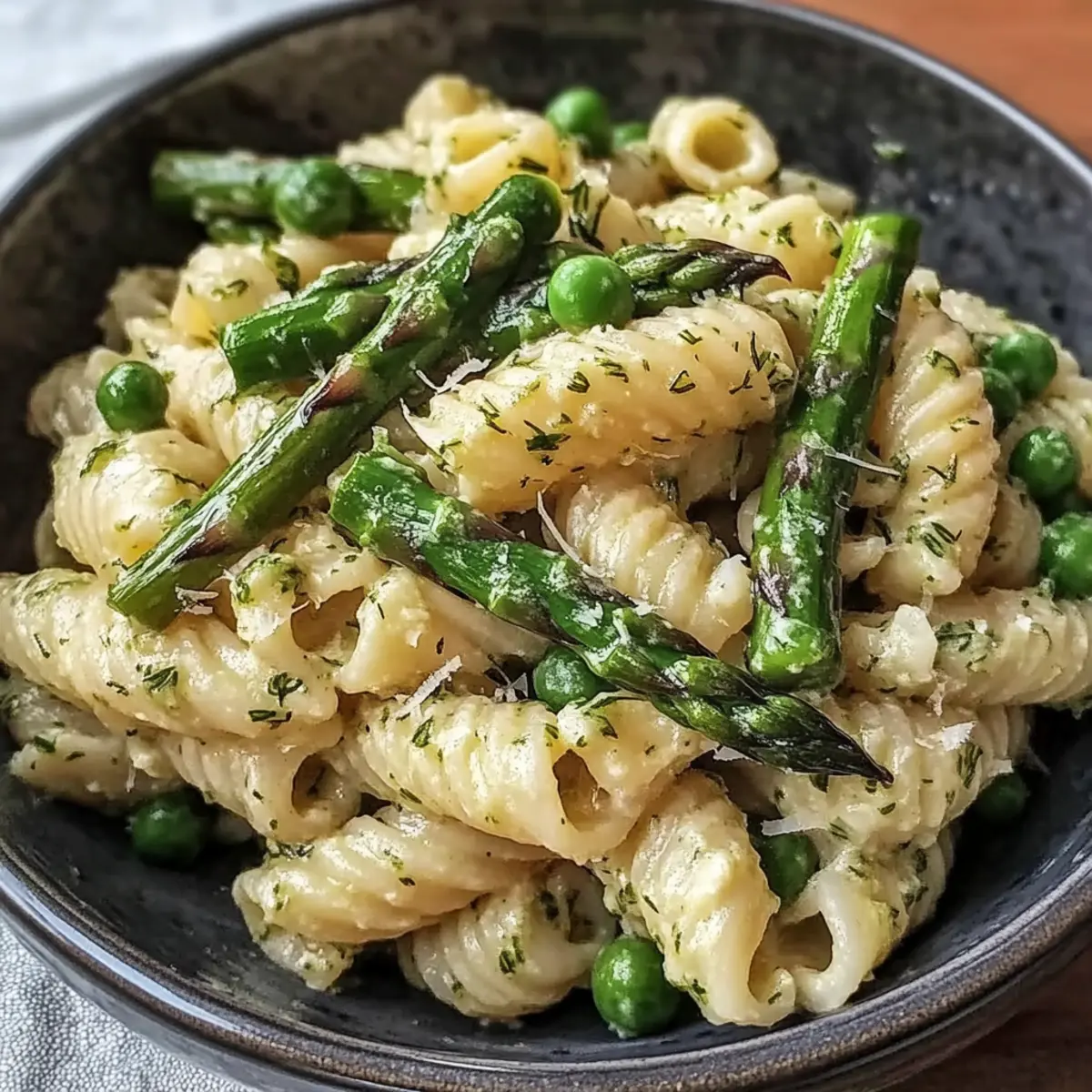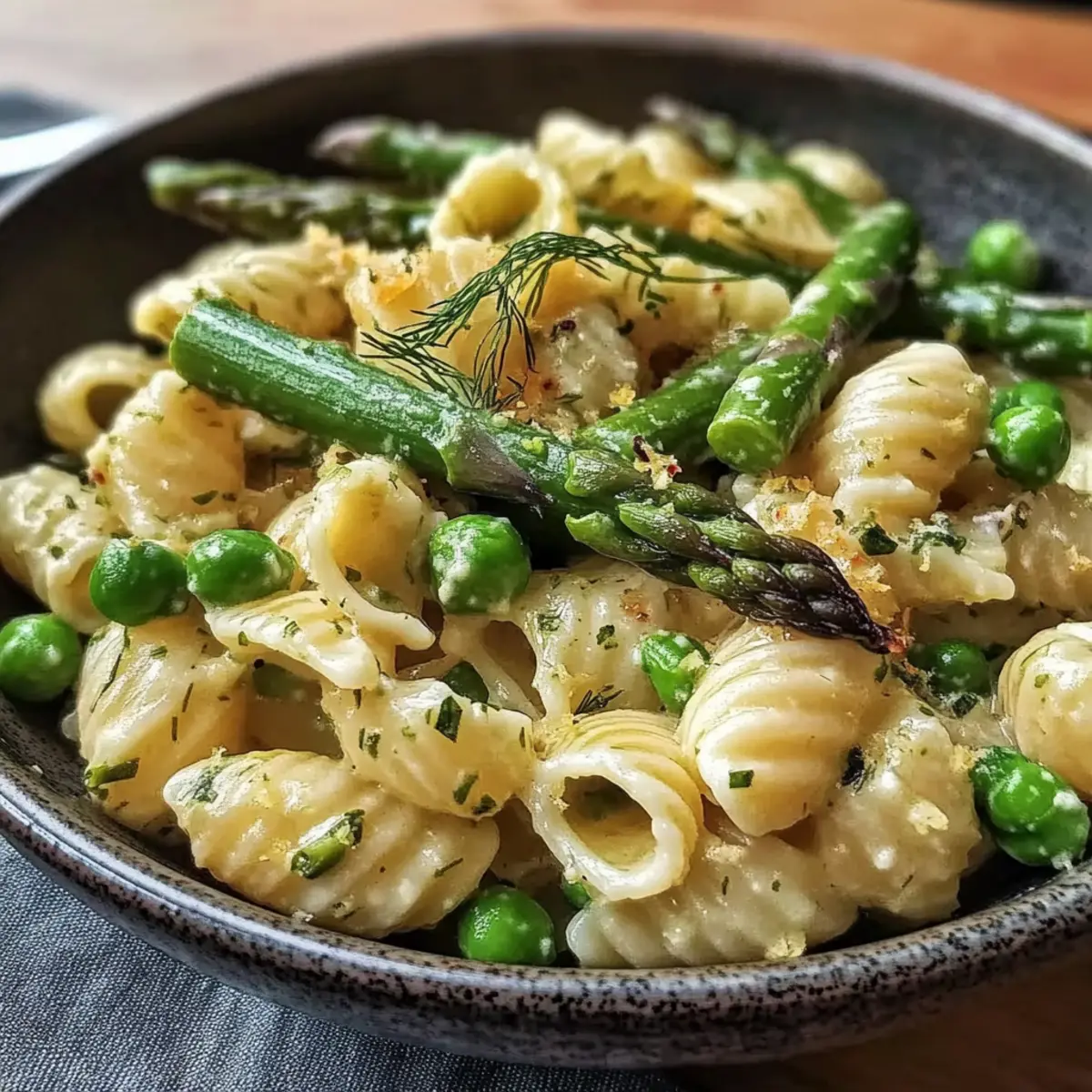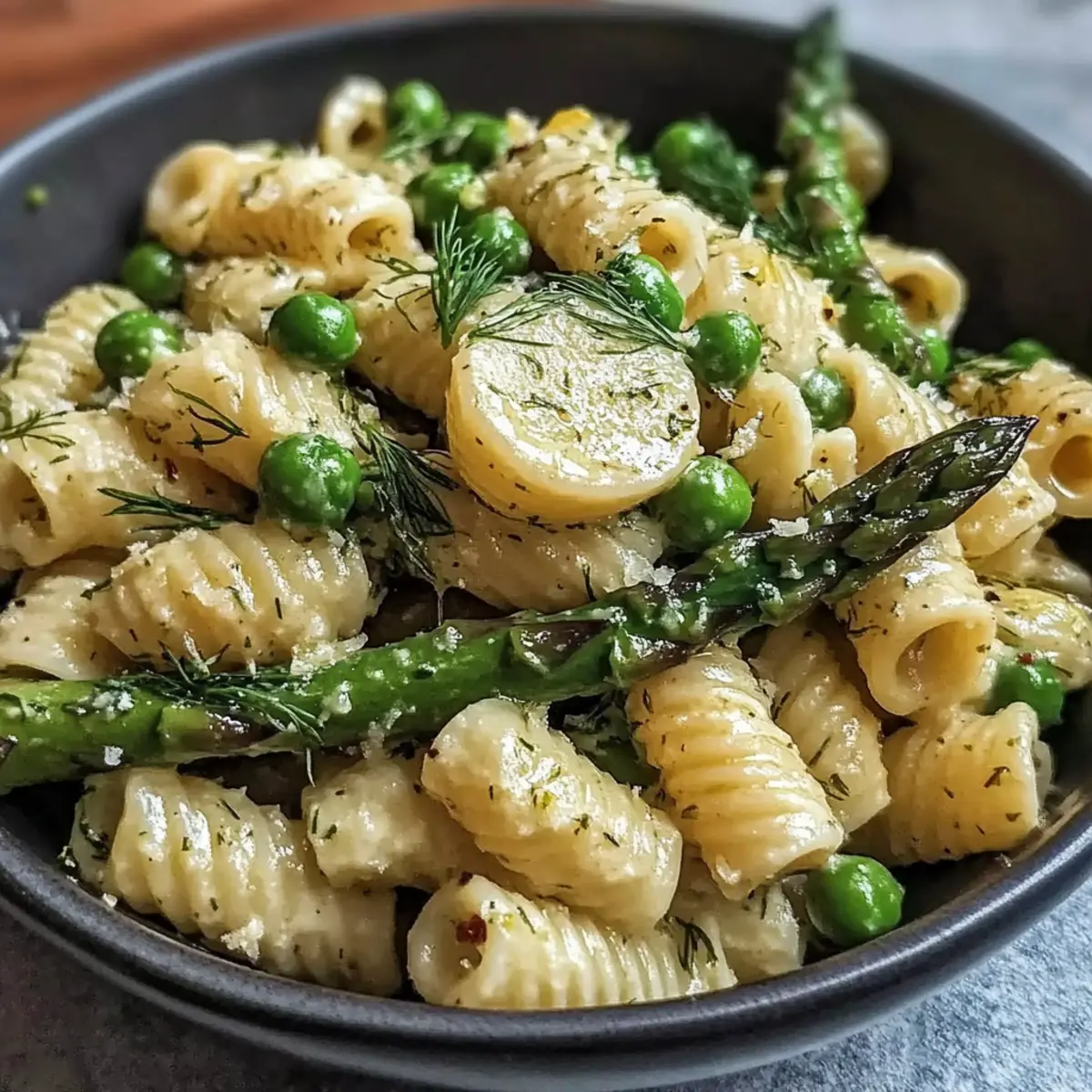 Jump to Recipe Print RecipeAs I stood in my kitchen, the aroma of fresh dill and lemon wafted through the air, instantly transporting me to a sunlit picnic on a spring afternoon. This Fresh Spring Pasta Salad with Asparagus and Lemon Dill Vinaigrette is more than just a dish; it’s a celebration of the season’s vibrant produce. With its quick prep time and refreshing flavors, it’s perfect as a light main course or a delightful side at gatherings. Imagine crunchy asparagus and sweet peas mingling in a tangy vinaigrette—this salad offers both health and deliciousness in every bite. Whether you’re serving it chilled at a potluck or as a cozy dinner companion, you’ll find it’s a crowd-pleaser that leaves everyone satisfied. Are you ready to savor the taste of spring? Why Is This Spring Pasta Salad Perfect? Fresh Ingredients: Bursting with seasonal flavors, this salad features tender asparagus and sweet peas, ensuring each bite is a taste of springtime. Quick & Easy: With just a handful of ingredients, this recipe is designed for busy home cooks who want a delicious meal without the fuss. Customizable: Feel free to add proteins like grilled chicken or chickpeas for a filling option, or toss in some crumbled feta for an extra creamy touch. Health-Conscious Delight: With its nutrient-rich ingredients and gluten-free options, this pasta salad is perfect for anyone looking to eat lighter, letting you indulge guilt-free. Crowd-Winning Flavor: Whether served at a picnic, BBQ, or as a light dinner, this salad suits any occasion. Pair it with a lovely Chickpea Salad with Grilled Vegetables or a refreshing Waldorf Salad Greek for an impressive spread! Spring Pasta Salad Ingredients • Explore the vibrant components that make this dish shine! For the Pasta Pasta (12 ounces) – The foundation of your salad; choose gluten-free pasta for a delightful alternative. For the Vegetables Asparagus (450 grams) – Adds both crunch and color; fresh is best, but frozen can work in a pinch. Peas (1 cup) – Sweet and vibrant; substitute with blanched green beans for a flavorful twist. For the Vinaigrette Olive Oil (1/3 cup) – Provides a silky texture and richness; opt for extra-virgin for the best flavor. Lemon Juice (2 tablespoons) – Supplies bright acidity; adjust to suit your taste preferences. Fresh Dill (3 tablespoons) – Key for that fresh flavor; dried dill can be a suitable substitute, just use less. Seasoning Salt (1 teaspoon) – Elevates the overall taste; feel free to adjust as needed. Pepper (1 teaspoon) – Adds a gentle warmth and depth; freshly cracked black pepper is recommended for optimal flavor. Step‑by‑Step Instructions for Fresh Spring Pasta Salad with Asparagus and Lemon Dill Vinaigrette Step 1: Cook the Pasta Begin by bringing a large pot of salted water to a rolling boil. Add 12 ounces of your chosen pasta and cook according to the package directions until al dente, about 8-10 minutes. Once cooked, drain the pasta in a colander and immediately rinse it under cold water to halt the cooking process and prevent sticking. Step 2: Blanch the Asparagus In the same pot, bring fresh water to a boil again, adding in 450 grams of trimmed asparagus. Blanch the asparagus for 2-3 minutes until it is bright green and tender-crisp. Once ready, quickly transfer the asparagus to a bowl of ice water for a couple of minutes to stop the cooking and preserve its vibrant color. Step 3: Prepare the Vinaigrette In a medium-sized mixing bowl, combine 1/3 cup of extra-virgin olive oil, 2 tablespoons of freshly squeezed lemon juice, 3 tablespoons of chopped fresh dill, and 1 teaspoon each of salt and freshly cracked pepper. Whisk the ingredients together until they emulsify into a silky dressing that will bring the spring pasta salad to life. Step 4: Combine the Ingredients In a large mixing bowl, add the cooled pasta, blanched asparagus, and 1 cup of sweet peas. If you’d like to customize even further, consider adding extra veggies or proteins at this stage. Toss gently to combine all the ingredients, ensuring even distribution of textures and flavors throughout the spring pasta salad. Step 5: Dress the Salad Drizzle the prepared lemon dill vinaigrette over the pasta, asparagus, and peas mixture. Using a large spoon or tongs, toss everything together until each piece is well-coated with the dressing. This will integrate the citrusy flavors evenly and enhance the fresh taste of spring. Step 6: Let It Rest Allow the tossed spring pasta salad to rest for at least 10 minutes at room temperature. This resting period enhances the flavor melding, giving time for the vinaigrette to soak into the ingredients. If making ahead, store it in the refrigerator, but keep the dressing separate, adding it just before serving for optimal texture. What to Serve with Fresh Spring Pasta Salad with Asparagus and Lemon Dill Vinaigrette Pair your delightful spring dish with complementary sides and drinks for a well-rounded meal experience. Grilled Chicken Skewers: Juicy and slightly smoky, they add a flavorful protein boost that pairs well with the salad’s lightness. Roasted Vegetables: Varieties like carrots and bell peppers provide sweetness and earthy tones, balancing the bright flavors of the pasta salad. Crusty Artisan Bread: The crunchy exterior and fluffy inside create a perfect companion for scooping up that zesty vinaigrette. Chilled White Wine: A crisp Sauvignon Blanc accentuates the fresh ingredients, making every bite of your pasta salad feel even more special. Citrusy Fruit Salad: A refreshing mix of oranges, grapes, and mint can cleanse the palate while echoing the bright lemon notes in the salad. Cheesy Garlic Breadsticks: Warm and gooey, these offer a comforting heartiness that contrasts beautifully with the salad’s freshness. Don’t forget to share! Lemon Sorbet: For dessert, this light and refreshing treat echoes the tang of the vinaigrette, providing a sweet, citrus finish after your meal. E
