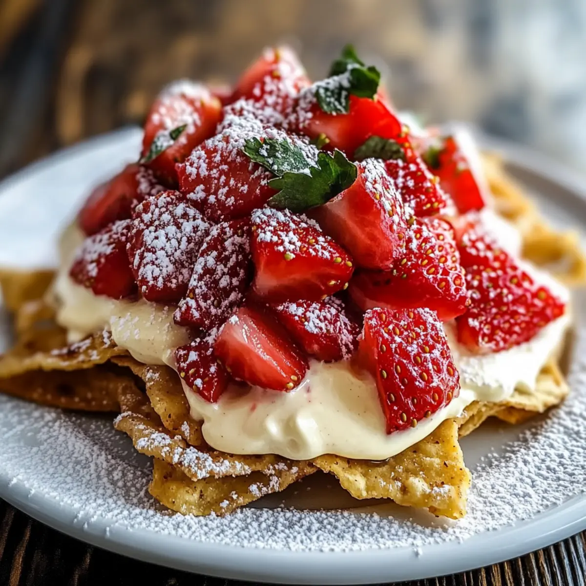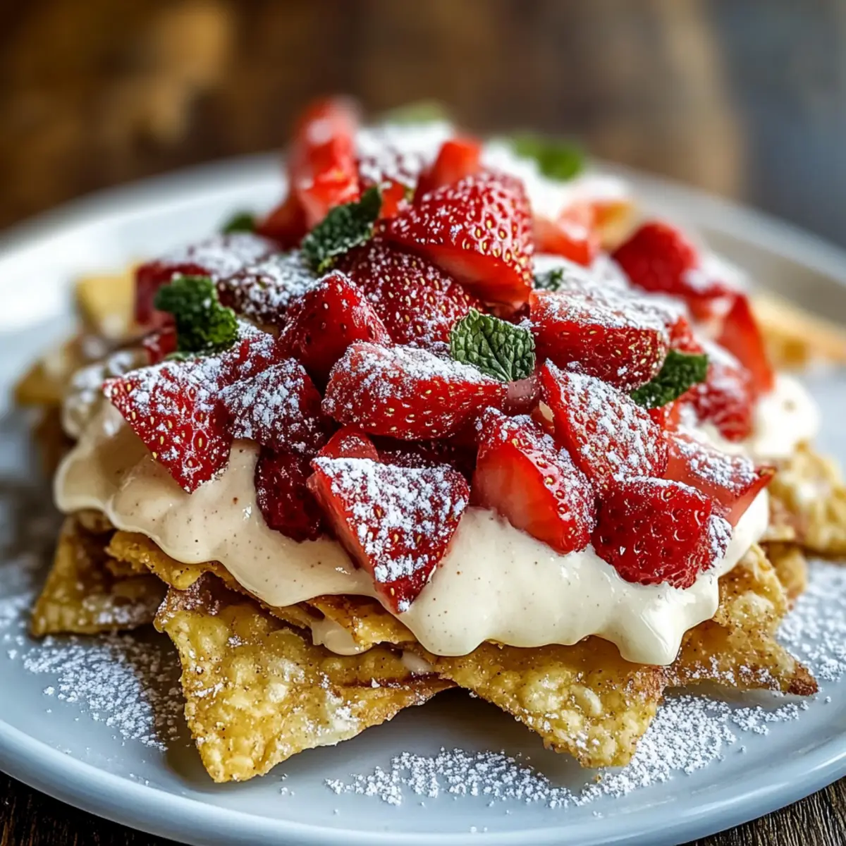 Jump to Recipe Print RecipeThe kitchen can be a delightful playground, especially when you’ve got just 30 minutes to whip up something extraordinary! Enter my Strawberry Cheesecake Nachos—a fun and vibrant twist on a classic favorite. This recipe combines crispy cinnamon-sugar tortilla chips with a luscious cream cheese filling, topped with juicy strawberries that add a burst of sweetness. With customizable toppings, these nachos are not just visually stunning but also adaptable for any crowd, making them perfect for everything from casual get-togethers to cozy family nights. Plus, they can easily be made gluten-free with a simple tortilla swap, opening the door for everyone to enjoy. So, are you ready to turn dessert into an interactive experience? Let’s dive into this delicious adventure together! Why are Strawberry Cheesecake Nachos a Must-Try? Delightful flavors come together in this fun dessert, making it a definite crowd-pleaser! Quick and easy, you can whip up these nachos in just 30 minutes without any complicated steps. Versatile toppings allow you to customize based on your guests’ preferences—try mixing in blueberries or bananas for a unique twist. Gluten-free options are available by swapping in gluten-free tortillas, ensuring everyone can join the fun. Enjoy them at parties, or as a cozy night treat, and savor the happiness they bring! For more delicious ideas, check out my Cucumber Strawberry Salad or consider a refreshing Strawberry Icebox Cake. Strawberry Cheesecake Nachos Ingredients For the Chips • Flour Tortillas – These serve as the delicious base for your nachos; swap with gluten-free tortillas for a gluten-free option. • Butter – Adds rich flavor and helps the cinnamon-sugar adhere; consider using margarine or a plant-based butter for dairy-free variations. • Cinnamon and Sugar Mixture – This is essential for a sweet, flavorful crunch; feel free to adjust the ratio to your taste preferences. For the Cheesecake Filling • Cream Cheese – Provides the creamy texture of a classic cheesecake; Greek yogurt or vegan cream cheese can be lighter alternatives. • Powdered Sugar – Sweetens the filling to perfection; use less for a lower sugar content without sacrificing flavor. • Vanilla Extract – Enhances the overall flavor; imitation vanilla works in a pinch if you’re out of the real stuff. • Heavy Cream – Contributes to the silky, fluffy filling; coconut cream is a great choice for a dairy-free option. For the Topping • Fresh Strawberries – Offers a refreshing burst of sweetness; you can also use blueberries or banana slices based on your personal preference. • Lemon Juice – Brightens the strawberry flavor and balances sweetness; lime juice can be substituted if you prefer. This blend of ingredients creates a delightful plate of Strawberry Cheesecake Nachos that’s not only visually stunning but undeniably delicious! Step‑by‑Step Instructions for Strawberry Cheesecake Nachos Step 1: Preheat the Oven Begin by preheating your oven to 375°F (190°C). This ensures that your chips will bake evenly, turning golden and crispy. While the oven warms up, prepare your tortillas and gather your ingredients for the Strawberry Cheesecake Nachos, setting the stage for a delightful dessert experience. Step 2: Prepare the Tortillas Melt a couple of tablespoons of butter in the microwave or on the stove. Once melted, use a pastry brush to coat one side of each flour tortilla generously with butter. This is key for that rich flavor and helping the cinnamon-sugar mixture stick to your tortilla bases as we assemble the nachos. Step 3: Add Cinnamon-Sugar In a small bowl, mix together cinnamon and sugar to taste. Sprinkle this mixture over the buttered side of the tortillas, ensuring an even coating for maximum flavor. This step is vital for giving that sweet crunch to your Strawberry Cheesecake Nachos, making them irresistibly tempting. Step 4: Cut and Arrange With a sharp knife or a pizza cutter, slice the coated tortillas into triangle shapes to mimic classic nacho chips. Then, arrange them on a parchment-lined baking sheet, ensuring they have enough space to crisp up perfectly. The parchment will prevent sticking and make cleanup a breeze. Step 5: Bake for Crunchiness Place the baking sheet in the preheated oven and bake the tortilla chips for 8-10 minutes. Keep a close eye on them, looking for a golden-brown color and a crispy texture. Once they reach the desired doneness, remove them from the oven and allow them to cool completely so they maintain their crunch. Step 6: Make the Cheesecake Filling In a mixing bowl, beat softened cream cheese until it becomes smooth and creamy. Gradually add powdered sugar and a splash of vanilla extract, mixing until harmonious. This cheesecake filling will be the star of your Strawberry Cheesecake Nachos, so ensure it’s well combined and rich in flavor. Step 7: Whip the Cream Pour the heavy cream into the cream cheese mixture. Use an electric mixer to beat until fluffy and light, achieving a creamy, decadent texture for your cheesecake filling. This whipped cream element adds an airy quality, making the nachos indulgently delightful, perfect as a sweet topping. Step 8: Prepare the Strawberry Topping Chop fresh strawberries and place them in a bowl. Sprinkle a bit of sugar and drizzle with lemon juice to brighten up their flavors. Allow the strawberries to sit for 10-15 minutes, letting them release their juices, creating a deliciously sweet topping for your Strawberry Cheesecake Nachos. Step 9: Assemble the Nachos Time to build your Strawberry Cheesecake Nachos! Start by layering your crispy tortilla chips on a serving platter. Spoon generous dollops of the creamy cheesecake filling over the chips, followed by a handful of the juicy strawberry mixture. The contrast of textures will make this dessert truly captivating. Step 10: Garnish and Serve Finish off the nachos with a light dusting of powdered sugar