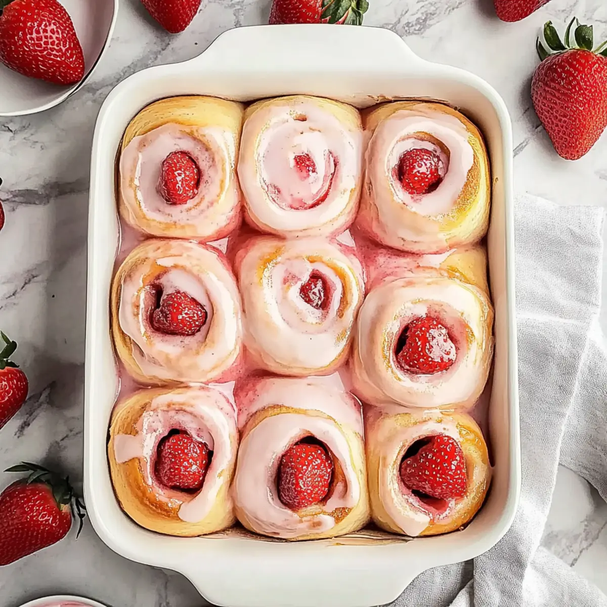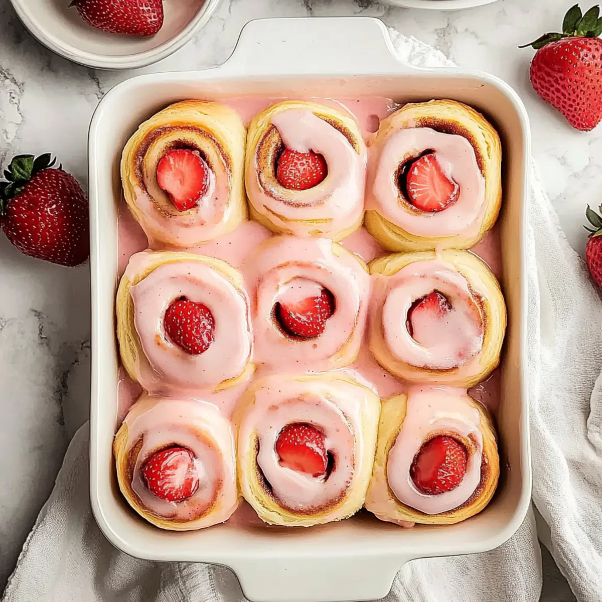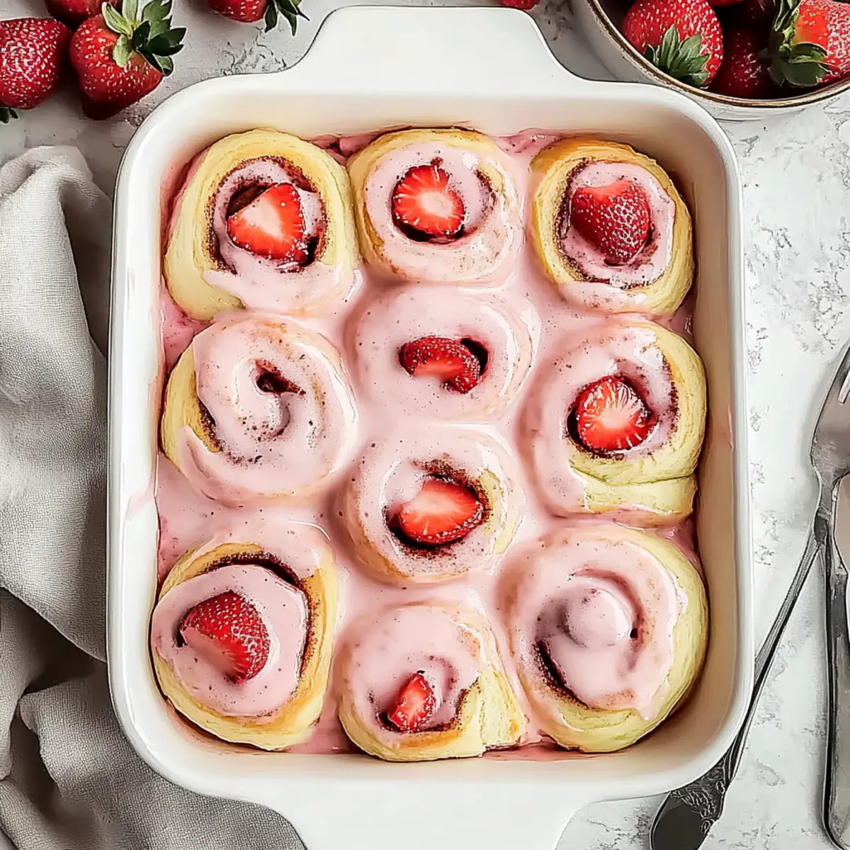 Jump to Recipe Print RecipeAs the aroma of freshly baked bread wafts through my kitchen, I can’t help but feel that familiar warmth tugging at my heart. There’s something utterly magical about these Ultimate Strawberry Cinnamon Rolls. They’re a stunning medley of soft brioche dough and lively strawberry filling, all drizzled with creamy, tangy cream cheese glaze. This recipe not only brings joy through its irresistible sweetness, but it’s also a fantastic comfort food option that’s perfect for any occasion. Whether you’re treating yourself on a cozy morning or impressing guests at brunch, these rolls are an impressive crowd-pleaser. Did I mention they’re easy to make and can even be prepped ahead of time? What’s your favorite way to savor these delightful treats: warm from the oven or with a drizzle of glaze that takes each bite to the next level? Why are Strawberry Cinnamon Rolls irresistible? Irresistible Warmth: These rolls are perfect for cozy mornings, filling your kitchen with delightful aromas. Decadent Flavor: The combination of sweet, fresh strawberries and creamy glaze is a match made in heaven. Quick and Simple: With straightforward steps, you’ll have homemade comfort food without the fuss. Adaptable Options: Whether you use fresh or frozen strawberries, this recipe accommodates your needs effortlessly. Make-Ahead Magic: Prepare them the night before and enjoy warm, fresh rolls in the morning! For more inspiring recipes, check out Raspberry Cinnamon Rolls for another twist on this classic! Strawberry Cinnamon Rolls Ingredients For the Dough • Warm Milk – Essential for activating yeast; use 1 cup of warm (not hot) milk to keep the yeast happy. • Instant Dry Yeast – Quick-rising leavening agent; can substitute with active dry yeast if rehydrated first. • All-Purpose Flour – Provides the structure; measure accurately for best results—4 ¼ cups is recommended. • Granulated Sugar – Sweetens both dough and filling; use ⅓ cup in the dough for balance. • Salt – Enhances overall flavor; 1 teaspoon is essential for the dough. • Egg – Adds richness; make sure it’s at room temperature for even mixing. • Unsalted Butter – Adds tenderness; use ⅓ cup softened for the dough and 3 tablespoons for the glaze. For the Filling • Fresh or Frozen Strawberries – The star of your filling; use 1 ¾ cups fresh or unthawed frozen (cook longer if using frozen). • Lemon Juice – Brightens the flavor; juice from half a lemon is just right. For the Glaze • Cream Cheese – Base of your creamy glaze; ½ cup softened will create a smooth texture. • Powdered Sugar – Sweetens and thickens the glaze; ½ cup ensures a perfect creamy finish without grittiness. • Vanilla Extract – Adds depth; 1 teaspoon is ideal for flavor enhancement. • Strawberry Puree – For added glaze flavor; use 2 tablespoons of cooled puree from your filling. These Strawberry Cinnamon Rolls are a delightful blend of softness and flavor, bringing the comfort of homemade baking right into your home. Enjoy the process and the delicious results! Step‑by‑Step Instructions for Strawberry Cinnamon Rolls Step 1: Prepare Strawberry Filling In a medium saucepan over medium heat, combine 1 ¾ cups of sliced fresh or frozen strawberries with the juice of half a lemon and ¼ cup granulated sugar. Stir continuously until the strawberries break down and the mixture thickens, about 10-15 minutes. Once thickened, blend until smooth and allow to cool while you prepare the brioche dough for your Strawberry Cinnamon Rolls. Step 2: Make Brioche Dough In a stand mixer bowl, whisk together 4 ¼ cups of all-purpose flour, ⅓ cup granulated sugar, 1 teaspoon salt, and 1 packet of instant dry yeast. Pour in 1 cup of warm milk, ⅓ cup softened unsalted butter, and 1 room temperature egg. Mix on low speed until combined, then knead the dough for 5-7 minutes until smooth and elastic. This fragrant dough will become the base of your delicious Strawberry Cinnamon Rolls. Step 3: First Rise Transfer the kneaded brioche dough to a lightly greased bowl, cover it with a damp cloth, and place it in a warm area to rise. Allow it to double in size, which should take approximately 1.5 to 2 hours. You’ll know it’s ready when it has visibly puffed up and feels airy to the touch, promising a light and fluffy texture for your rolls. Step 4: Roll Out Dough Punch down the risen dough to release air, then turn it out onto a floured surface. Roll the dough into a large rectangle, roughly 16×12 inches. Spread the cooled strawberry filling evenly over the surface, ensuring to cover it all the way to the edges. Roll the dough tightly from one long side, forming a log, and seal the edges to keep the filling inside your Strawberry Cinnamon Rolls. Step 5: Cut Rolls Using a sharp knife or unflavored dental floss, slice the rolled dough into 12 equal pieces, each about 1.5 inches wide. Place the rolls in a greased 9×13-inch baking dish, leaving space between them as they will rise again. Cover the dish with a cloth and let the rolls rise for another 30-60 minutes, or until they are noticeably puffy. Step 6: Bake Preheat your oven to 350°F (180°C). Once the rolls have completed their second rise, place the baking dish in the oven and bake for 20-25 minutes, or until they are golden brown and the tops are slightly firm to the touch. The aroma of Strawberry Cinnamon Rolls baking will fill your kitchen, creating a warm atmosphere that’s simply irresistible. Step 7: Make Glaze While the rolls are baking, prepare the cream cheese glaze. In a mixing bowl, beat together ½ cup softened cream cheese, 3 tablespoons softened unsalted butter, ½ cup powdered sugar, 1 teaspoon vanilla extract, and 2 tablespoons of cooled strawberry puree until the mixture is smooth and creamy. This glaze will add a delightful sweetness to your warm rolls. Step 8: Glaze and Serve Once the Strawberry Cinnamon Rolls are out of the oven, allo