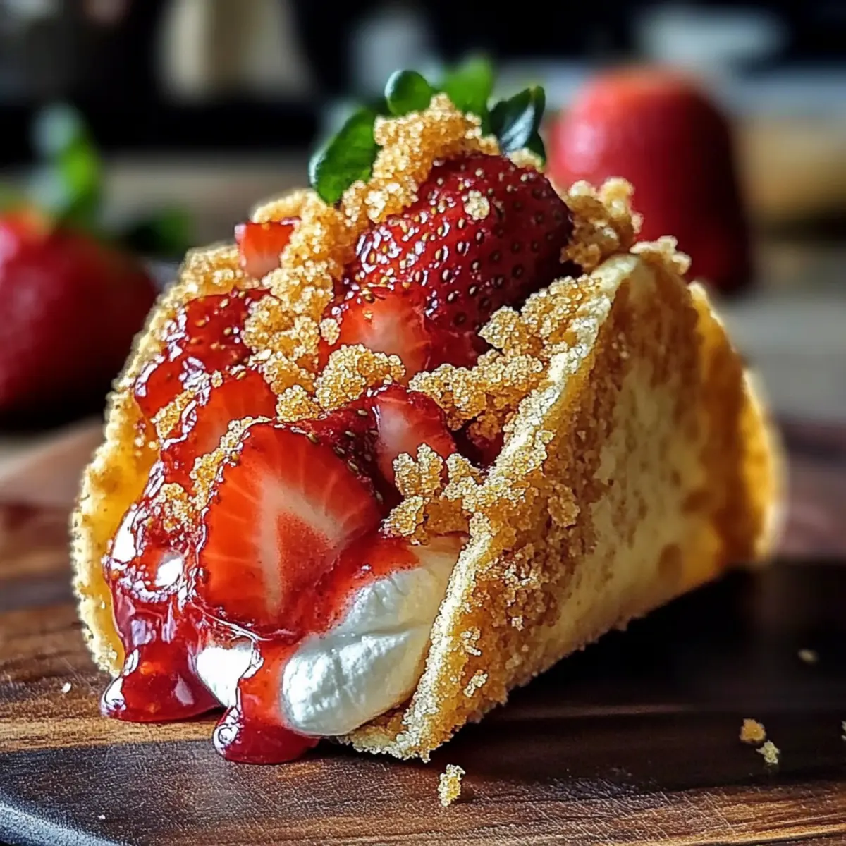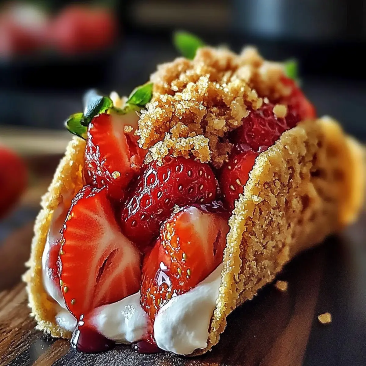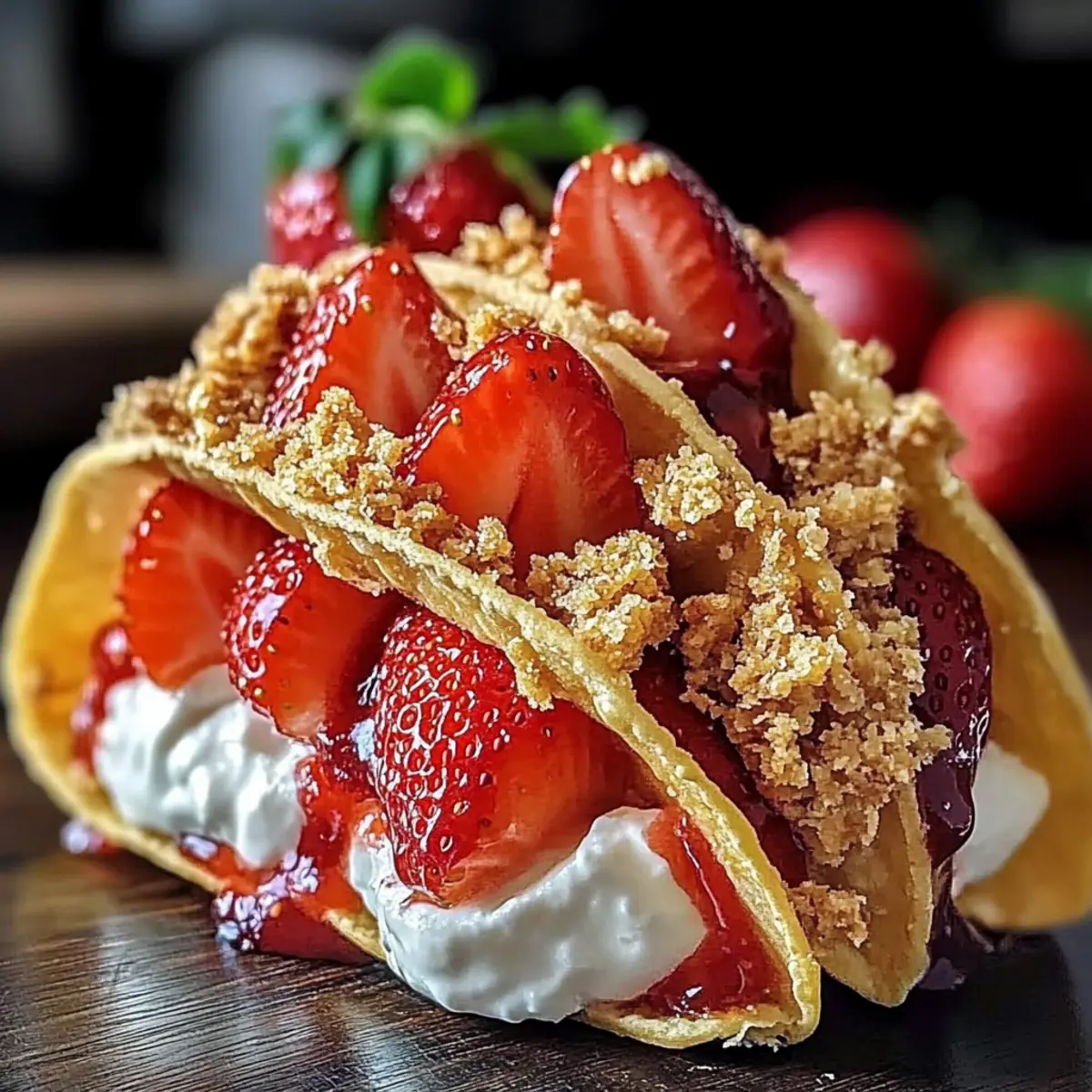 Jump to Recipe Print RecipeAs I stood in my kitchen, I couldn’t help but smile at the delightful mess I was about to create. Strawberry Crunch Cheesecake Tacos are a playful twist on dessert that turns traditional flavors into a fun, handheld treat. The combination of creamy cheesecake, succulent strawberries, and a crunchy golden topping nestled in crispy taco shells makes this recipe not only easy to whip up but also a customizable delight for any occasion. Whether it’s a family gathering or a cozy night in, these tacos bring a dose of joy and creativity to your dessert table. Plus, experimenting with different fruits and cookie bases means you can tailor them to your tastes! Are you ready to dive into this sweet adventure? Why Are These Tacos a Must-Try? Exceptional Fun Factor: Strawberry Crunch Cheesecake Tacos bring joy to the table with their playful presentation and delicious flavors. Customizable Delight: Easily substitute fresh strawberries with your favorite fruits like blueberries or peaches for a personal touch. Crunchy Perfection: The golden cookie crunch topping adds a delightful texture that perfectly complements the creamy filling. Quick to Prepare: With simple ingredients and straightforward instructions, you’ll have these delectable tacos ready in no time! Impressive Serving Style: Serve them up in taco stands for a fun visual appeal at parties or gatherings, making them a hit with guests. Versatility Galore: Enjoy these tacos as a dessert, snack, or even a colorful addition to brunch, just like with Cucumber Strawberry Salad! Strawberry Crunch Cheesecake Tacos Ingredients For the Crunch Topping • Golden Oreo Cookies – Adds sweetness and crunch to the topping; substitute with graham crackers or vanilla wafers for a different flavor. • Melted Butter – Binds the cookie crumbs together; use coconut oil for a dairy-free option. For the Cheesecake Filling • Cream Cheese (softened) – Base for the cheesecake filling providing creaminess; for a lighter option, consider using Neufchâtel cheese. • Powdered Sugar – Sweetens the cheesecake filling; can be substituted with honey for a natural sweetener. • Alcohol-free Vanilla Extract – Enhances flavor of the cheesecake filling; use regular vanilla extract for a stronger taste. For the Fresh Fruit • Fresh Strawberries – Provides juiciness and fresh flavor; other fruits like blueberries, raspberries, or peaches can be used as alternatives. For the Taco Shells • Flour Tortillas – Serves as the taco shell; whole wheat tortillas can be used as a healthier option. • Vegetable Oil (for frying) – Used to fry the tortillas to achieve crispiness; olive oil can be a healthier substitute. These Strawberry Crunch Cheesecake Tacos offer an exciting way to enjoy dessert, making every bite both creamy and crunchy! Step‑by‑Step Instructions for Strawberry Crunch Cheesecake Tacos Step 1: Prepare Crunch Topping Begin by pulsing the Golden Oreo cookies in a food processor until they turn into fine crumbs, which should take about 30 seconds. Next, transfer the crumbs to a mixing bowl and combine them with melted butter, mixing until fully incorporated. Chill the mixture in the refrigerator for about 15–20 minutes to set, allowing for the perfect crunch topping for your Strawberry Crunch Cheesecake Tacos. Step 2: Make Cheesecake Filling In a clean mixing bowl, use an electric mixer to beat the softened cream cheese with powdered sugar, and vanilla extract on medium speed for 2-3 minutes, until smooth and creamy. Scrape down the sides as needed to ensure everything is well combined. This luscious filling will be the star of your Strawberry Crunch Cheesecake Tacos, inviting everyone to take a bite. Step 3: Prepare Strawberries Wash the fresh strawberries under cool water, patting them dry with a clean kitchen towel. Hull and slice them into thin pieces, setting aside about 1 cup for the tacos. Make sure the strawberries are ripe, as they will add bright flavor and a touch of sweetness that beautifully complements the creamy cheesecake filling. Step 4: Assemble Taco Shells Heat vegetable oil in a large skillet over medium heat until shimmering, about 350°F (175°C). Carefully lay the flour tortillas in the hot oil, frying each side for about 1-2 minutes or until golden brown and crispy. Once cooked, remove the tortillas and let them drain on paper towels. Allow them to cool slightly before filling, ensuring they maintain their shape for the Strawberry Crunch Cheesecake Tacos. Step 5: Fill Tacos Once the taco shells have cooled, carefully spoon the cheesecake filling into each taco shell, using a piping bag or a spoon for ease. Top the filled tacos with the sliced strawberries and then sprinkle the chilled crunch topping generously over each one. This will create a delightful layer of texture that makes each bite of your Strawberry Crunch Cheesecake Tacos a flavorful experience. Step 6: Serve Immediately Arrange the Strawberry Crunch Cheesecake Tacos on a platter, and serve them fresh for the best texture. If desired, drizzle with a bit of melted chocolate or extra strawberries for a beautiful presentation. The combination of creamy cheesecake, juicy fresh strawberries, and a crispy topping will surely create smiles all around as everyone indulges in this sweet treat! Storage Tips for Strawberry Crunch Cheesecake Tacos Room Temperature: Best enjoyed fresh, but if needed, you can keep the taco shells at room temperature for up to 2 hours before assembly to maintain their crispness. Fridge: Store any leftover cheesecake filling in an airtight container in the fridge for up to 3 days; separate from the taco shells to prevent sogginess. Freezer: You can freeze the taco shells for up to 1 month; just ensure they are completely cooled and wrap them in plastic wrap followed by aluminum foil. Reheating: If using frozen shells, reheat in a preheated oven at 350°F for 10-15 minutes until crispy, ensuring you enjoy the bes