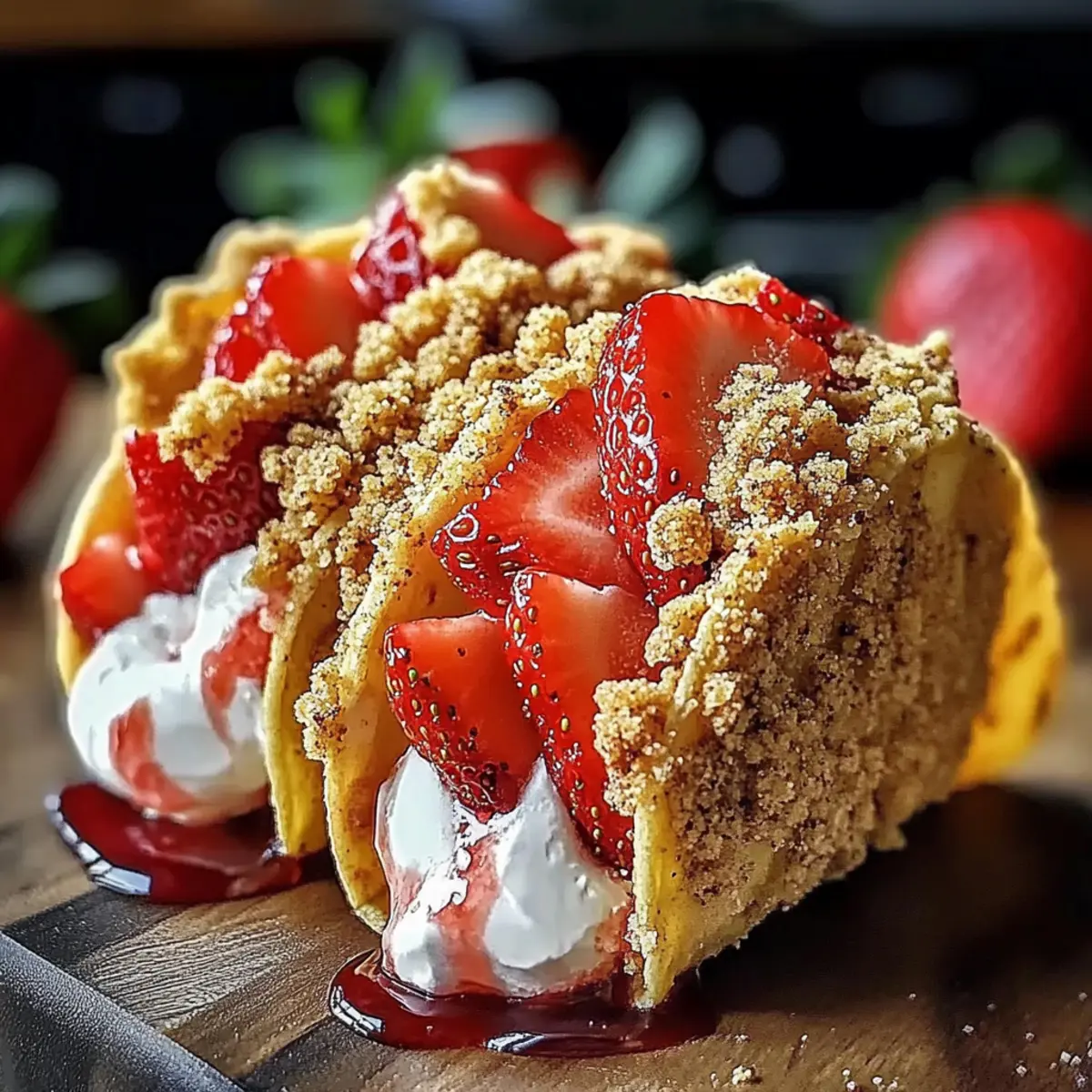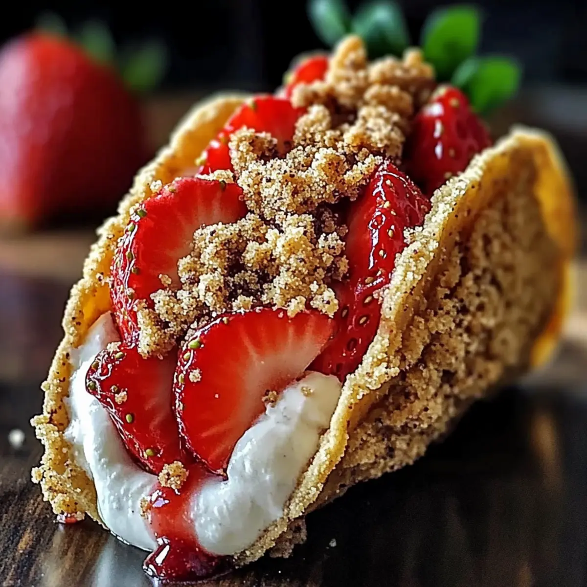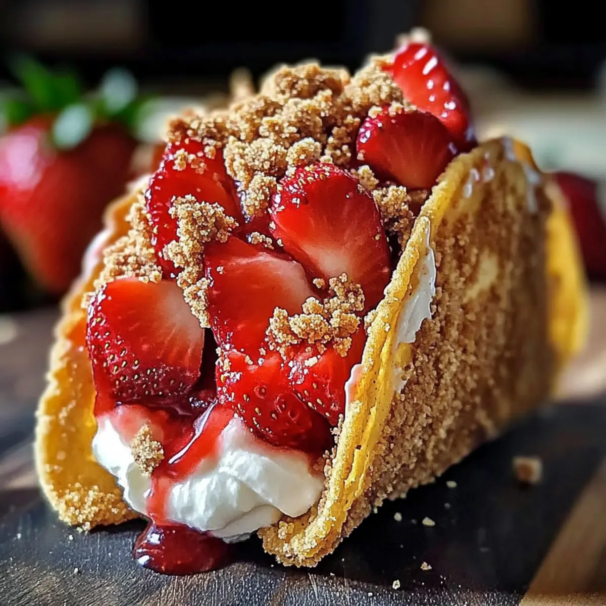 Jump to Recipe Print Recipe“Did you know tacos aren’t just for savory fillings?” This delightful twist on tradition has made its way into the dessert realm with my Strawberry Crunch Cheesecake Tacos. These beauties combine a dreamy, creamy cheesecake filling with the dizzying sweetness of fresh strawberries—all wrapped up in a crispy taco shell. Perfect for gatherings, they’re not only easy to assemble but are customizable to fit any occasion. You can even make them vegan by swapping out the cream cheese! Whether you want to impress guests or treat yourself after a long day, these tacos are the playful solution you didn’t know you needed. Ready to indulge in a dessert that turns heads and satisfies cravings? Let’s dive into this creamy and crunchy delight! Why are Strawberry Crunch Cheesecake Tacos irresistible? Fun: These tacos transform a classic dessert into a playful experience, making them perfect for parties or cozy nights in. Customizable: You can easily switch up the toppings and fillings to fit your taste—think blueberries, raspberries, or even a chocolate twist! Easy to Assemble: With minimal prep time, you can whip these up quickly, giving you more time to enjoy with friends or family. Vegan-Friendly Option: Simply swap cream cheese for a plant-based alternative, allowing everyone to celebrate dessert without dietary restrictions. Crowd-Pleaser: Visually stunning and packed with flavor, your guests will rave about this whimsical dessert that redefines taco night! Strawberry Crunch Cheesecake Tacos Ingredients For the Crunch Topping • Golden Oreo Cookies – Adds sweetness and a crunchy texture; can substitute with graham crackers or chocolate cookies for different flavors. • Unsalted Butter – Binds the crumbs together; melted butter provides rich flavor. For the Cheesecake Filling • Cream Cheese – The base for the filling; use full-fat for creamy consistency, or swap for a vegan alternative if desired. • Powdered Sugar – Sweetens the filling; adjust to your taste for desired sweetness. • Alcohol-free Vanilla Extract – Enhances the flavor; replace with almond extract for a unique nutty twist. For the Fruit Topping • Fresh Strawberries – Provide natural sweetness and freshness; feel free to substitute with blueberries, raspberries, or diced tropical fruits like mango. Step‑by‑Step Instructions for Strawberry Crunch Cheesecake Tacos Step 1: Prepare the Crunch Topping Start by pulsing the Golden Oreo cookies in a food processor until finely crumbed. Transfer the crumbs to a bowl, and mix in the melted unsalted butter until well combined. Once mixed, chill this mixture in the refrigerator for at least 30 minutes to let it firm up, making it easier to sprinkle over your finished Strawberry Crunch Cheesecake Tacos. Step 2: Make the Cheesecake Filling In a mixing bowl, beat the softened cream cheese with powdered sugar using an electric mixer on medium speed until creamy and smooth, about 2-3 minutes. Next, stir in a splash of alcohol-free vanilla extract and a squeeze of lemon juice for extra flavor. This luscious filling will be the heart of your Strawberry Crunch Cheesecake Tacos, so take your time mixing until fully combined. Step 3: Prepare Strawberries While the filling is coming together, wash and hull your fresh strawberries. Slice them into thin pieces and set them aside in a bowl. The juicy strawberries will add a delightful freshness to your Strawberry Crunch Cheesecake Tacos, enhancing both flavor and presentation, so make sure they are vibrant and bright. Step 4: Assemble Taco Shells For the taco shells, you have two options! Option 1 is to lightly fry flour tortillas in vegetable oil over medium heat until they are golden brown and crisp, about 1-2 minutes each side. Alternatively, for a healthier version, bake the tortillas in a preheated oven at 350°F (175°C), brushed with butter, for 8-10 minutes or until they are crispy and golden. Let them cool slightly before filling. Step 5: Fill Tacos Now it’s time to fill those taco shells! Using a spoon, add a generous dollop of the creamy cheesecake filling into each cooled taco shell, spreading it gently to fill the corners. Top each filled taco with the sliced strawberries, arranging them artistically for visual appeal, and finish with a sprinkle of the chilled crunch topping for that perfect texture contrast in your Strawberry Crunch Cheesecake Tacos. Step 6: Serve Immediately To enjoy the delightful crunch and creaminess at its best, serve your Strawberry Crunch Cheesecake Tacos immediately to your eager guests. This dessert is best enjoyed fresh, so assemble just before serving to keep the shells from getting soggy. Watch as everyone delights in this fun and delicious dessert presentation! Make Ahead Options These Strawberry Crunch Cheesecake Tacos are perfect for meal prep enthusiasts! You can prepare the crunchy topping and cheesecake filling up to 3 days in advance. To do this, chill the crunch topping after mixing (this helps it set) and store the cheesecake filling in an airtight container in the refrigerator. It’s best to slice the strawberries just before serving to maintain their freshness and prevent browning. When you’re ready to assemble, simply fill the cooled taco shells with the cheesecake mixture and top with strawberries and the crunch topping for a gorgeous finish. This way, you’ll have a delightful dessert ready with minimal last-minute effort! What to Serve with Strawberry Crunch Cheesecake Tacos Let your creativity shine and enhance your dessert experience with delightful pairings that accentuate the colors, textures, and flavors of these fun treats. Fresh Mint Leaves: A sprinkle of fresh mint adds a burst of freshness, balancing the sweetness of the tacos beautifully. Whipped Cream: The light, airy texture of whipped cream complements the creamy filling and contrasts with the crunch topping, making each bite even more indulgent. Chocolate Drizzle: A 