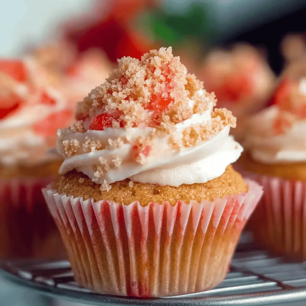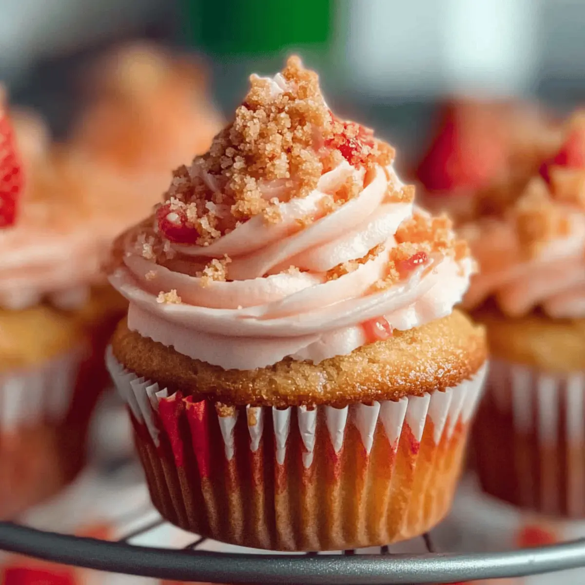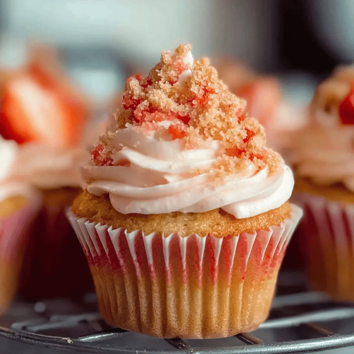 Jump to Recipe Print RecipeAs I stood in my kitchen, the sweet aroma of strawberries wafted through the air, instantly whisking me back to sun-drenched summer days filled with laughter and joyful gatherings. Today, I’m thrilled to share my recipe for Easy Strawberry Crunch Cupcakes, a delightful treat that captures that seasonal nostalgia in every bite. These cupcakes are not just a visual feast with their vibrant pink hue; they offer a moist and fluffy texture, topped with creamy vanilla buttercream and a crunchy strawberry shortcake crumble that’ll have your family and friends asking for seconds. Plus, this recipe is quick and approachable—perfect for seasoned bakers and novices alike. So, are you ready to indulge in some homemade sweetness? Let’s dive into these scrumptious Strawberry Crunch Cupcakes! Why Are Strawberry Crunch Cupcakes Irresistible? Bursting with flavor: The sweet and tangy notes of freeze-dried strawberries create a truly unique taste that’s hard to resist. Decadent texture: Enjoy layers of moist cake, creamy buttercream, and a delightful crunchy topping that keeps every bite exciting. Versatile treat: Perfect for any occasion—from birthday parties to cozy family gatherings, these cupcakes are sure to wow your guests. Easy to make: With simple ingredients and straightforward steps, even beginner bakers can master this delightful recipe. Summer nostalgia: These cupcakes capture the essence of sun-soaked days and childhood memories of strawberry shortcake ice cream bars—a treat everyone will love. For an extra refreshing option alongside these cupcakes, consider serving them with a chilled Cucumber Strawberry Salad! Strawberry Crunch Cupcakes Ingredients • Dive into the delightful world of Strawberry Crunch Cupcakes with these essential ingredients! For the Cupcake Batter Baking Spray – Ensures your cupcakes release easily from the pan. Freeze-Dried Strawberries – Infuses natural strawberry flavor and color; feel free to substitute with fresh strawberries and adjust wet ingredients accordingly. Eggs (2 large, room temperature) – Binds everything together and provides a lovely structure. Pure Vanilla Extract (1 tsp) – Enhances the overall flavor profile beautifully. Strawberry Extract (½ tsp) – Boosts the fruity flavor; use this only if you desire a stronger taste beyond the freeze-dried strawberries. Granulated Sugar (1 cup) – Sweetens and balances the flavors in the batter. Vegetable Oil (6½ tbsp) – Keeps cupcakes moist; you can switch this with melted coconut oil or unsalted butter for a richer taste. Sour Cream (⅓ cup, room temperature) – Adds moisture and tenderness; Greek yogurt makes a great alternative here. Cake Flour (1¼ cups) – Creates that tender, soft crumb; use all-purpose flour mixed with cornstarch as a substitute. Baking Powder (1.5 tsp) – This leavening agent works magic to help the cupcakes rise perfectly. Baking Soda (¼ tsp) – Pairs with sour cream for a delightful lift. Salt (½ tsp) – Balances the sweetness for a well-rounded flavor. Red Food Coloring (2-4 drops, optional) – Deepens the pink hue of your cupcakes for a vibrant presentation. For the Frosting Unsalted Butter (1 cup, room temperature) – Provides a rich base for the frosting. Powdered Sugar (4 cups) – Sweetens the frosting; adjust based on how sweet you like it! Heavy Cream or Milk (2 tbsp) – Helps achieve the perfect spreading consistency; swap with a plant-based milk if desired. Vanilla Extract (4 tsp, for frosting) – Adds a delightful flavor to your buttercream. For the Topping Strawberry Shortcake Crumble – A crunchy topping made with crumbled cookies that adds an irresistible texture to your cupcakes. Step‑by‑Step Instructions for Strawberry Crunch Cupcakes Step 1: Preheat and Prepare the Pan Begin by preheating your oven to 350°F (175°C) to ensure it’s hot and ready for baking. While the oven warms up, prepare a 12-cup muffin pan by spraying it generously with baking spray to prevent the cupcakes from sticking. This small but crucial step will help your lovely Strawberry Crunch Cupcakes come out beautifully. Step 2: Process the Strawberries Take your freeze-dried strawberries and place them in a blender or food processor. Pulse them until they form a fine powder, allowing their sweet essence to enhance your cupcakes. Set this strawberry powder aside, as it will be folded into the batter later, lending a vibrant flavor and color to your treats. Step 3: Mix the Wet Ingredients In a large mixing bowl, crack in two large room temperature eggs. Add the pure vanilla extract and strawberry extract, beating them together until the mixture is light and fluffy, about 1-2 minutes. Following that, gradually incorporate the granulated sugar, continuing to mix until all ingredients are well-combined and your batter is bursting with flavor. Step 4: Combine Oil and Sour Cream Next, pour in the vegetable oil and add the room temperature sour cream to the egg mixture. Use a spatula or mixer to combine these ingredients until you achieve a smooth batter. This step adds moisture and depth to the Strawberry Crunch Cupcakes, creating a delightful texture that everyone will adore. Step 5: Sift and Fold Dry Ingredients In a separate bowl, sift together the cake flour, baking powder, baking soda, salt, and the strawberry powder you prepared earlier. Once sifted, fold the dry ingredients into the wet mixture gently, being careful not to overmix. You want a smooth batter that’s just combined, as this will help keep your cupcakes light and fluffy. Step 6: Fill Cupcake Liners and Bake Carefully fill each cupcake liner in your prepared pan with batter, filling them about two-thirds full. This allows room for the cupcakes to rise beautifully while baking. Place the pan in your preheated oven and bake for 18–20 minutes, or until the centers spring back when gently pressed or a toothpick inserted comes out with moist crumbs. Step 7: Cool the Cu