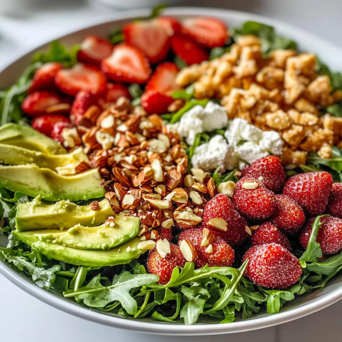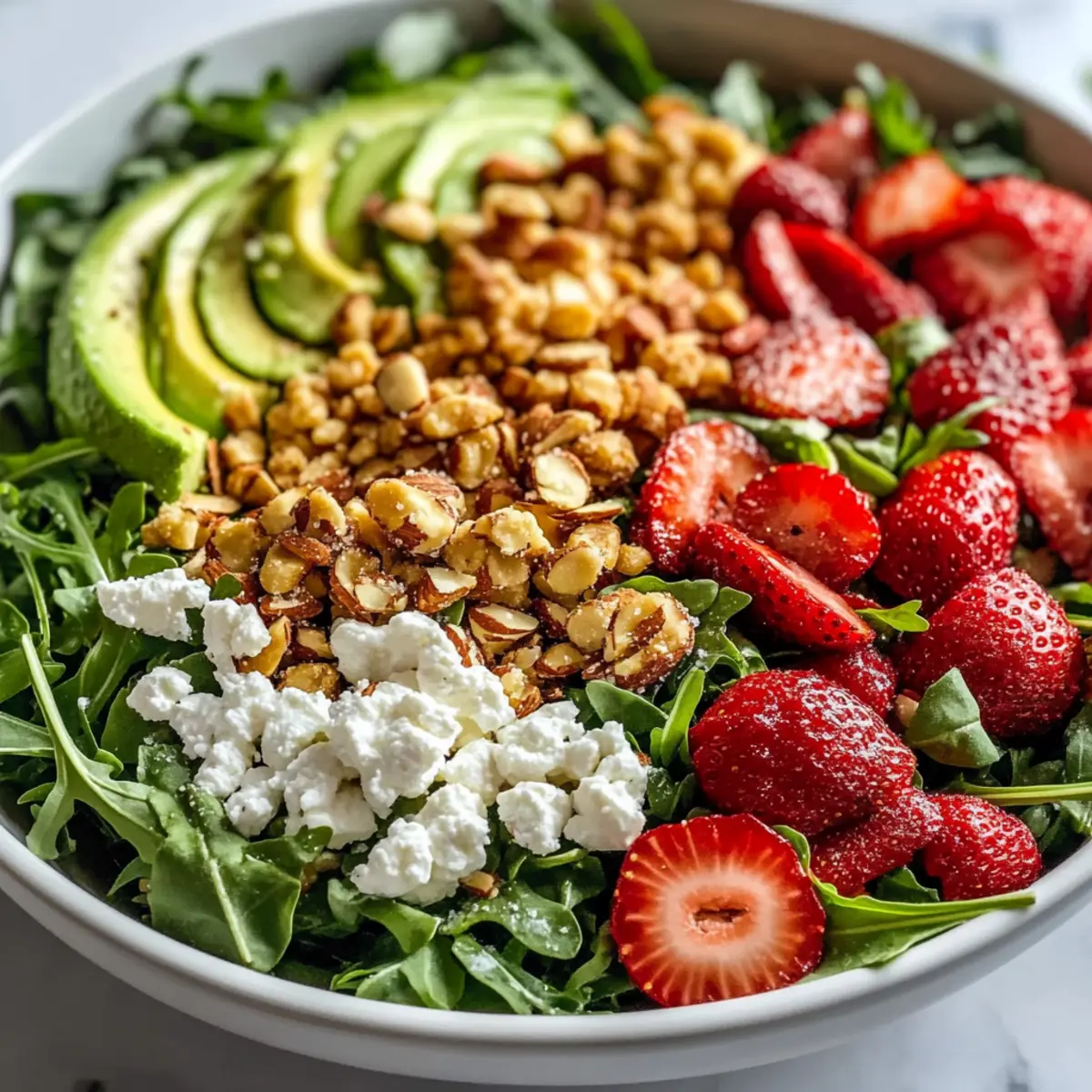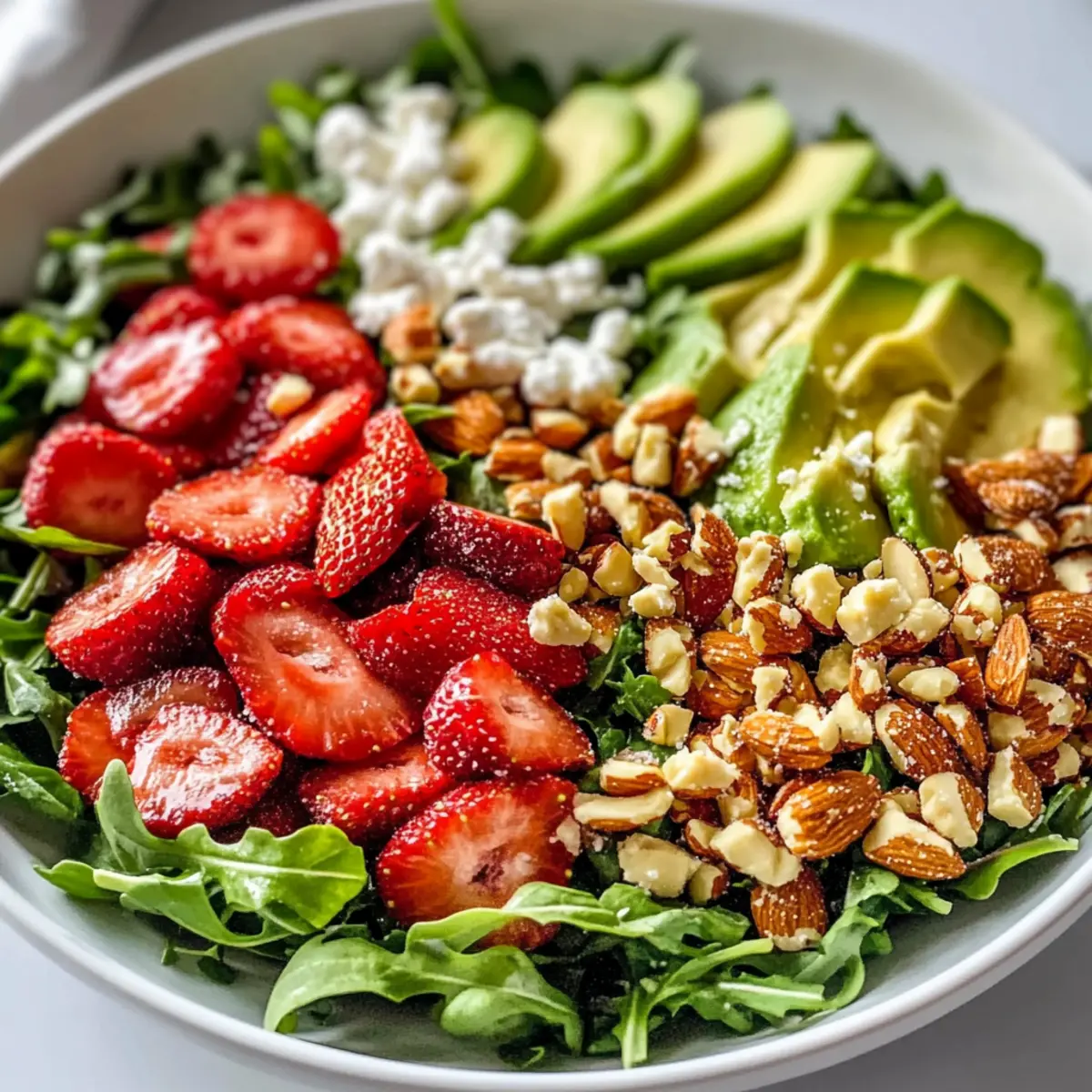 Jump to Recipe Print RecipeSummer is just around the corner, and the air is filled with the promise of fresh, vibrant meals that are quick to whip up and delicious to enjoy. That’s where my Strawberry Crunch Salad comes into play! This no-cook vegetarian delight brings together sweet strawberries, creamy avocado, tangy goat cheese, and a delightful crunch from sugared almonds—it’s truly a medley of textures and flavors. Not only is it perfect for those busy weeknights, but it also shines at summer picnics or casual brunches, making it a versatile crowd-pleaser. Plus, there’s no fuss with cooking, so you can focus on enjoying each bite! Are you ready to be inspired by this refreshing dish that’s as easy to make as it is to love? Why is this salad a must-try? Vibrant Flavors: The combination of juicy strawberries and creamy avocado creates a fresh taste explosion that delights your palate. Effortless Preparation: With no cooking involved, you can whip up this salad in just a few minutes—perfect for busy days! Versatile Pairing: Enjoy it as a light lunch, an elegant side for dinner, or packed for a picnic alongside favorites like Chickpea Salad Grilled. Nutrient-Packed: Rich in vitamins and minerals, this salad is as healthy as it is tasty, making it an ideal choice for nutritious meals. Customizable Joy: Feel free to swap ingredients—try adding protein like grilled chicken or chickpeas for a heartier dish! Strawberry Crunch Salad Ingredients • Looking to whip up a fresh, no-cook dish? Here’s what you need for this delightful Strawberry Crunch Salad! For the Salad Almonds – Add a sweet crunch; substitute with pecans if you want a different flavor. Arugula Greens – Serve as the base for a peppery kick; mixed greens can be used for a milder option. Strawberries – The star ingredient supplying sweetness and juiciness; fresh strawberries are ideal, but if you’re using frozen, just thaw and drain them first. Goat Cheese – Brings creaminess and tang; substitute with feta or a vegan option for a lighter choice. Pistachios – Elevate crunch and flavor; feel free to swap them with walnuts or omit for a nut-free recipe. For the Vinaigrette Olive Oil – Acts as the dressing base that ties everything together; avocado oil is a great alternative. Champagne Vinegar – Adds the perfect tang; white wine vinegar works well as a substitute. Honey – Provides natural sweetness for the dressing; you can swap for maple syrup for a vegan alternative. Dijon Mustard – Lends a hint of spice to the vinaigrette; yellow mustard can be used if you’re in a pinch. Garlic – Intensifies flavor; fresh garlic is best, but garlic powder can work in a hurry. Step‑by‑Step Instructions for Strawberry Crunch Salad Step 1: Sugared Almonds In a nonstick skillet over medium heat, melt 1/4 cup of sugar until it begins to caramelize, about 2-3 minutes. Stir in 1 cup of almonds, ensuring they are coated well. Continue cooking, stirring often for 6-8 minutes until the almonds are golden brown and fragrant. Carefully transfer the sugared almonds onto a sheet of parchment paper to cool completely. Step 2: Salad Assembly In a large bowl, start your Strawberry Crunch Salad by tossing together 6 cups of arugula with a pinch of salt and freshly cracked pepper. Add in 2 cups of sliced strawberries, 1 diced avocado, 1/2 cup of crumbled goat cheese, and 1/2 cup of cooled sugared almonds. Gently mix to combine the vibrant ingredients, allowing the colors and textures to shine. Step 3: Make Vinaigrette Whisk together in a separate bowl 1/4 cup of champagne vinegar, 2 tablespoons of honey, and the juice of 1 lemon. Add 1 tablespoon of Dijon mustard, 1 minced garlic clove, salt, and pepper to taste. Gradually drizzle in 1/2 cup of olive oil while whisking continuously to emulsify the vinaigrette. This dressing will beautifully enhance your Strawberry Crunch Salad. Step 4: Serve Drizzle the freshly made vinaigrette over the assembled salad, taking care not to saturate it. Toss gently but thoroughly to ensure all elements are well-coated. Serve immediately to enjoy the crisp textures and fresh flavors of your Strawberry Crunch Salad, making it the perfect dish for any occasion! What to Serve with Strawberry Crunch Salad Summer days call for delicious, refreshing pairings to complement your vibrant, no-cook dish. Grilled Chicken: Tender, flavorful chicken adds heartiness, balancing the salad’s refreshing elements for a satisfying meal. Perfect to grill ahead of time for a quick lunch! Quinoa Pilaf: Light and fluffy, this nutty pilaf enhances the crunchiness of the salad while being a protein-packed side, keeping you fuller for longer. Caprese Skewers: Juicy tomatoes, fresh basil, and creamy mozzarella create a perfect caprese skewer, bringing an Italian twist that contrasts beautifully with the sweet strawberries. Lemonade Spritzer: A sparkling lemon drink refreshes the palate, enhancing the salad’s bright flavors and adding a fizzy delight to your meal. Grilled Shrimp: Succulent shrimp seasoned with lemon and herbs perfectly complement the salad’s freshness while adding a touch of seaside magic to your table. Chocolate Covered Strawberries: A sweet ending! These can serve as a delightful dessert that mirrors the strawberries in your salad, bringing a sense of cohesion to your meal’s flavors. Fruit-Infused Water: Refreshing and hydrating, this drink keeps the theme light and healthy, elevating the summer vibe of your dining experience. Mixed Green Soup: A chilled soup can provide a wonderful contrast in textures and flavors, flowing smoothly after the crunchy salad for a complete summer-themed meal. Expert Tips for Strawberry Crunch Salad Watch the Almonds: Keep a close eye on the almonds while they’re caramelizing to avoid burning; it’s easy to get distracted! Best When Fresh: Dress the salad just before serving to keep the greens crisp and prevent a soggy mess. Choose Ripe Avocados: For the creami