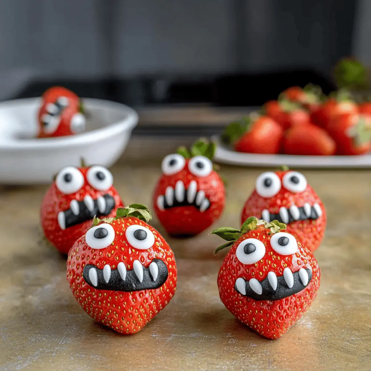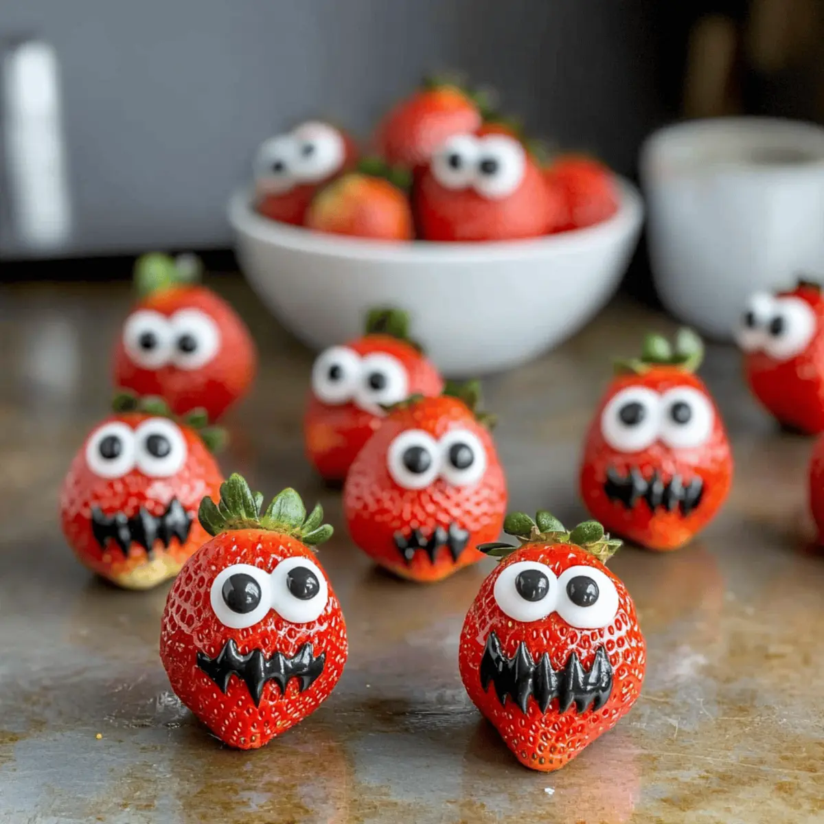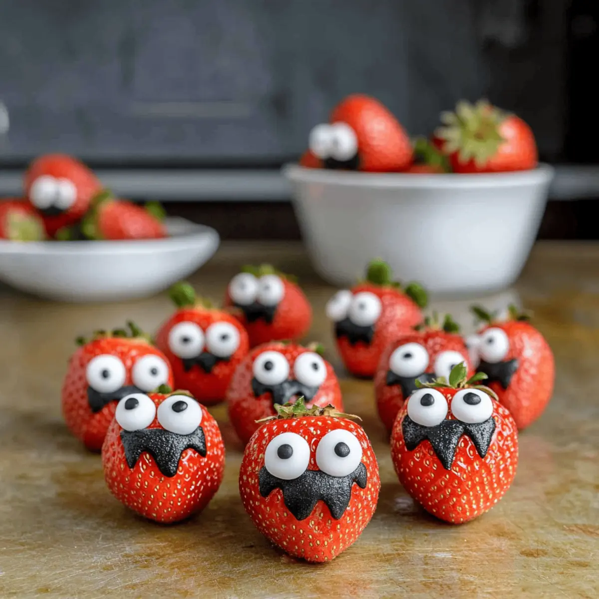 Jump to Recipe Print RecipeAs I navigated through the aisles of my local market, a curious idea crept into my mind—what if Halloween wasn’t just about spooky decorations and candy overload? Enter my Healthy Halloween Strawberry Monsters, a playful twist on the classic treats that’s perfect for this festive season! These adorable strawberry creatures, decked out with spooktacular candy eyes and whimsical fondant mouths, are not only a feast for the eyes but also a healthier alternative to the usual sugary sweets. Quick to prepare and easy to assemble, they promise to be a hit with both kids and adults, making your Halloween gatherings feel extra special. Curious about how to make these delightful monsters? Let’s dive into this fun and festive recipe! Why will you love these Strawberry Monsters? Playful Decoration: Transform ordinary strawberries into spooky delights with unique fondant designs that kids will adore! Healthy Twist: Enjoy the natural sweetness of strawberries while keeping sugar levels low—perfect for health-conscious celebrations. Simple & Quick: You can whip these up in no time, making them an ideal treat for last-minute Halloween gatherings. Versatile Options: Feel free to experiment with different fruits or decorations—why not try these monsters with apples or peaches? Crowd-Pleasing Appeal: These Strawberry Monsters are sure to steal the show at your Halloween party, alongside other favorites like Cucumber Strawberry Salad that balance sweetness with freshness! Delightful Crunch: Each bite combines the juicy freshness of strawberries with the soft texture of fondant, creating a mouthwatering experience everyone will love! Strawberry Halloween Monsters Ingredients For the Strawberries • Strawberries (12 ripe) – Choose bright red, juicy strawberries for a natural sweetness that works perfectly for your Strawberry Halloween Monsters. For the Fondant Decorations • White Fondant (2 ounces / 50g) – This is what brings your monsters to life; be sure to knead it well! • Black Food Coloring Gel – A little goes a long way in transforming the fondant for scary mouths; you could also use ready-made black fondant if you prefer. • Powdered Icing Sugar (⅓ cup) – Use this to dust your work surface, preventing the fondant from sticking while you create. For Assembly • White Writing Icing Tube – This acts like glue for adding fondant features and securing candy eyes; melted chocolate or water can be a good alternative too. • Candy Eyes (12 pieces) – These fun little details complete your monster look, making your Strawberry Halloween Monsters extra whimsical! Each ingredient plays a vital role in creating these delightful, healthier treats — making them a perfect addition to your Halloween festivities! Step‑by‑Step Instructions for Strawberry Halloween Monsters Step 1: Prepare the Strawberries Begin by washing 12 ripe strawberries thoroughly under cold water; gently pat them dry with a clean kitchen towel. Next, cut off the green tops to create a stable base, placing the strawberries on a serving dish with the pointed tip facing upward. This presentation will enhance the whimsical look of your Strawberry Halloween Monsters. Step 2: Color the Fondant Take 2 ounces of white fondant and separate it into two equal pieces. Add a few drops of black food coloring gel to one piece and knead it until the color is evenly distributed—a process that takes about 2–3 minutes. The fondant should be pliable and dark enough for a spooky touch. Set the colored fondant aside to be shaped into monster features. Step 3: Roll Out the Fondant Lightly dust your work surface with ⅓ cup of powdered icing sugar to prevent sticking. Roll out both the white and black fondant pieces until they are about 1/8 inch thick. Use a rolling pin for smoothness, taking care to maintain an even thickness, which will help in creating uniform decorations for your Strawberry Halloween Monsters. Step 4: Cut the Monster Features Using a small knife or fondant cutter, cut ovals from the black fondant to shape the monster mouths, and tiny triangles from the white fondant to craft the teeth. Aim for a fun, playful look with varied sizes to give each strawberry its unique character. These details will enhance the spooky charm of your creations. Step 5: Assemble the Mouths To attach the white teeth to the black mouths, use a small amount of water on your fingers or a brush. Apply this glue to the edges of the black ovals, pressing the white triangles gently into place. Allow them to set for a minute before moving on; this will ensure they hold together as you secure them onto the strawberries. Step 6: Decorate the Monsters Using the white writing icing tube, apply a dab on the back of the completed black mouths and carefully press them onto the top of each strawberry. The icing acts as glue. Position each mouth at an angle for maximum spookiness to create a playful character for your Strawberry Halloween Monsters. Step 7: Add the Candy Eyes Finish off your enchanted creations by placing candy eyes right above the mouths on each strawberry. Use more writing icing to hold them in place, ensuring each monster has a quirky and fun expression. These playful details will bring your Strawberry Halloween Monsters to life, making them irresistible at any spooky gathering! Expert Tips for Strawberry Halloween Monsters Choose Ripe Strawberries: Ensure you select the brightest, juiciest strawberries for the best flavor and appearance; they’re the stars of your Strawberry Halloween Monsters. Fondant Freshness: If preparing ahead, keep fondant decorations separate until serving to prevent them from softening—a common mistake many make. Icing Control: Avoid overusing writing icing; a small dab works best for attaching fondant and candy eyes to maintain a clean look. Temperature Matters: Keep your fondant at room temperature while working; cold fondant can crack and be difficult to shape into monster