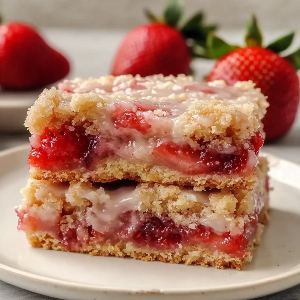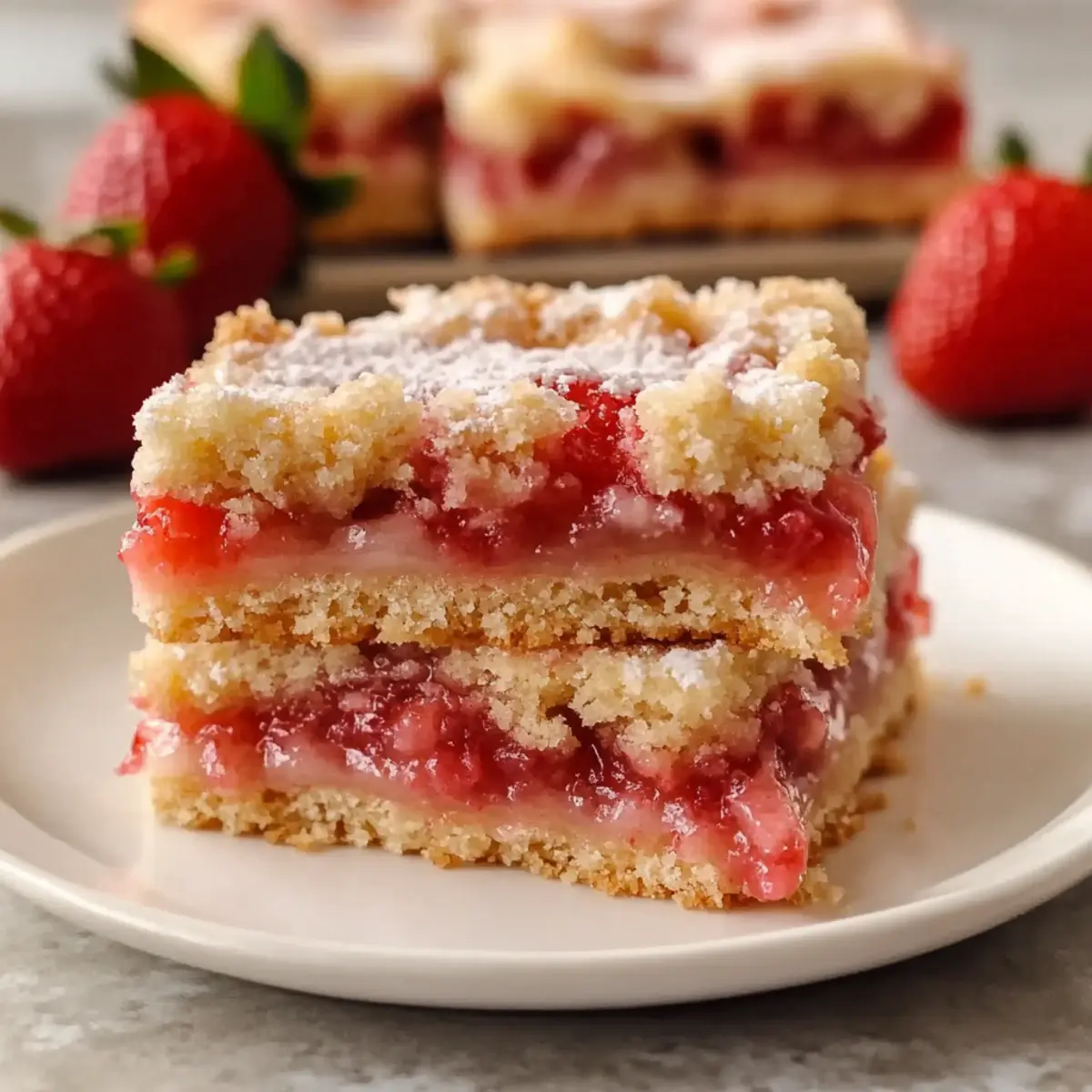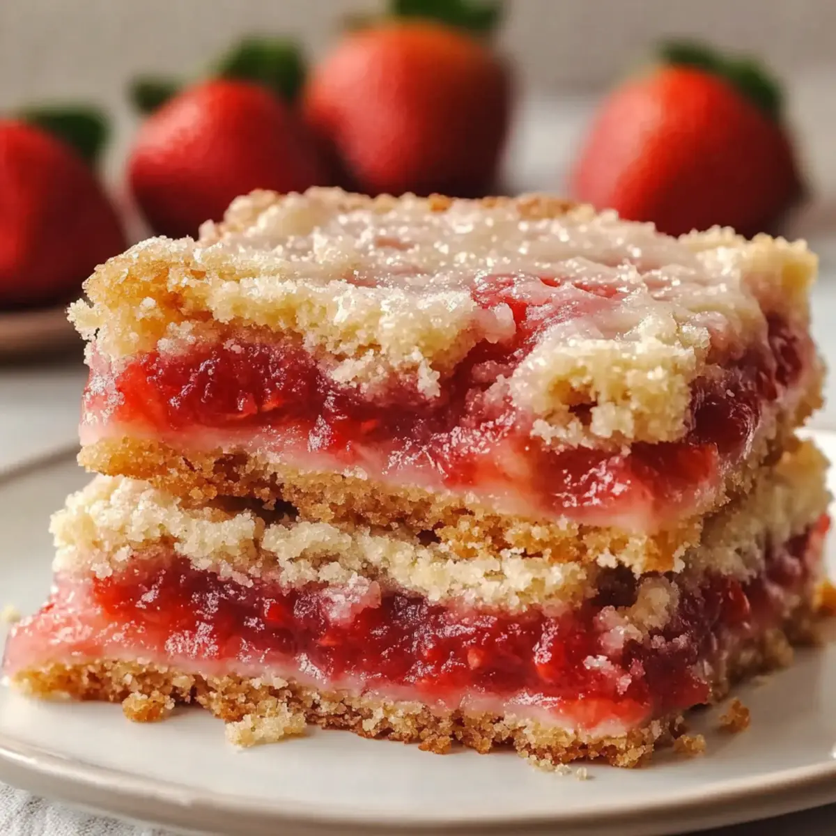 Jump to Recipe Print RecipeStepping into the kitchen on a warm spring day, the air is filled with the sweet, tangy aroma of fresh strawberries just begging to be transformed into something delightful. These Easy Strawberry Shortcake Bars capture the spirit of the season—making them a perfect fit for any gathering or dessert craving. This recipe combines a buttery, crumbly base with a luscious strawberry filling and a sweet vanilla glaze, ensuring every bite is a taste of summer. Beyond their irresistible flavor, these bars come together quickly with minimal mess, making them an ideal choice for busy cooks! Ready to bring sunshine to your table? Let’s dive into this delightful dessert that’s sure to impress. Why Are Strawberry Shortcake Bars So Loved? Irresistible Flavor: The combination of fresh strawberries and sweet glaze creates a burst of flavor that’s pure summer bliss. Quick & Easy: With minimal prep and cleanup, these bars are perfect for anyone looking to whip up something special without the hassle. Perfect for Gatherings: Serve them chilled at picnics or warm with ice cream; they’re a hit at any event. Versatile Variations: Feel free to mix it up with different berries or zest for a unique twist. Wholesome Ingredients: Made with fresh fruits and pantry staples, enjoy a sweet treat that feels good to share! If you’re a fan of delicious desserts, don’t miss out on making these alongside tasty options like Strawberry Icebox Cake or Strawberry Cheesecake Sandwiches. Strawberry Shortcake Bar Ingredients For the Crust and Topping • All-purpose flour – Provides structure to the crust and topping; swap with gluten-free flour for an alternative. • Granulated sugar – Sweetens the crust and filling; for a richer flavor, consider light brown sugar instead. • Light brown sugar – Adds moisture and a touch of caramel flavor, enhancing the overall taste. • Salted butter (or unsalted) – Binds ingredients for a crumbly texture; use unsalted butter and add a pinch of salt if desired. • Vanilla extract – Elevates the overall flavor profile; almond extract is a nice substitute for a nutty aroma. For the Strawberry Filling • Fresh strawberries – Form the jammy filling and provide natural sweetness; feel free to substitute with mixed berries for variety. • Heavy cream or light cream – Creates a smooth glaze; can be replaced with milk if preferred. For the Glaze • Powdered sugar – Adds sweetness and shine to the glaze; sift it for a smoother consistency. These Strawberry Shortcake Bars are not just a treat; they’re a delightful way to say hello to spring and summer! Step‑by‑Step Instructions for Strawberry Shortcake Bar Step 1: Preheat & Prepare Begin by preheating your oven to 350°F (175°C). Line an 8×8-inch baking pan with parchment paper, ensuring there’s some overhang to make it easier to lift out the bars later. This first step sets the stage for your delicious Strawberry Shortcake Bars, creating a perfect environment for baking. Step 2: Mix Dry Ingredients In a large mixing bowl, combine 1 1/2 cups of all-purpose flour, 1/4 cup of granulated sugar, and 1/4 cup of light brown sugar. Whisk these dry ingredients together until well blended, ensuring that there are no lumps. This mixture will form the base and topping for your bars, providing a delightful crumbly texture. Step 3: Add Wet Ingredients Next, melt 1/2 cup of salted butter and let it cool slightly before adding it to the dry ingredients. Stir in 1 teaspoon of vanilla extract and mix until crumbly. The consistency should resemble coarse crumbs, which creates the foundation of the Strawberry Shortcake Bars. Step 4: Form the Crust Press about two-thirds of the crumb mixture into the prepared pan evenly, creating a solid base. Bake in the preheated oven for 15 to 20 minutes until the edges turn lightly golden. Keep an eye on the crust; it should be firm to the touch but not overbaked. Once done, remove it from the oven and let it cool slightly. Step 5: Prepare Strawberry Filling While the crust cools, prepare the strawberry filling. In another bowl, toss 2 cups of chopped fresh strawberries with 1/4 cup of granulated sugar and 1 tablespoon of flour. This mixture will create a sweet, jammy filling that bursts with flavor in your bars. Ensure the strawberries are well coated for the best results. Step 6: Assemble Bars Spread the strawberry filling evenly over the cooled crust, making sure to distribute the strawberries uniformly. Then, sprinkle the remaining crumb mixture over the top, ensuring every corner is covered. This layering helps achieve the delightful texture of your Strawberry Shortcake Bars. Step 7: Bake Return the assembled bars to the oven and bake for 30 to 35 minutes, or until the top is golden brown and the filling is bubbling. Keep an eye on the edges; they should start to crisp up while the filling oozes slightly, creating that inviting look. Step 8: Cool & Glaze After baking, allow the bars to cool completely in the pan on a wire rack. Meanwhile, prepare the glaze by whisking together 1 cup of powdered sugar, 2 tablespoons of heavy cream, and 1/2 teaspoon of vanilla extract until smooth. Drizzle this sweet glaze over the cooled bars for a beautiful finish. Step 9: Slice & Serve Once the bars are completely cooled and the glaze has set, lift them out of the pan using the parchment paper overhang. Place them on a cutting board and slice into 12 even squares. Serve your Strawberry Shortcake Bars chilled for a refreshing treat or at room temperature for a delightful dessert moment. Expert Tips for Strawberry Shortcake Bars Use Ripe Strawberries: Choose firm, ripe strawberries to ensure maximum sweetness and avoid excess moisture that can make the crust soggy. Cool Before Glazing: Allow the bars to cool completely before adding the glaze. This prevents melting and keeps the glaze looking neat and delicious. Proper Storage: Store your Strawberry Shortcake Bars in an airtigh