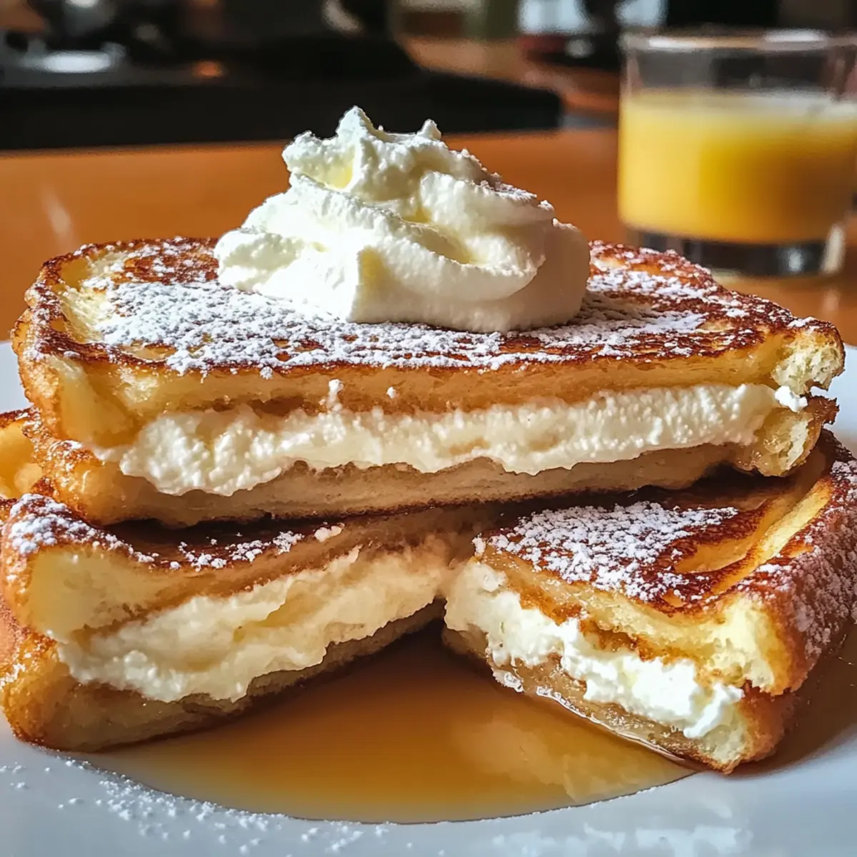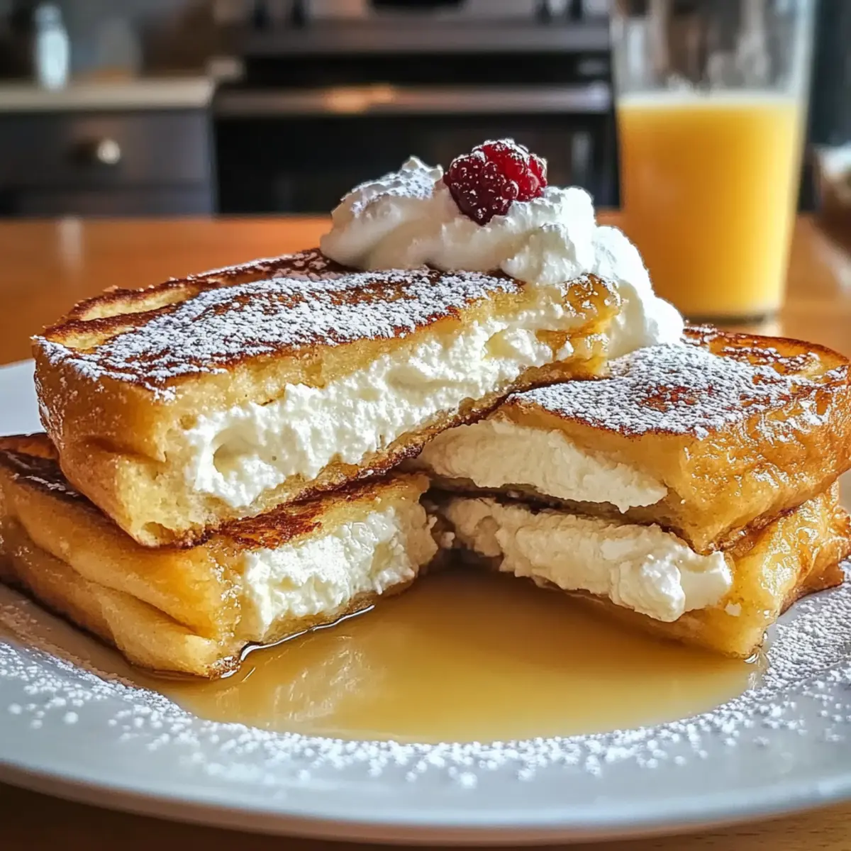 Jump to Recipe Print RecipeThe first bite of this Stuffed Cream Cheese French Toast is like waking up to your favorite childhood memories on a Sunday morning. Fluffy, golden bread cradles a creamy filling that’s sure to warm your heart, making this dish perfect for everything from relaxed brunches to festive gatherings. Not only is it a delightful showstopper, but this recipe is also incredibly easy to whip up, even for those new to the kitchen. With its versatile nature, you can play around with different breads and toppings, ensuring that every serving feels fresh and exciting. Ready to bring a little cozy comfort to your breakfast table? Let’s dive into this mouthwatering adventure! Why is this French toast so special? Irresistible Comfort: This Stuffed Cream Cheese French Toast is a warm hug on a plate, perfect for bringing comfort to any breakfast table. Easy to Make: The straightforward process allows everyone—from novice cooks to seasoned chefs—to create a breakfast masterpiece with minimal effort. Endless Variations: Feel free to experiment with flavors! Try different types of bread, or use fruit-flavored cream cheese for a unique twist. Crowd-Pleasing Delight: Whether it’s a cozy family brunch or a festive gathering, this dish is sure to impress your guests and keep them coming back for more. Quick Prep: With make-ahead options, like prepping the cream cheese filling in advance, breakfast can be a breeze! You’ll want to check out other great dishes like Vanilla French Beignets or Blackberry Cream Cheese for even more delicious ideas! Bring joy to your day with this indulgent treat that combines flavors and textures in every delightful bite! Stuffed Cream Cheese French Toast Ingredients Get ready to make something delicious! For the Cream Filling Cream Cheese – Provides a rich, creamy filling; low-fat cream cheese can be used for a lighter option. Powdered Sugar – Adds sweetness and a smooth texture; you can reduce the sugar for a healthier filling. Vanilla Extract – Enhances the flavor of the cream filling; try almond extract for a unique twist. For the French Toast Bread – Acts as the main structure; thick, sturdy bread like brioche or challah is ideal. A cinnamon raisin bread can add extra flavor! Eggs – Essential for creating the custard base that coats the bread. Milk – Adds creaminess to the egg mixture; use non-dairy milk for a lactose-free version. Ground Cinnamon – Provides warmth and spice to the dish; nutmeg can be added for additional flavor. Salt – Enhances all the flavors in the dish; just a pinch is sufficient. To Serve Syrup – A drizzle of your favorite syrup makes this Stuffed Cream Cheese French Toast extra indulgent. Fresh Berries – Add a burst of freshness and color to your plate! With these ingredients, you’re all set to whip up a breakfast delight that will leave everyone craving more! Step‑by‑Step Instructions for Stuffed Cream Cheese French Toast Step 1: Prepare Cream Filling In a mixing bowl, combine 8 ounces of softened cream cheese, 1/4 cup of powdered sugar, and 1 teaspoon of vanilla extract. Use a hand mixer or a fork to blend the ingredients until smooth and creamy, about 2-3 minutes. Make sure the mixture is well combined with no lumps, then set it aside for assembly. Step 2: Assemble Sandwiches Take slices of thick bread, such as brioche or challah, and spread a generous layer of the cream cheese filling on one side of each slice. Press the slices together, cream side in, to form sandwiches. Ensure an even distribution of the filling, making it easier to enjoy every delightful bite of your Stuffed Cream Cheese French Toast. Step 3: Make Egg Mixture In a shallow bowl, whisk together 4 large eggs, 1 cup of milk, 1 teaspoon of ground cinnamon, and a pinch of salt until well blended. The mixture should be uniform in color with no separation. This custard base will coat the sandwiches perfectly, giving them that rich, delicious flavor signature to Stuffed Cream Cheese French Toast. Step 4: Coat Bread Carefully dip each stuffed sandwich into the egg mixture, making sure both sides are fully coated. Allow any excess egg mixture to drip off back into the bowl. This step is crucial for achieving that golden-brown crust. Prepare your skillet while you finish coating all sandwiches to ensure they cook evenly. Step 5: Cook Heat a non-stick skillet over medium heat and add about 1 tablespoon of butter or oil to the pan. Once the butter is melted and bubbling, place the stuffed sandwiches in the skillet. Cook for 3-4 minutes on each side, or until they are golden brown and crispy. Keep an eye on them to avoid burning, ensuring they develop that beautiful, golden crust. Step 6: Serve Once cooked, carefully transfer the stuffed cream cheese French toast to a serving plate. Top with your choice of warm syrup, fresh berries, or other desired toppings. Enjoy the delightful contrast of the crispy exterior and the creamy center with each bite, making your breakfast a truly indulgent experience. How to Store and Freeze Stuffed Cream Cheese French Toast Fridge: Store leftover Stuffed Cream Cheese French Toast in an airtight container for up to 3 days. Reheat in the microwave or a skillet until warmed through. Freezer: For longer storage, freeze cooked French toast sandwiches in a single layer on a baking sheet, then transfer to an airtight container or freezer bag. They can last up to 2 months. Reheating: To enjoy frozen leftovers, reheat in the toaster or oven at 350°F (175°C) for about 10-15 minutes, or until heated through and crispy. Make-Ahead: Prepare the cream cheese filling a day in advance and store it in the fridge for easy assembly in the morning, making brunch a breeze! Stuffed Cream Cheese French Toast Variations Feel free to bring your own twist to this delightful recipe and make it your own! Flavored Cream Cheese: Swap in strawberry or blueberry cream cheese for a fruity and vibrant filling. Each bite bursts with swe