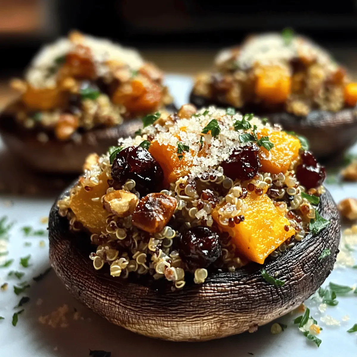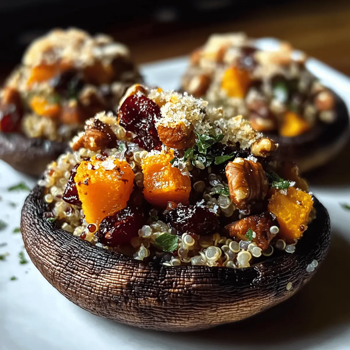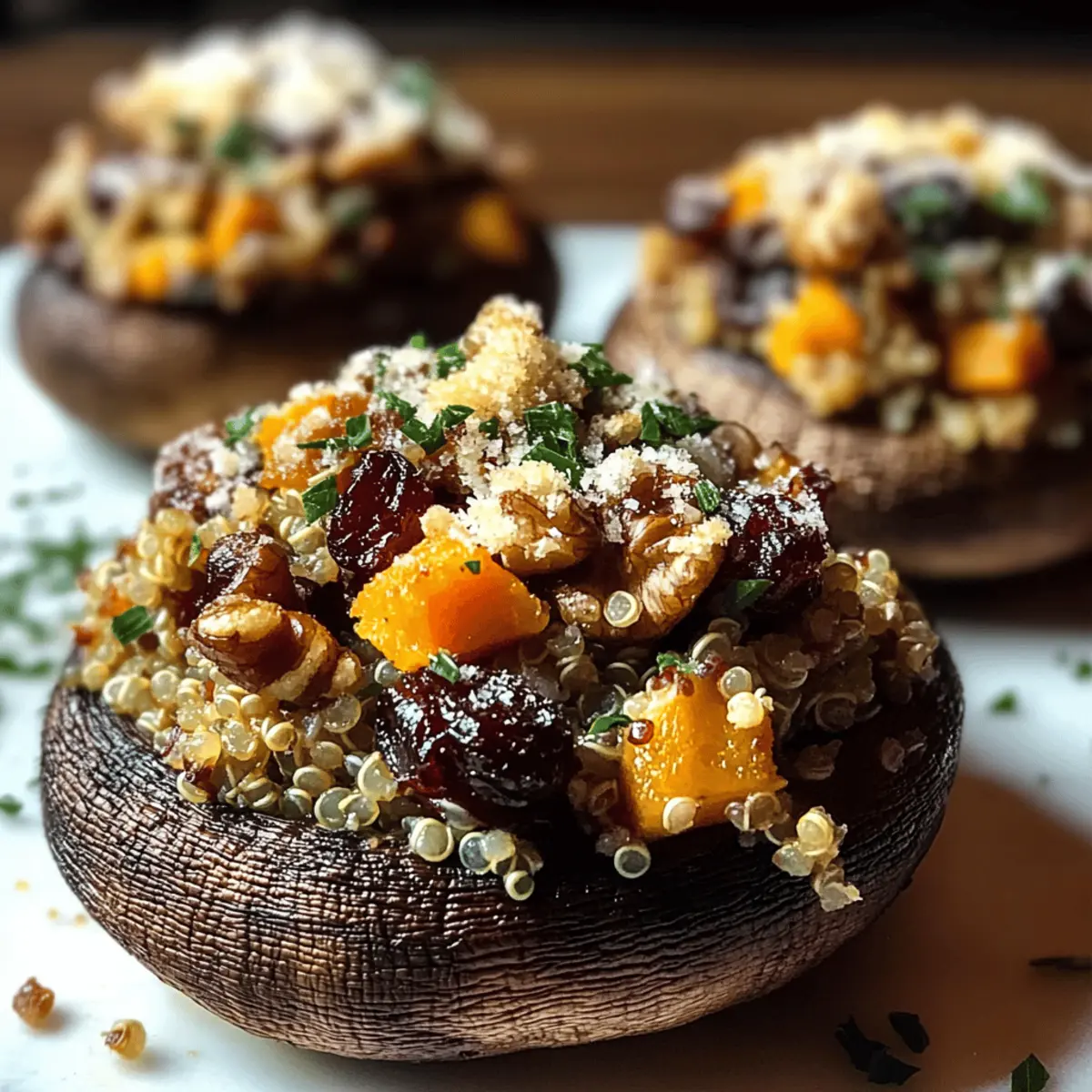 Jump to Recipe Print RecipeAs the leaves turn golden and the air grows crisp, my kitchen transforms into a haven of cozy flavors that embrace the spirit of autumn. This season calls for hearty, satisfying meals, and what better way to celebrate than with these Autumn Harvest Stuffed Portobello Mushrooms? Packed with a delicious mix of quinoa, roasted butternut squash, tart cranberries, and crunchy walnuts, this vegetarian dish is not only visually stunning but also brimming with nutrition. In under an hour, you can whip up this delightful recipe that is perfect for busy weeknights or impressing your dinner guests. Are you ready to infuse your kitchen with the essence of fall? Let’s dive into this delectable journey of flavors! Why are These Mushrooms a Must-Try? Comforting Delight: These Autumn Harvest Stuffed Portobello Mushrooms are a warm hug on a plate, combining seasonal flavors that will transport you to a cozy autumn evening. Nutritious Powerhouse: Filled with quinoa, butternut squash, and walnuts, this dish is a nutrient-rich option, packed with protein and fiber. Quick & Easy: Busy weeknight? These beauties come together in under an hour, making them the perfect solution to meal prep without sacrificing flavor. Versatile Inspiration: Feel free to experiment with substitutions, like using brown rice instead of quinoa or adding spinaches for extra greens; the possibilities are endless! Impressive Presentation: With their rich colors and inviting aroma, they are sure to impress your family and friends, just like my popular Greek Stuffed Onions. Crowd-Pleasing Appeal: Whether you’re entertaining guests or savoring a night in, these mushrooms are bound to become a favorite around the dinner table. Stuffed Portobello Mushrooms Ingredients For the Mushrooms • Portobello Mushrooms – The star of the dish; choose large, firm caps for the best stuffing experience. For the Filling • Quinoa – A protein-packed grain; cook in vegetable broth for a flavor boost. • Butternut Squash – Adds a creamy sweetness; can be swapped with sweet potato or pumpkin. • Minced Garlic – Fresh garlic enhances the dish’s flavor; garlic powder works in a pinch. • Fresh Thyme – Adds aromatic freshness; dried thyme is a great substitute (use 1/3 the amount). • Dried Cranberries – Provide a sweet-tart contrast; raisins can work similarly if needed. • Chopped Walnuts – Crunchy texture to complement the filling; substitute pecans or sunflower seeds for variety. For the Topping • Parmesan Cheese – Creates a crispy, flavorful crust; opt for vegan cheese if dairy-free is preferred. Step‑by‑Step Instructions for Autumn Harvest Stuffed Portobello Mushrooms Step 1: Preheat the Oven Start by preheating your oven to 375°F (190°C). While it heats, line a baking sheet with parchment paper to prevent sticking and make cleanup a breeze. The parchment also helps to create a nice base for your Autumn Harvest Stuffed Portobello Mushrooms, ensuring they roast evenly and maintain that beautiful texture. Step 2: Prep Mushrooms Gently clean the portobello mushrooms under cool running water, then pat them dry with a clean towel. Carefully remove the stems and gills inside the caps, maximizing space for that delicious filling. Brush the outside of each mushroom cap with olive oil and season them with a sprinkle of salt and pepper to enhance their natural flavors. Step 3: Cook Quinoa In a medium pot, bring 2 cups of vegetable broth to a boil. Once boiling, add 1 cup of rinsed quinoa, cover the pot, and reduce the heat to low. Let it simmer for about 15 minutes or until the quinoa is fluffy and the liquid is absorbed. This base will provide protein and texture for your stuffed portobello mushrooms. Step 4: Sauté Squash While the quinoa cooks, heat 2 tablespoons of olive oil in a large skillet over medium heat. Add the diced butternut squash and sauté for about 10 minutes until it’s golden and tender. In the final minute, stir in the minced garlic and fresh thyme, allowing the fragrant aroma to fill your kitchen, enhancing the filling’s flavor for your stuffed mushrooms. Step 5: Mix Filling In a large mixing bowl, combine the cooked quinoa, sautéed butternut squash, dried cranberries, and chopped walnuts. Gently fold the mixture together using a spatula to ensure all ingredients are evenly distributed without mashing them. This flavorful filling is what will make your Autumn Harvest Stuffed Portobello Mushrooms truly exceptional. Step 6: Stuff Mushrooms Spoon the quinoa mixture generously into each mushroom cap, heaping it slightly for a lovely presentation. Once filled, sprinkle a layer of Parmesan cheese over the top of each mushroom, allowing it to melt and create a crispy, flavorful crust. This step is essential for adding that delectable finish to your stuffed portobello mushrooms. Step 7: Bake Place your stuffed mushrooms on the prepared baking sheet and transfer them to the preheated oven. Bake for 20-25 minutes, or until the mushrooms are tender and the cheese is bubbly and golden. Keep an eye on them, as this will create an inviting aroma that fills your home with the essence of autumn. How to Store and Freeze Stuffed Portobello Mushrooms Fridge: Store leftovers in an airtight container for up to 3 days. To keep flavors fresh, avoid letting them sit at room temperature for too long. Freezer: For longer storage, freeze unbaked stuffed portobello mushrooms. Wrap each individually in plastic wrap and place them in a freezer-safe bag for up to 3 months. Reheating: When ready to enjoy, bake frozen mushrooms directly from the freezer, adding about 10 minutes to the original baking time for best results. Make-Ahead Tip: Prepare the stuffed mushrooms in advance and store them in the refrigerator. Bake when ready for a quick, delicious weeknight meal. Make Ahead Options These Autumn Harvest Stuffed Portobello Mushrooms are perfect for meal prep enthusiasts! You can prepare the filling (quinoa,