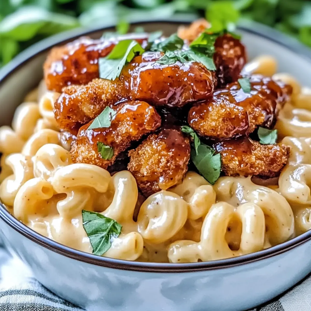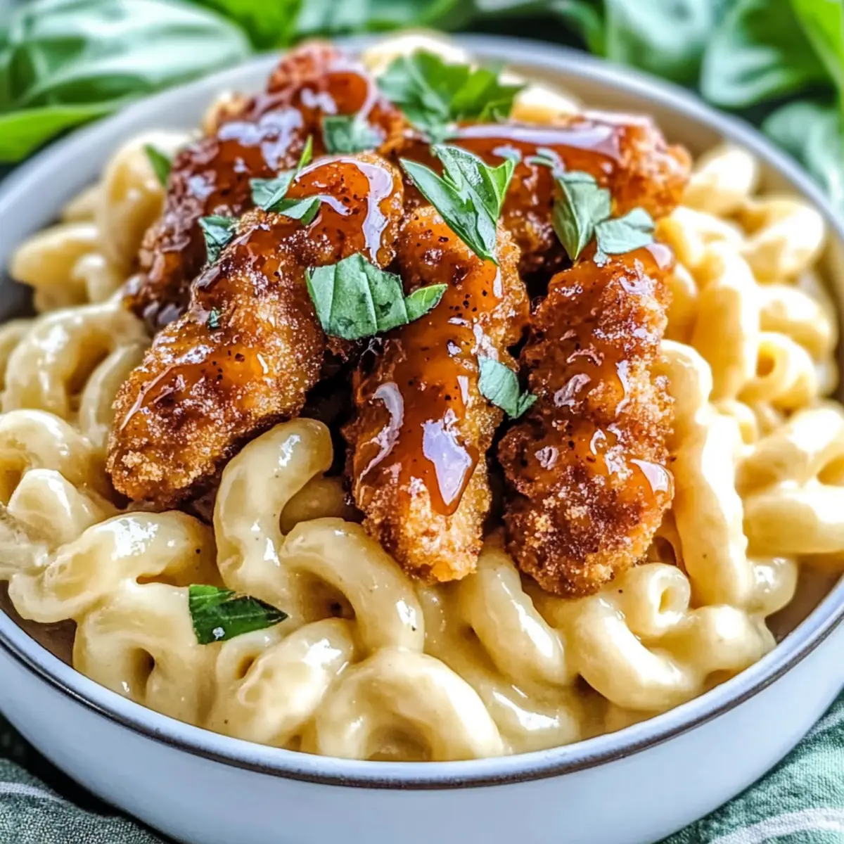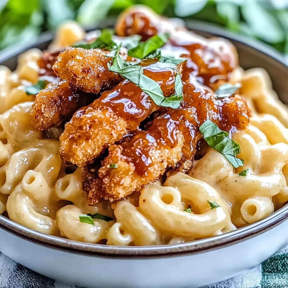 Jump to Recipe Print RecipeIn the midst of a busy week, I found myself staring at my pantry contemplating dinner, when BAM! The idea struck—a creamy, Sweet and Spicy Honey Pepper Chicken Mac and Cheese like no other! This dish is an absolute game-changer, combining comfort food with an unexpected zing that had my taste buds dancing. Not only is it a quick preparation that lets me indulge without fuss, but it also allows for endless customization—whether you’re gluten-free or leaning vegetarian, it’s got you covered. Imagine a lively mix of tender pasta enveloped in a luscious cheese sauce, topped off with crispy chicken and a hint of sweet and spicy goodness. What could be better for a cozy family dinner or a last-minute gathering with friends? Let’s dive into a bowl of deliciousness that promises to delight every palate! Ready to uncover the secrets of this delectable recipe? Is This Your New Favorite Mac and Cheese? Comforting yet Unique: This Sweet and Spicy Honey Pepper Chicken Mac and Cheese is a delightful twist on a classic, bringing excitement to your dinner table. Quick Prep: In just 40 minutes, you can whip up a meal that feels like a Sunday feast, perfect for busy weeknights. Endless Customization: Whether you’re following a gluten-free diet or want to go vegetarian, this recipe is adaptable to meet your needs. Flavor Explosion: The combination of creamy cheese, crunchy chicken, and a kick from the honey pepper sauce makes every bite an irresistible joy! Pair it with a side of garlic bread or salad for a balanced meal, and you’ll see why this will be on your regular rotation! Sweet and Spicy Honey Pepper Chicken Mac and Cheese Ingredients For the Pasta • Spiral Noodles – 16 oz – This shape is perfect for holding onto the creamy sauce and giving you that delightful bite! For the Chicken • Breaded Chicken Strips – 25 oz – Offers protein and can be baked or fried for extra crunch. For the Bacon • Cooked Bacon – 5 slices – Crumbled for that smoky flavor; feel free to add extra for garnish! For Seasoning • Salt – To taste – Essential for enhancing all the flavors. • Pepper – To taste – Helps to elevate the taste profile. • Basil – Fresh for garnish – Adds a fragrant note; dried can be used if fresh isn’t available. For the Sauce • Honey – 3/4 cup – Sweetens the sauce beautifully! • Brown Sugar – 1/4 cup – For that lovely caramelization. • Soy Sauce – 3 Tbs – Adds umami richness; opt for low sodium if desired. • Pineapple Juice – 1/4 cup – Brings fruity tang to balance the honey. • Lemon Juice – Juice of 1 whole lemon – Adds brightness and cuts through sweetness. • Vinegar – 1 Tbs – Provides acidity to uplift the flavors. • Black Pepper – 1 tsp – Gives a gentle kick. • Cayenne Pepper – 1/4 tsp – Introduces heat; you can omit for a milder dish. For the Cheese Sauce • Butter – 1 stick – The foundation for a creamy sauce. • Heavy Cream – 2 cups – Ensures smooth, luxurious texture. • Parmesan Cheese – 1/2 cup shredded – Adds depth of flavor. • Mozzarella Cheese – 1 cup shredded – Gives that stretch and creaminess we all love. • Colby Jack Cheese – 3/4 cup shredded – A robust flavor addition. • Garlic – 2-3 cloves minced – Adds aromatic depth to the sauce. Step‑by‑Step Instructions for Sweet and Spicy Honey Pepper Chicken Mac and Cheese Step 1: Cook Chicken Preheat your oven to 400°F (200°C) for baking or heat oil for frying. Follow the package instructions to cook the breaded chicken strips until golden brown and crispy, typically around 20 minutes. Once cooked, remove from heat and set aside on a paper towel-lined plate to absorb excess oil. This crunchy chicken will be the highlight on top of your Sweet and Spicy Honey Pepper Chicken Mac and Cheese! Step 2: Boil Pasta Bring a large pot of salted water to a boil over high heat. Once boiling, add 16 ounces of spiral noodles and cook until al dente, usually about 8-10 minutes. Drain the pasta in a colander and give it a quick rinse with cold water to stop the cooking process. This step is crucial, preventing the noodles from becoming mushy in the creamy sauce. Step 3: Prepare Honey Pepper Sauce In a medium saucepan, combine 3/4 cup honey, 1/4 cup brown sugar, 3 tablespoons soy sauce, 1/4 cup pineapple juice, the juice of 1 lemon, 1 tablespoon vinegar, 1 teaspoon black pepper, and 1/4 teaspoon cayenne pepper. Bring the mixture to a simmer over medium heat, stirring occasionally for about 15 minutes until it thickens. This sweet and spicy concoction will add a wonderful flavor dimension to your dish! Step 4: Make Cheese Sauce In a large skillet or pot, melt 1 stick of butter over medium heat, then pour in 2 cups of heavy cream, stirring gently to combine. Gradually add 1/2 cup parmesan, 1 cup mozzarella, and 3/4 cup Colby Jack cheese, stirring continuously until fully melted and creamy, which should take about 5-7 minutes. Don’t forget to add 2-3 minced garlic cloves during this process for an aromatic depth to your Sweet and Spicy Honey Pepper Chicken Mac and Cheese. Step 5: Combine Ingredients Gently fold the cooked spiral noodles into the rich cheese sauce, ensuring each piece is coated in creamy goodness. Next, add in the crumbled bacon for a smoky flavor and mix gently to combine all ingredients. Off the heat, this cheesy mixture should be thick and indulgent, ready to embrace the finishing touches of your Sweet and Spicy Honey Pepper Chicken Mac and Cheese. Step 6: Coat Chicken Take the cooked chicken strips and dip each one into the prepared honey pepper sauce, ensuring they are well-coated. This step adds an irresistible glaze to the chicken, enhancing the overall flavor of the dish. Place the coated chicken strips on top of the cheesy pasta mixture for a delightful presentation. Step 7: Serve Divide the Sweet and Spicy Honey Pepper Chicken Mac and Cheese into serving bowls. Generously top 