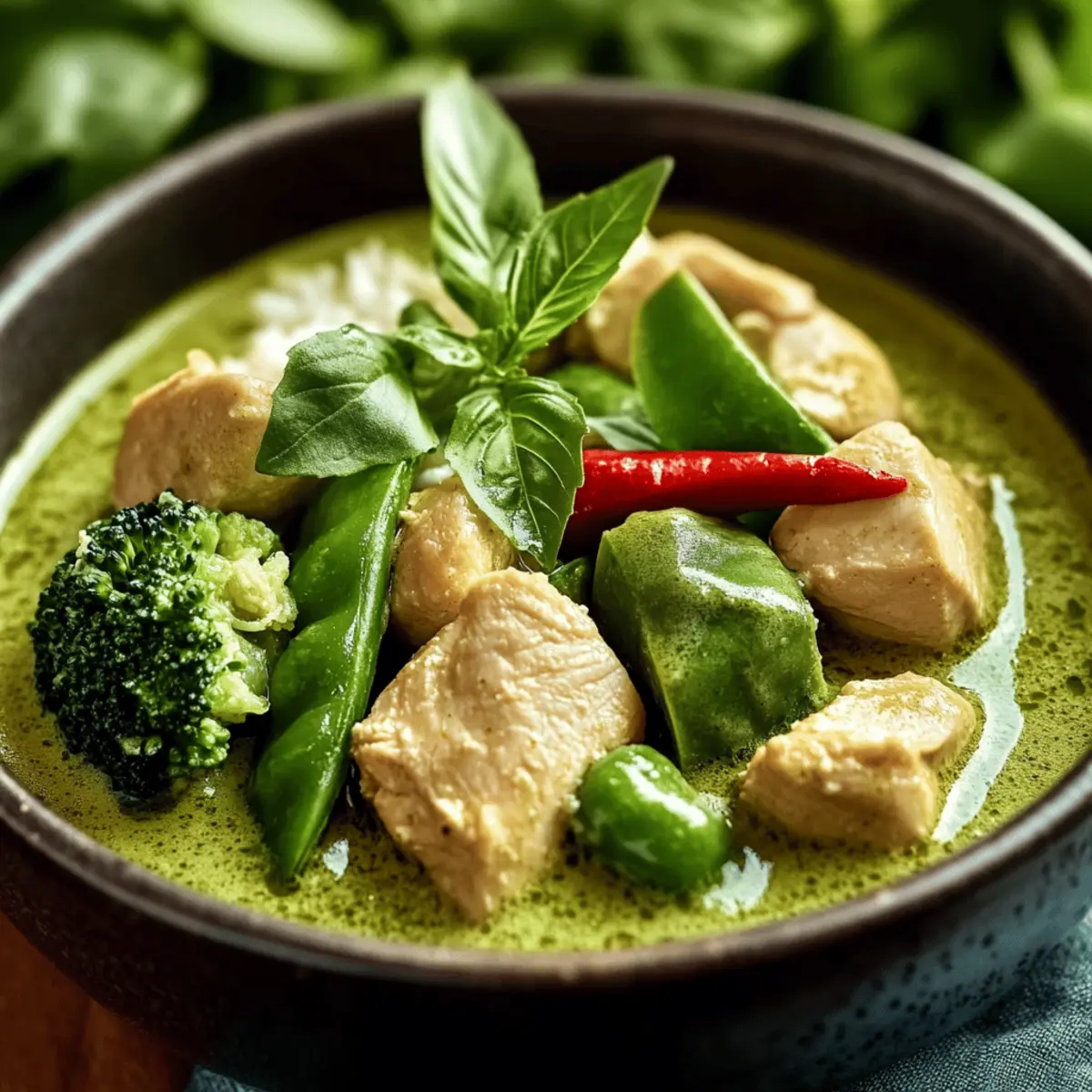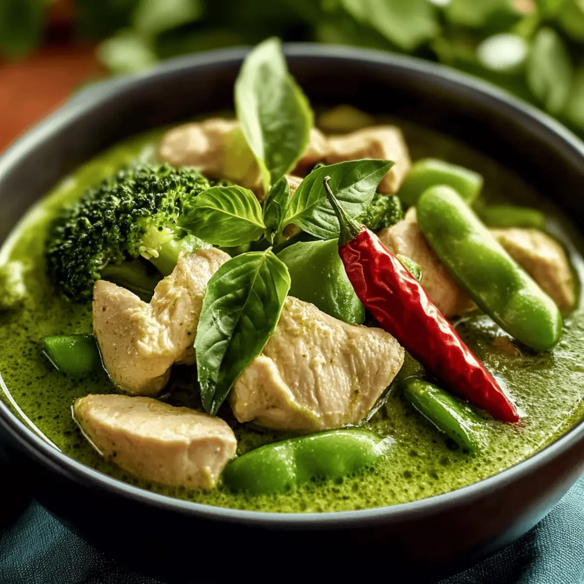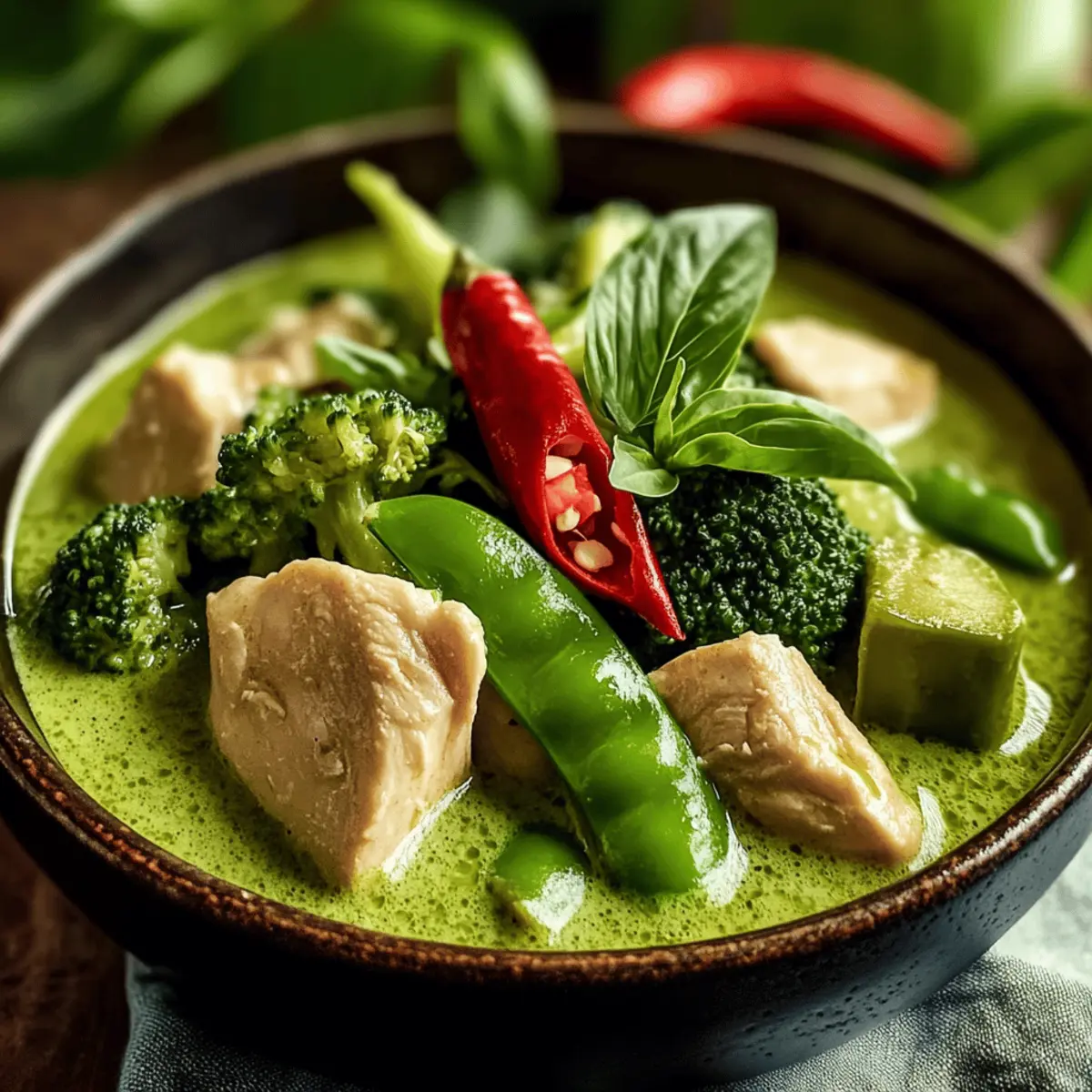 Jump to Recipe Print RecipeThe moment I first tasted Thai Green Chicken Curry, it was as if I had been transported to the bustling streets of Bangkok, filled with mesmerizing aromas that danced around me. This recipe is an embodiment of authentic Thai flavors, where the creamy richness of coconut milk mingles delightfully with the vibrant heat of green chilies. Not only is this dish a fantastic way to impress friends and family, but it also comes together in a snap, making it perfect for those busy weeknight dinners or as a standout centerpiece for special gatherings. As you savor each bite, you’ll appreciate how quickly this comfort food can feel like a warm hug, with the added joy of knowing it’s a meal you prepared from scratch. Are you ready to bring a taste of Thailand into your kitchen? Why is Thai Green Chicken Curry so special? Authenticity: This recipe captures the essence of Thai cuisine with its rich blend of flavors and spices, making every bite an adventure. Creamy Texture: The use of full-fat coconut milk results in a luscious consistency that perfectly complements the chicken and veggies. Quick & Easy: With simple steps, you can whip up this delightful dish in under 30 minutes—perfect for busy individuals! Customizable: Feel free to swap in your favorite vegetables or proteins, like shrimp or tofu, for endless variations. Crowd-Pleasing: Whether hosting a dinner party or enjoying a cozy meal at home, this curry is sure to impress and satisfy everyone around the table. Thai Green Chicken Curry Ingredients For the Curry Chicken Thighs – Tender protein; substitute with chicken breasts or firm tofu for a vegetarian option. Thai Green Curry Paste – Flavor base; homemade is preferred for authenticity; store-bought options should contain natural ingredients. Coconut Milk – Provides creaminess; full-fat is recommended to avoid the pitfalls of “lite” varieties. Vegetables (e.g., broccoli, sugar snap peas) – Add freshness and color; ensure they are added later in cooking to retain crunch. Kaffir Lime Leaves – Aromatic herb for brightness; optional but can substitute with lime zest for flavor. Fish Sauce – Adds umami depth; can be replaced with soy sauce for a vegetarian version. Light Brown Sugar – Balances flavors; for a paleo version, use coconut sugar instead. Lime Juice – For acidity and freshness; essential for balancing flavors, always adjust to taste. Serving Suggestions Jasmine or Sticky Rice – The perfect bed for this curry, soaking up all the delicious flavors. Fresh Lime Wedges – A delightful garnish to brighten each bite and complement the dish beautifully. This Thai Green Chicken Curry is an authentic delight that brings the essence of Thailand right to your home kitchen! Step‑by‑Step Instructions for Thai Green Chicken Curry Step 1: Prepare the Curry Paste Start by making your homemade curry paste to ensure authentic Thai flavors in your Thai Green Chicken Curry. Blend together fresh herbs, such as cilantro and basil, with green chilies until smooth. This should take about 2-3 minutes in your food processor. Once blended, set the paste aside, allowing the flavors to meld. Step 2: Cut the Chicken While your curry paste is resting, cut your chicken thighs into bite-sized pieces. This helps the chicken cook evenly and thoroughly. Aim for even sizing, about one-inch chunks, so that they will brown nicely when cooked. Set the chicken pieces aside, ready to join the vibrant flavors of your curry. Step 3: Sauté the Curry Paste In a stovetop pan, heat 2 tablespoons of oil over medium heat. Add the prepared curry paste and sauté for about 3-4 minutes until it becomes fragrant and darkens in color. Stir continuously to prevent burning and ensure even cooking. This will awaken the spices and aromatics, establishing a wonderful base for your curry. Step 4: Brown the Chicken Next, add the prepared chicken pieces to the pan with the sautéed curry paste. Cook for about 5-7 minutes, stirring occasionally, until the chicken is browned on the outside but not fully cooked through. This browning adds depth of flavor to your Thai Green Chicken Curry, enhancing the overall taste. Step 5: Add Coconut Milk Pour in one can of full-fat coconut milk into the pan, stirring to combine this creamy ingredient with the chicken and curry paste. Increase the heat to medium-high and bring the mixture to a gentle simmer. Let it cook for around 10 minutes, ensuring the chicken is fully cooked and infused with the rich flavors. Step 6: Incorporate Vegetables After the chicken is cooked, stir in your choice of vegetables such as broccoli and sugar snap peas. Allow them to simmer in the curry for about 4-5 minutes, ensuring they retain their crunch and vibrant color. This adds freshness to your Thai Green Chicken Curry, creating a delightful texture contrast. Step 7: Adjust Seasoning Now it’s time to balance the flavors in your Thai Green Chicken Curry. Squeeze in the juice of one lime and sprinkle in a tablespoon of light brown sugar, tasting as you go. You can also add a splash of fish sauce for umami depth. Stir well and adjust the seasoning to your preference, ensuring a harmonious flavor profile. Step 8: Serve and Garnish Once seasoned to perfection, ladle the Thai Green Chicken Curry over steaming jasmine or sticky rice. Garnish with fresh Thai basil and chopped red chilies for an added touch of color and flavor. Serve hot, allowing the warm aromas to envelop your dining space—your homemade Thai feast is ready to enjoy! Expert Tips for Thai Green Chicken Curry Homemade Paste: Making your own Thai green curry paste enables better control over spice levels and freshness; enjoy vibrant flavors that truly represent your dish. Coconut Milk Care: Always simmer coconut milk gently; boiling can cause it to split and ruin the creamy texture essential for a delightful Thai green curry. Seasoning Adjustment: Taste as you go! Adding lime juice or a pinch of sugar can perfec