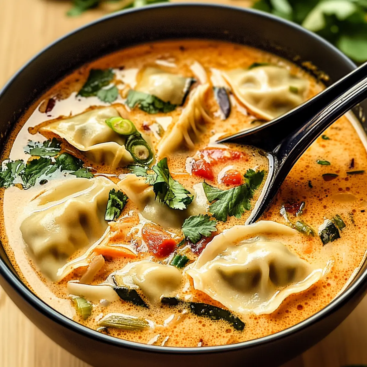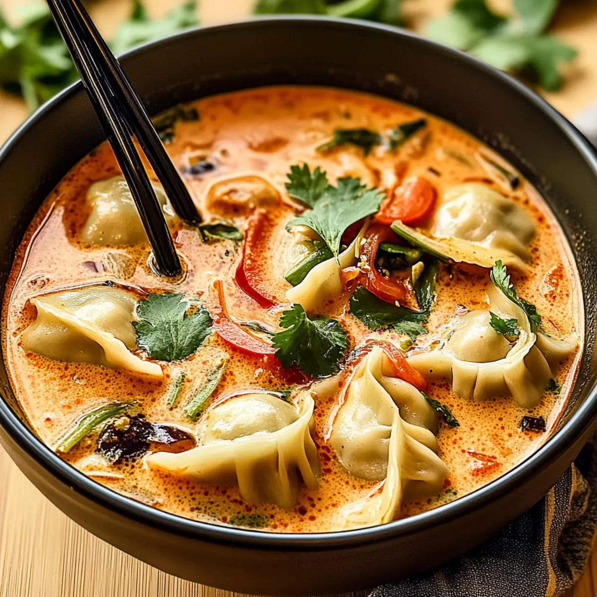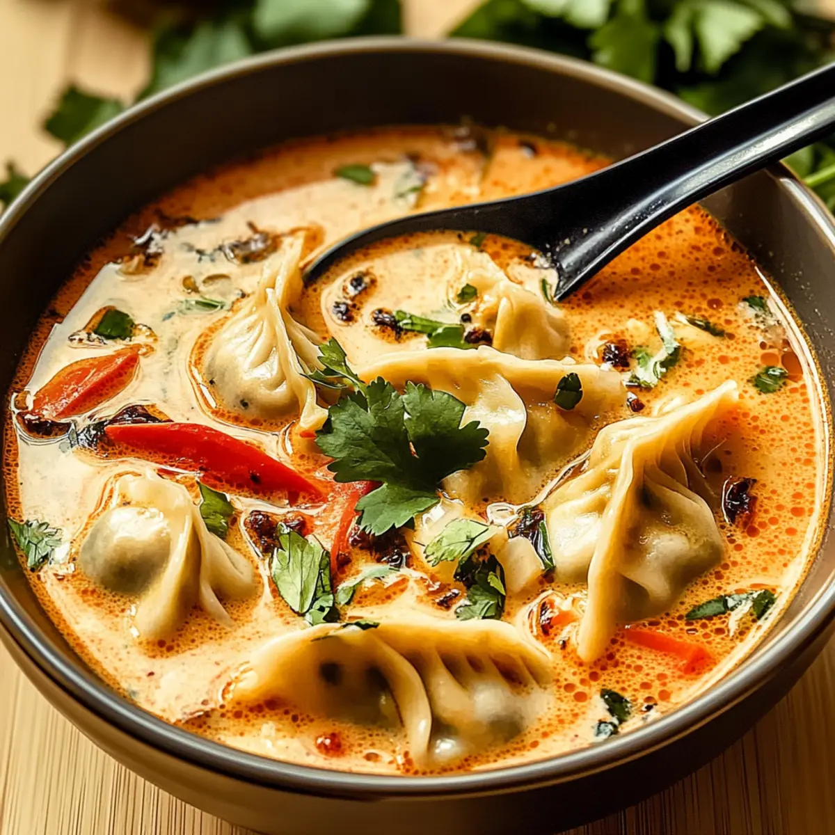 Jump to Recipe Print RecipeAs the cold breeze sweeps through the air, it’s the perfect time for a cozy, comforting bowl of goodness. Enter my Vegan Thai Red Curry Dumpling Soup, which is not just a feast for the senses but also a delightful antidote to fast food fatigue. With its aromatic infusion of Thai red curry and a velvety, rich broth, this soup is a quick prep wonder that’ll have your taste buds singing. You can personalize it too—mix in your favorite seasonal veggies or proteins like shrimp or tofu for a satisfying twist. Whether it’s a weeknight dinner or a gathering with friends, this soup is bound to impress and warm everyone’s hearts. Are you ready to dive into this comforting culinary adventure? Why is This Soup a Must-Try? Comforting and Hearty: The Thai Red Curry Dumpling Soup wraps you in warmth with its velvety broth and tender dumplings—perfect for chilly nights. Customizable Goodness: Easily swap in your favorite vegetables or proteins like tofu or shrimp, making it a versatile choice for any meal. Quick and Easy: You can whip this up in no time, making it ideal for those bustling weeknight dinners or unexpected guests. Vegan Delight: With its plant-based ingredients, this soup appeals to vegans and comfort food lovers alike, bridging flavors and satisfaction. A Flavorful Escape: The rich aromas of Thai red curry create a delightful taste journey, transporting you far away from mundane fast food meals. So, grab your ingredients and get ready to impress your loved ones with a dish that’s sure to be a hit at any gathering! Thai Red Curry Dumpling Soup Ingredients For the Soup Base • Thai Red Curry Paste – Adds deep, spicy flavor; substitute with green curry paste for a milder taste. • Coconut Milk – Provides creaminess and a touch of sweetness; use full-fat for a richer texture. • Vegetable Broth – Forms the flavorful base; homemade broth enhances the taste even more. For the Dumplings • Dumplings – Create a hearty texture; feel free to use store-bought or make your own. For the Veggies • Chopped Vegetables (e.g., bell pepper, carrots) – Adds freshness and nutrition; swap for seasonal veggies or your favorites. For the Finishing Touch • Lime Juice – Balances flavors with a refreshing acidity; fresh lime juice is key for the best taste. • Cilantro and Green Onions – Garnish for added freshness; can be replaced with parsley or omitted for simplicity. Get ready to create a comforting bowl of Thai Red Curry Dumpling Soup that will warm your soul! Step‑by‑Step Instructions for Thai Red Curry Dumpling Soup Step 1: Prepare Ingredients Begin by gathering all your ingredients for the Thai Red Curry Dumpling Soup. Chop the vegetables, such as bell peppers and carrots, into bite-sized pieces for even cooking. If you’re using homemade dumplings, prepare those ahead of time. Set everything within arm’s reach to streamline your cooking process and make it effortless. Step 2: Sauté Aromatics In a large pot, heat a splash of vegetable oil over medium heat. Add the chopped onions and minced garlic, sautéing for about 3-4 minutes until they become fragrant and translucent. This builds a flavorful foundation for your soup, inviting warmth and aroma into your kitchen. Step 3: Add Curry Paste Once your aromatics are ready, stir in 2 tablespoons of Thai red curry paste. Cook for an additional 1-2 minutes, allowing the paste to release its vibrant flavors and colors. You’ll know it’s ready when the mixture becomes lively and aromatic, filling your kitchen with a welcoming scent. Step 4: Combine Liquids Slowly add 1 can of coconut milk and 4 cups of vegetable broth to the pot, stirring well to combine all the ingredients. Increase the heat to bring the soup to a gentle simmer. As the liquids blend together, you’ll start to see a beautiful, creamy texture developing—this rich base is the essence of your Thai Red Curry Dumpling Soup. Step 5: Incorporate Dumplings and Vegetables Gently add the dumplings and chopped vegetables to the simmering soup. Allow everything to cook for about 10 minutes, stirring occasionally until the dumplings are tender and the vegetables have softened but still retain a bit of their crunch. Watch for the dumplings to float; this indicates they are cooked through and ready to enjoy. Step 6: Finish with Lime and Herbs Before serving, squeeze in the fresh juice of one lime and give the soup a gentle stir to incorporate the zesty flavor. Ladle the soup into bowls and garnish with chopped cilantro and green onions for a touch of freshness. This final step elevates the comforting warmth of your Thai Red Curry Dumpling Soup to a whole new level! Make Ahead Options These Vegan Thai Red Curry Dumpling Soup preparations are ideal for busy home cooks looking to save time! You can prepare the dumplings up to 24 hours ahead by rolling and refrigerating them in an airtight container to prevent drying out. Also, chop your vegetables and store them in the refrigerator for up to 3 days. When ready to enjoy, simply sauté the aromatics and combine the soup base, then add your prepped dumplings and vegetables directly into the simmering broth. This way, you’ll have a warm, delicious meal with minimal effort, ensuring your comforting Thai Red Curry Dumpling Soup tastes just as delightful as if made fresh! Expert Tips for Thai Red Curry Dumpling Soup • Flavor Boost: Use fresh ingredients for maximum flavor; fresh herbs and vegetables significantly enhance the taste of your Thai Red Curry Dumpling Soup. • Dumpling Care: Be gentle when stirring to prevent dumplings from breaking apart; a soft touch helps maintain their delightful texture. • Adjust Consistency: If your soup is too thick, add extra vegetable broth gradually until you reach your desired consistency, ensuring every bowl is satisfying. • Make-Ahead Advantage: Prepare the dumplings in advance and let them simmer in the soup for a richer flavor; this can save you 