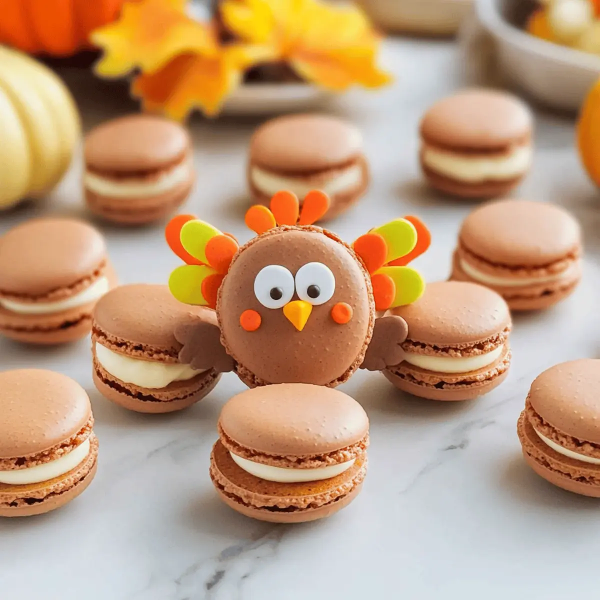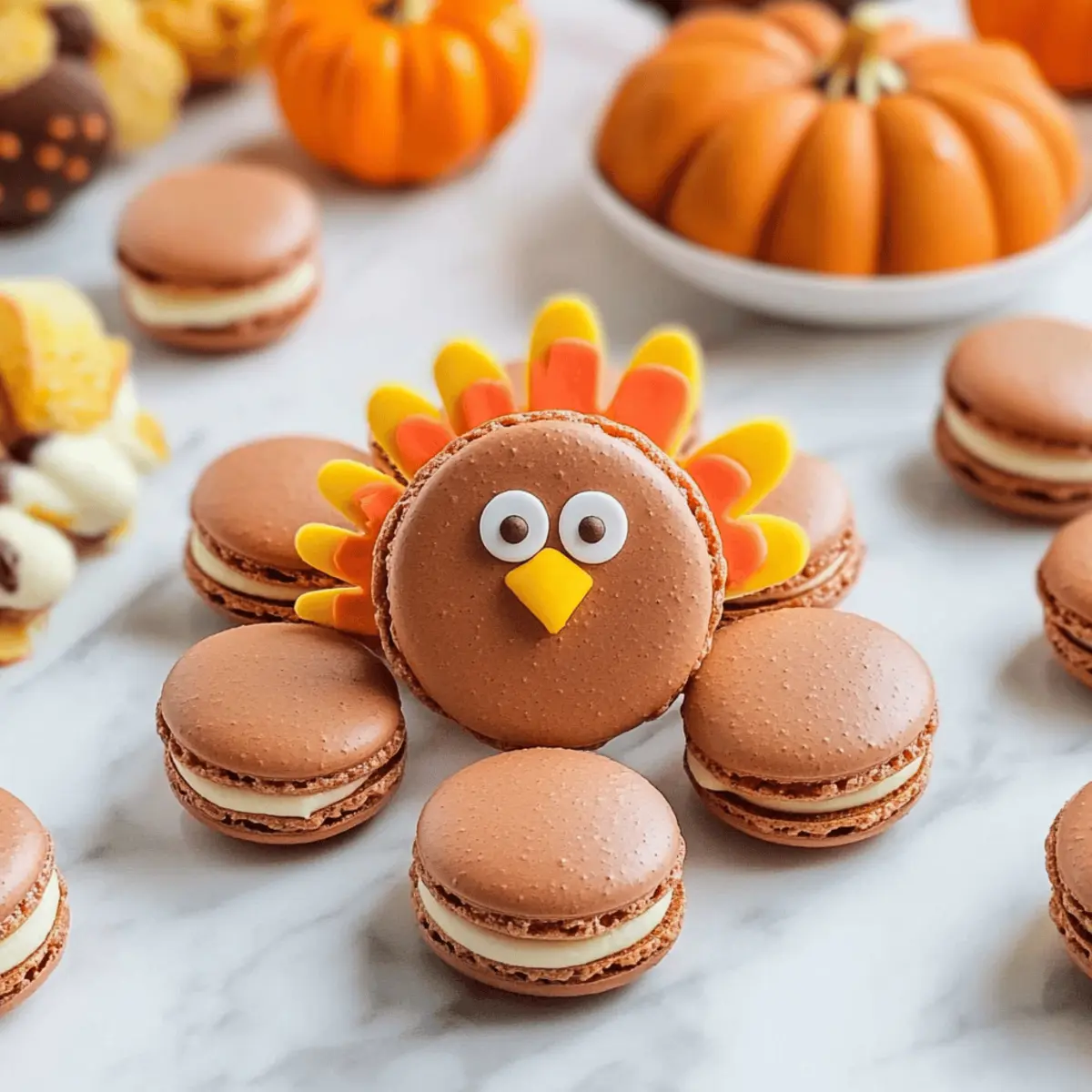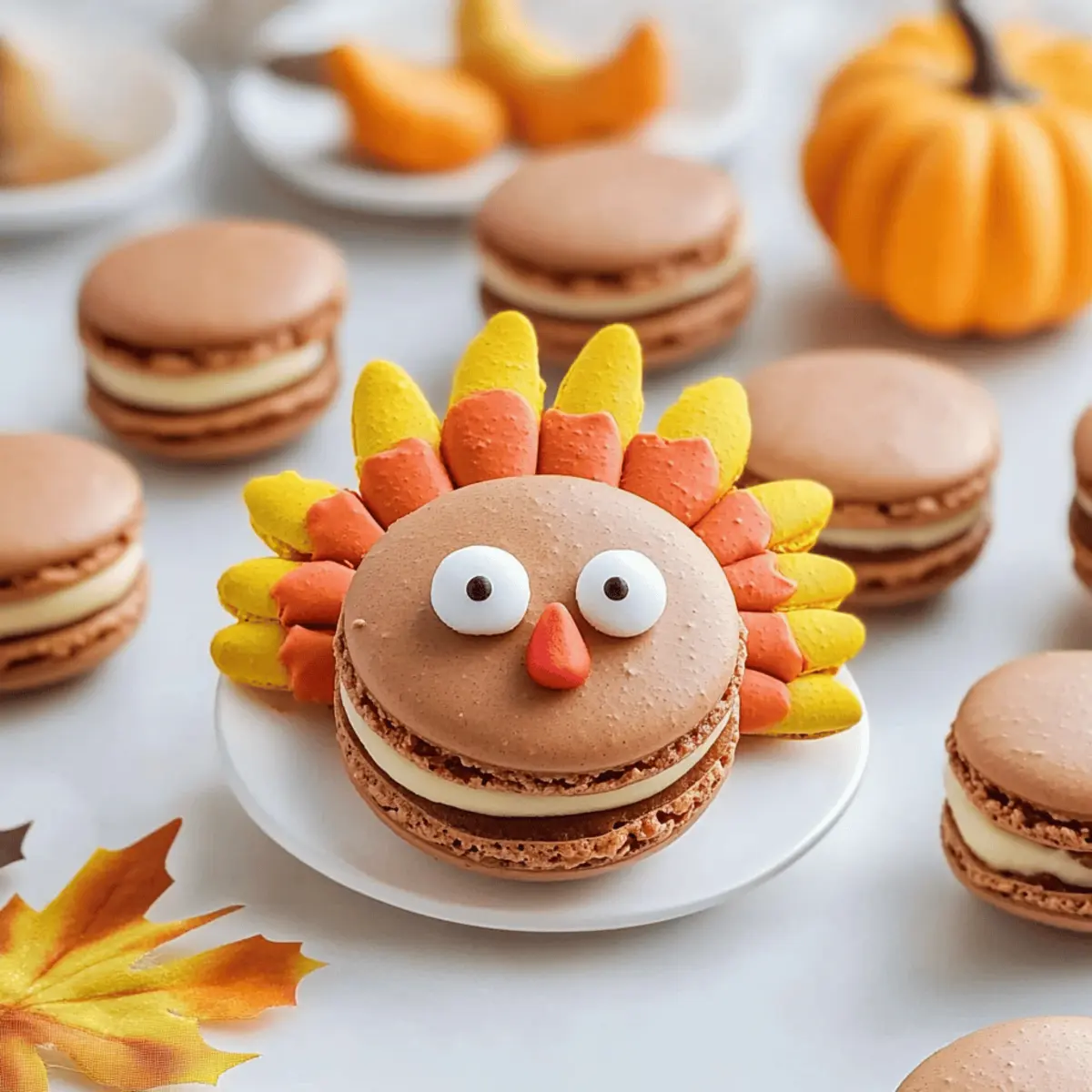 Jump to Recipe Print RecipeThe scent of autumn wafts through the air as I gather my tools for this wonderfully quirky bake. Thanksgiving Turkey Macarons with Pumpkin Buttercream are not just a treat; they’re a festive celebration in every bite. These adorable little cookies feature smooth almond flour shells filled with velvety pumpkin buttercream that pays homage to the cozy flavors of the season. Not only are they a delightful way to impress friends and family at your holiday gatherings, but they also bring a creative spin to your baking repertoire. Whether you’re a seasoned pastry chef or a novice home cook, the charm of these gluten-free treats beckons everyone to roll up their sleeves in the kitchen. So, are you ready to transform your dessert table into a whimsical autumn wonderland? Why are Thanksgiving Turkey Cookies special? Deliciously Festive: These Turkey Macarons bring the essence of autumn right to your dessert table with their pumpkin spice flavor and adorable turkey design. Gluten-Free Delight: Perfect for those with dietary restrictions, these treats are not just inclusive but equally delectable and appealing. Easy to Impress: Whether you’re a beginner or a pro, creating these whimsical treats will leave your guests charmed and delighted. Perfect for Sharing: Serve them at family gatherings or holiday parties; they make for a fun and quirky centerpiece, just like my Cotton Candy Cookies or Chocolate Oat Cookies. Memorable Flavor: The creamy pumpkin buttercream filling combined with the delicate almond shells takes these cookies to new heights, making every bite a cozy experience. Thanksgiving Turkey Cookies Ingredients • Celebrate the season with these delightful treats! For the Macaron Shells Almond flour – Provides a smooth, delicate texture essential for macarons; ensure it’s finely sifted for best results. Powdered sugar – Adds sweetness to the shells; can be substituted with confectioner’s sweetener for a low-sugar option. Ground cinnamon – Infuses warm autumn flavor into the shells. Egg whites – Critical for creating meringue; be sure they’re at room temperature for optimum volume. Cream of tartar – Stabilizes the egg whites and enhances the meringue’s structure. Granulated sugar – Necessary for stiffening the meringue; adds sweetness as well. Gel food coloring (brown) – Used to give the shells their adorable turkey hue; adjust for a deeper color as desired. For the Pumpkin Buttercream Filling Unsalted butter – Forms the creamy base for buttercream; use at room temperature for easy mixing. Cream cheese – Adds rich creaminess to the frosting, making it decadent. Pumpkin puree – Delivers that seasonal flavor and moisture; drain thoroughly to prevent excess liquid. Brown sugar – Enhances the pumpkin flavor in the filling, adding depth to the sweetness. Pumpkin spice – Complements the filling beautifully, reinforcing that cozy autumn profile. For Decoration Candy eyes, butterscotch chips, and candy corn – Fun decorations to create adorable turkey faces and tails, adding festive flair to your Thanksgiving Turkey Cookies. Step‑by‑Step Instructions for Thanksgiving Turkey Cookies Step 1: Prep Your Equipment Begin by thoroughly cleaning all your bowls, spatulas, and baking sheets with vinegar to remove any grease, which can interfere with your macaron shells. Preheat your oven to 300°F while you gather your ingredients, ensuring you have a baking mat or parchment paper ready for the next steps. Step 2: Make the Macaron Batter In a bowl, sift together the almond flour, powdered sugar, and ground cinnamon to ensure a fine texture. In a separate mixing bowl, whip the egg whites at room temperature with cream of tartar until frothy. Gradually add in the granulated sugar, continuing to whip until you achieve stiff peaks and glossy meringue. Fold in the dry ingredients and brown gel food coloring until the mixture flows gracefully in ribbons. Step 3: Pipe the Macarons Transfer the macaron batter into a piping bag fitted with a round tip, then pipe small circles onto your prepared baking mat, leaving some space between them. Tap the baking sheet gently on the counter to release any air bubbles. Allow the macarons to sit at room temperature until a skin forms on their surface, about 40 to 45 minutes—you’ll know they’re ready when they feel dry to the touch. Step 4: Bake the Macarons Once the skin has formed, carefully place your macaron trays in the preheated oven. Bake each tray separately for 13 to 14 minutes, monitoring closely to ensure they’re not overbaking. The cookies should have risen with a smooth surface and little feet on the bottom. After baking, allow them to cool completely on the baking sheet before carefully removing them. Step 5: Make the Pumpkin Buttercream Filling While your cookies cool, prepare the pumpkin buttercream filling. Squeeze the excess moisture out of the pumpkin puree and mix it with room temperature unsalted butter and cream cheese until smooth. Gradually add in the brown sugar and pumpkin spice, stirring until the mixture reaches a pipeable consistency. Step 6: Assemble the Turkey Macarons Pair the cooled macaron shells based on their sizes, then pipe a generous amount of the pumpkin buttercream filling onto the flat side of one shell. Place the matching shell on top, gently sandwiching them together to create your delightful Thanksgiving Turkey Cookies. Step 7: Decorate with Festive Flair To finish your whimsical turkey macarons, melt some butterscotch chips in the microwave and use them as glue to attach candy eyes, candy corn, and any other decorative elements to the top of your cookies. Get creative and let your festive spirit shine! Make Ahead Options These Thanksgiving Turkey Macarons are perfect for meal prep enthusiasts! You can prepare the macaron shells up to 3 days in advance and store them in an airtight container in the refrigerator to maintain their delicate texture. The pumpkin