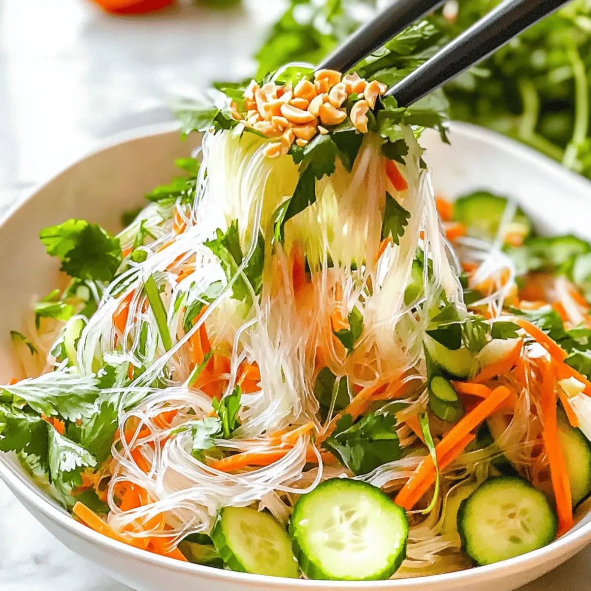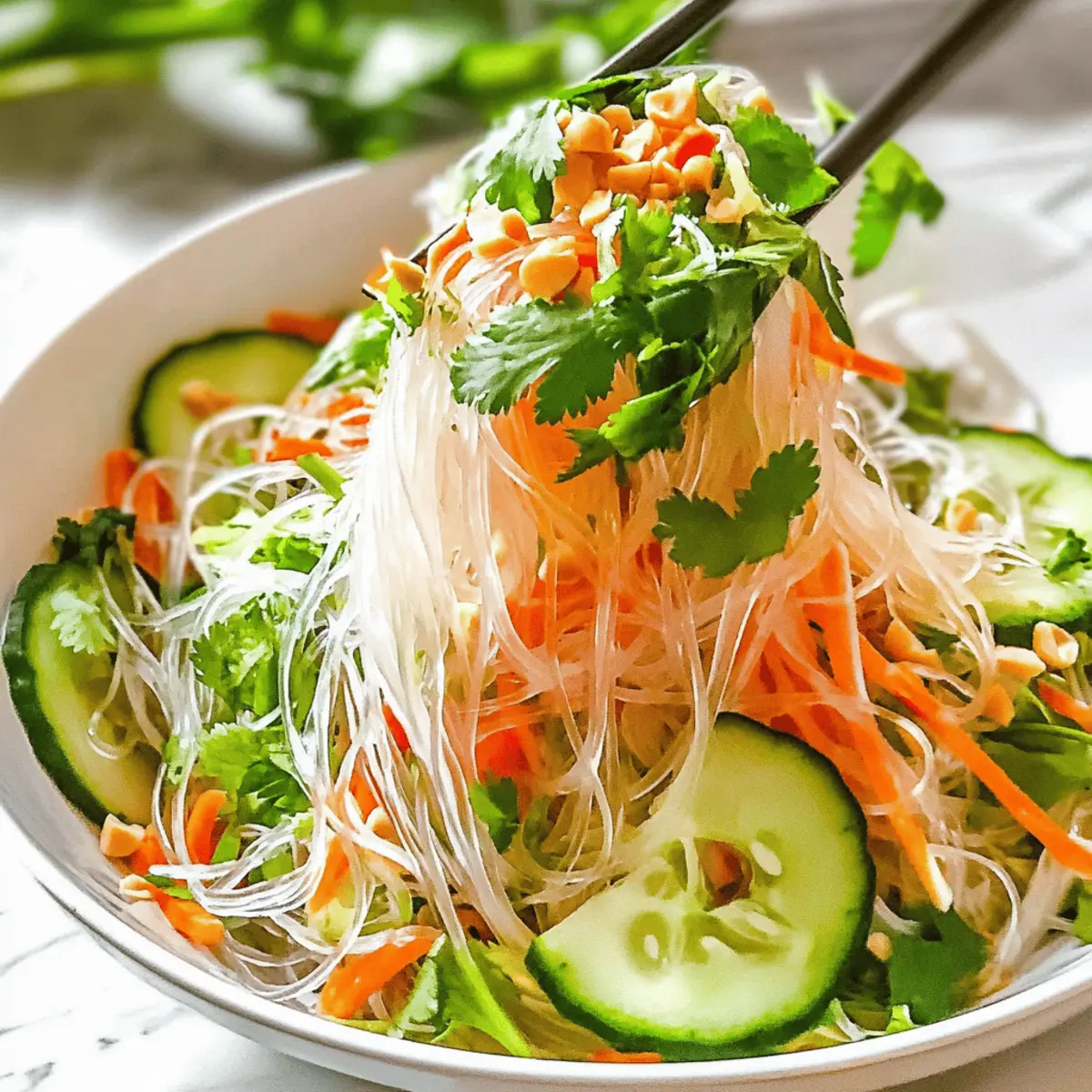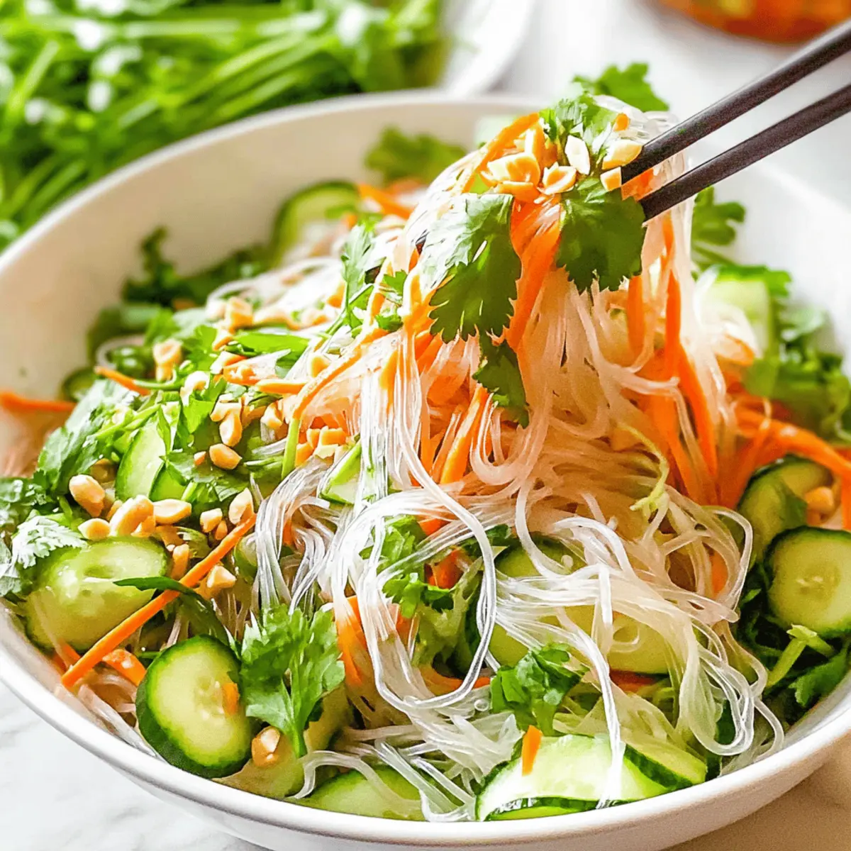 Jump to Recipe Print RecipeThe tangy aroma wafting through my kitchen transports me straight to the vibrant streets of Vietnam, where noodle salads are a refreshing staple. Today, I’m excited to share my version of this Quick and Easy Vietnamese Noodle Salad with Tangy Dressing, which is not only a breeze to prepare but also a delightful explosion of crunch and flavor. Ready in just 15 minutes, this salad is perfect for busy evenings or whenever you’re craving a light, healthy meal. Plus, the best part? It’s completely customizable, inviting a medley of your favorite veggies and proteins, and can easily be made vegan by swapping fish sauce for soy sauce. Are you ready to tantalize your taste buds with a dish that’s as simple as it is delicious? Let’s dive in! Why is this noodle salad a must-try? Simplicity at its finest: This Vietnamese Noodle Salad with Tangy Dressing is incredibly easy to whip up, making it perfect for both novice and experienced cooks alike. Vibrant and fresh: The crisp cucumbers and carrots paired with aromatic herbs create a burst of flavor in every bite. Customizable: Whether you’re feeling adventurous or keeping it classic, you can easily swap in your favorite veggies or proteins like grilled chicken or tofu. Healthy and light: At just 117 calories per serving, this salad is a fantastic, guilt-free addition to your meal rotation. Perfect as a side or main: Serve it alongside a delicious Asian dish or enjoy it as a standalone lunch — it’s versatile and satisfying! If you’re looking for more salad inspiration, consider trying a Chickpea Salad Grilled for variety. Vietnamese Noodle Salad Ingredients For the Salad Thin Vermicelli Rice Noodles (7 oz) – The base of the salad that offers delightful texture; any thin noodle can be used as a substitute. Cucumber (3 cups, julienned) – Provides a refreshing crunch; you can use about 2 cucumbers for this dish. Carrots (3 cups, julienned) – Adds sweetness and vibrant color; about 2 medium carrots are recommended. Fresh Herbs (2 ⅓ cups, tightly packed) – A mix of basil, cilantro, mint, and scallions is essential for flavor depth; feel free to experiment with your favorites. Jalapeno Peppers (2, optional) – Adds a kick of spice; slice into thin rounds if you choose to include them. Lime Wedges – Serve on the side to enhance the flavor profile of the salad. Crushed Peanuts – An optional garnish that imparts a delightful texture and nuttiness. For the Dressing Fish Sauce (¼ cup) – This key ingredient gives the dressing its signature umami; substitute with soy sauce for a vegan Vietnamese Noodle Salad. Sugar (¼ cup) – Balances the flavors beautifully, ensuring the dressing is perfectly harmonious. Water (⅓ cup) – Helps to dilute the dressing for the ideal consistency. Lime Juice (2 tbsp, freshly squeezed) – Adds acidity to brighten the dish; use the juice from about half a lime for the best result. Rice Wine Vinegar (2 tsp) – Offers tang; you can substitute with white vinegar if necessary. Garlic (1 clove, minced) – This enhances the flavor depth, making the dressing even more irresistible. Thai Chili Pepper (1 small, optional) – Provides an extra layer of heat; finely dice if you have it on hand. Get ready to create a vibrant and flavorful dish that’s sure to impress! Step‑by‑Step Instructions for Vietnamese Noodle Salad with Tangy Dressing Step 1: Prepare Noodles Bring a medium pot of water to a boil and add the thin vermicelli rice noodles. Let them soak in the boiling water for about 3 minutes until they are tender and soft. Once done, drain the noodles in a colander and rinse them under cold water to stop the cooking process. Set the noodles aside to cool while you prepare the vegetables. Step 2: Prep Vegetables While your noodles are soaking, take this time to julienne the cucumbers and carrots using a sharp knife or a julienne peeler. Aim for uniform, thin strips for even texture. Next, chop a generous mix of fresh herbs like basil, cilantro, and mint, tossing them into a bowl as you go. If you’re using jalapeno peppers, slice them into thin rounds as well to add some extra spice to your Vietnamese noodle salad. Step 3: Make Dressing In a medium bowl, whisk together the fish sauce (or soy sauce for a vegan option), sugar, water, lime juice, rice wine vinegar, and minced garlic. Stir until the sugar is fully dissolved, creating a smooth dressing. If using, finely dice the Thai chili pepper and add it to the mix for an extra kick. Taste the dressing and adjust the flavors as needed to ensure it’s perfectly balanced for your Vietnamese noodle salad. Step 4: Assemble Salad In a large mixing bowl, combine the drained noodles with the julienned cucumbers, carrots, and the mixed herbs. If you opted for jalapenos, add those in as well. Pour the tangy dressing over the top and gently toss everything together until the noodles and veggies are evenly coated with the delicious flavor. Use tongs or two forks to carefully mix without breaking the noodles. Step 5: Serve Once your Vietnamese noodle salad is thoroughly mixed, transfer it to a serving platter or individual bowls. For added texture, sprinkle some crushed peanuts on top and serve with lime wedges on the side. This dish can be enjoyed immediately as a bright, refreshing main or side, or chilled in the fridge if you prefer it cold. Storage Tips for Vietnamese Noodle Salad with Tangy Dressing Room Temperature: It’s best to enjoy your Vietnamese Noodle Salad fresh. If left out, aim to serve within 2 hours to maintain quality and safety. Fridge: Store leftover salad in an airtight container for up to 3 days. For optimal freshness, keep the dressing separate until you’re ready to serve. Freezer: This salad is best consumed fresh and doesn’t freeze well due to the delicate nature of the vegetables. Freezing may result in soggy textures upon thawing. Reheating: If desired, gently reheat the noodles in a pan on low heat