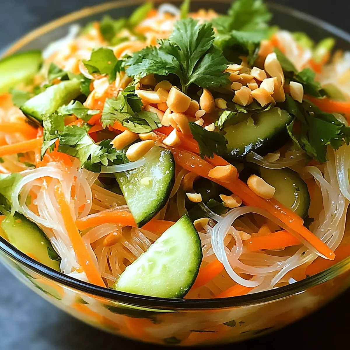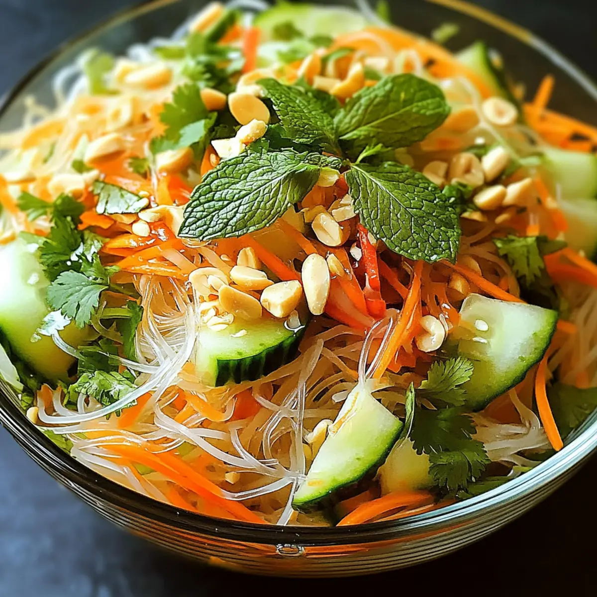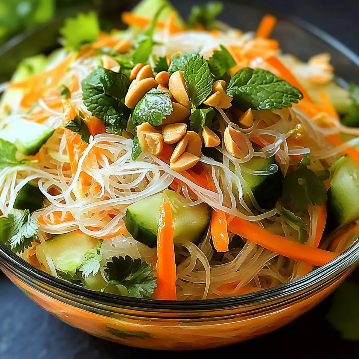 Jump to Recipe Print RecipeAs I stood in my kitchen, the vibrant colors of fresh vegetables reminded me of a bustling Vietnamese market, alive with energy and tantalizing aromas. The Quick Vietnamese Noodle Salad captures that spirit beautifully, offering a delightful blend of textures and flavors that brighten up any meal. In just 20 minutes, you can whip up this refreshing dish, perfect for those hectic weeknights when you crave something light yet satisfying. It’s not only a vegan-friendly option, but also fully customizable to suit your taste. Whether you enjoy crunching on crisp cucumbers or savoring the hint of fresh mint, this salad invites you to get creative with your ingredients. Are you ready to explore the simplicity and joy of homemade goodness? Why is Vietnamese Noodle Salad a Must-Try? Quick, delicious meal: This Vietnamese Noodle Salad is a fantastic go-to for busy weeknights. Fresh ingredients like vibrant veggies and rice vermicelli noodles come together effortlessly, offering a healthy option that satisfies. Customizable flavors mean you can adapt this dish to your taste or dietary needs. If you’re a fan of light meals, it pairs beautifully with sides like Chickpea Salad Grilled or Asian-style spring rolls. Nutritious and wholesome, this salad is packed with vitamins and is a low-calorie choice at just 250 calories per serving. Finally, perfection in minutes—you’ll have a flavorful dish ready in only 20 minutes, making your weeknight dinners a breeze. Vietnamese Noodle Salad Ingredients • Here’s what you’ll need to create this refreshing dish! For the Base Rice Vermicelli Noodles – Provide a light and chewy base; rinse under cold water after cooking to prevent clumping. For the Crunch Shredded Carrots – Adds a sweet crunch; julienned radishes can be a spicy substitute. Cucumber (julienned) – Freshness and crunch; zucchini works well if you wish to switch things up. Red Bell Pepper (thinly sliced) – Offers vibrant color; swap with snap peas or other bell peppers if desired. Bean Sprouts – Contributes a nice pop; sunflower sprouts are a diverse alternative. For the Freshness Fresh Cilantro (roughly chopped) – Imparts aromatic freshness; parsley can be used for a milder flavor. Fresh Mint Leaves (roughly chopped) – Adds a refreshing lift; omit or replace with basil for a different twist. For the Crunchy Finish Roasted Peanuts (coarsely chopped) – Introduces crunch and nuttiness; sunflower seeds offer a nut-free option. For the Dressing Soy Sauce – Provides delightful umami; substitute with tamari for a gluten-free version. Fresh Lime Juice – Brightens flavors; lemon juice works in a pinch. Sesame Oil – Adds rich depth; olive oil can lighten the profile if desired. Honey or Agave Syrup – Balances flavors with sweetness; maple syrup is a fine alternative. Garlic (minced) – Enhances overall taste; omit for milder flavor or swap in garlic powder. Step‑by‑Step Instructions for Vietnamese Noodle Salad Step 1: Cook the Noodles Begin by bringing a large pot of water to a rolling boil over high heat. Once boiling, add the rice vermicelli noodles and cook for 4-5 minutes, stirring occasionally to prevent sticking. When the noodles are tender yet slightly firm to the bite (al dente), drain them in a colander and rinse under cold water to stop the cooking process and avoid clumping. Step 2: Prepare Veggies While the noodles are cooking, take the time to wash and slice your vegetables. Shred the carrots and julienne the cucumber and red bell pepper, creating colorful, thin strips. Add these vibrant veggies, along with the bean sprouts, into a large mixing bowl. Their crisp textures will add freshness to your Vietnamese Noodle Salad, making it visually appealing and delicious. Step 3: Make Dressing In a separate bowl, whisk together ¼ cup of soy sauce, the juice of one lime, 2 tablespoons of sesame oil, 1 tablespoon of honey, and 1 clove of minced garlic. Blend these ingredients well until combined, ensuring a cohesive and zesty dressing. Adjust the seasoning by adding salt and pepper to taste, then set it aside to let the flavors meld. Step 4: Combine Once the noodles have cooled and the vegetables are prepared, add the noodles to the mixing bowl with the veggie medley. Pour the prepared dressing over the noodle-vegetable mix, and use tongs or forks to gently toss everything together until evenly coated. The vibrant colors should be beautifully highlighted as the dressing clings to each ingredient. Step 5: Fold in Herbs and Peanuts After the noodles and vegetables are combined, gently fold in the roughly chopped fresh cilantro and mint, allowing their aromatic qualities to infuse the salad. Sprinkle in the coarsely chopped roasted peanuts for added crunch. Reserve a portion of the peanuts for garnishing later, ensuring every bite has that delightful nutty finish. Step 6: Serve Spoon the Vietnamese Noodle Salad into individual bowls, artfully garnishing each with the reserved peanuts and fresh lime wedges for an extra zesty kick. The salad is best served chilled or at room temperature, making it a fantastic choice for a quick, refreshing meal. Enjoy the explosion of colors and flavors that embody this delightful dish! Vietnamese Noodle Salad Variations & Substitutions Feel free to let your creativity shine and customize this vibrant salad to your heart’s content! Dairy-Free: Replace honey with maple syrup for plant-based sweetness that complements the salad beautifully. Spicy Twist: Add chili flakes or sriracha to the dressing for a zing that elevates the flavor profile. Protein-Packed: Toss in grilled chicken, shrimp, or crispy tofu to transform the salad into a hearty main course. Vegetable Swap: Use snap peas or julienned radishes instead of cucumbers and bell peppers for a seasonal twist with extra crunch. Omit Nuts: If you’re going nut-free, sunflower seeds are a fantastic substitute for peanuts while retaining that delightful crunc