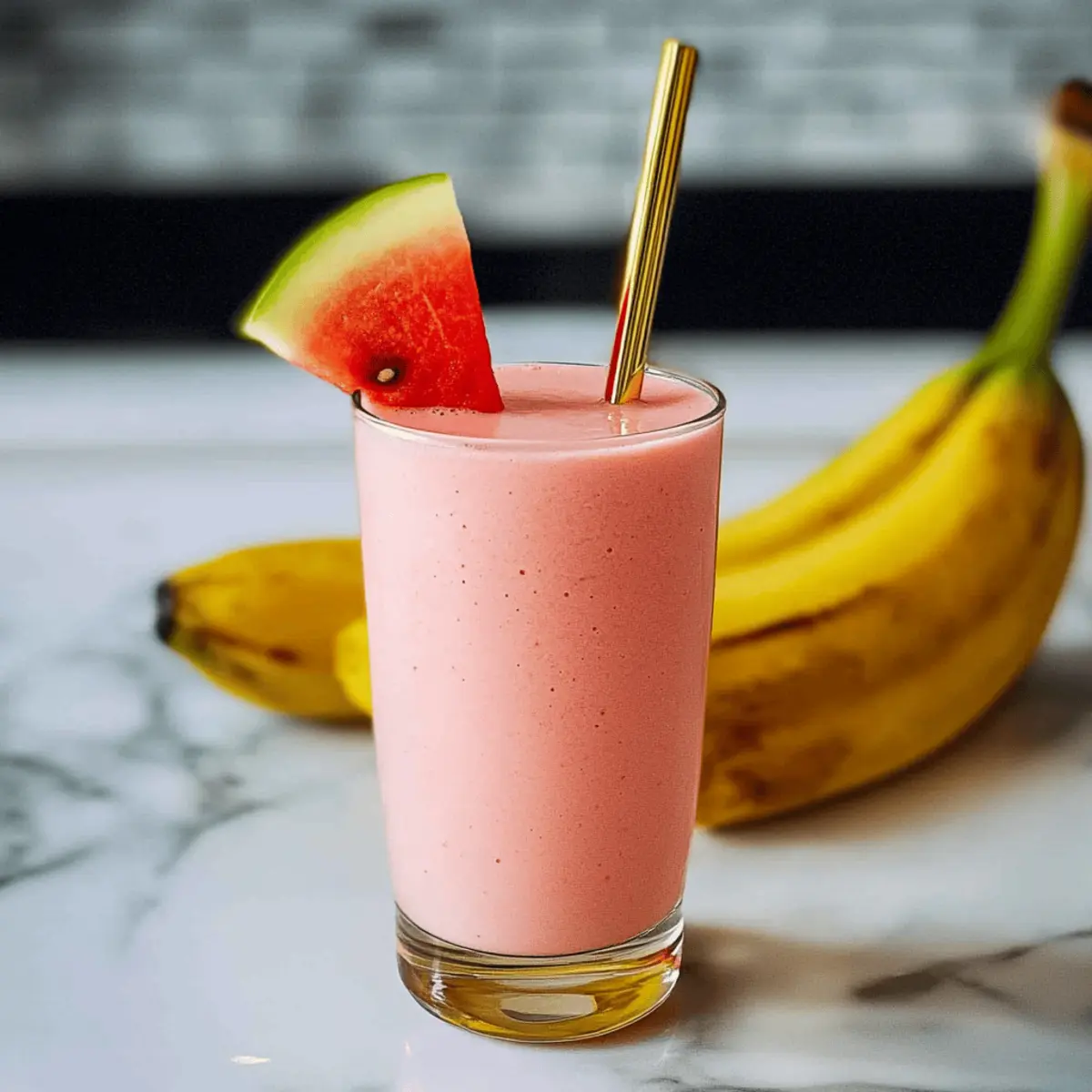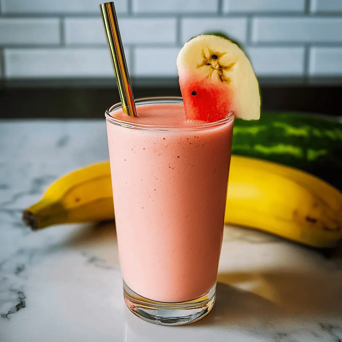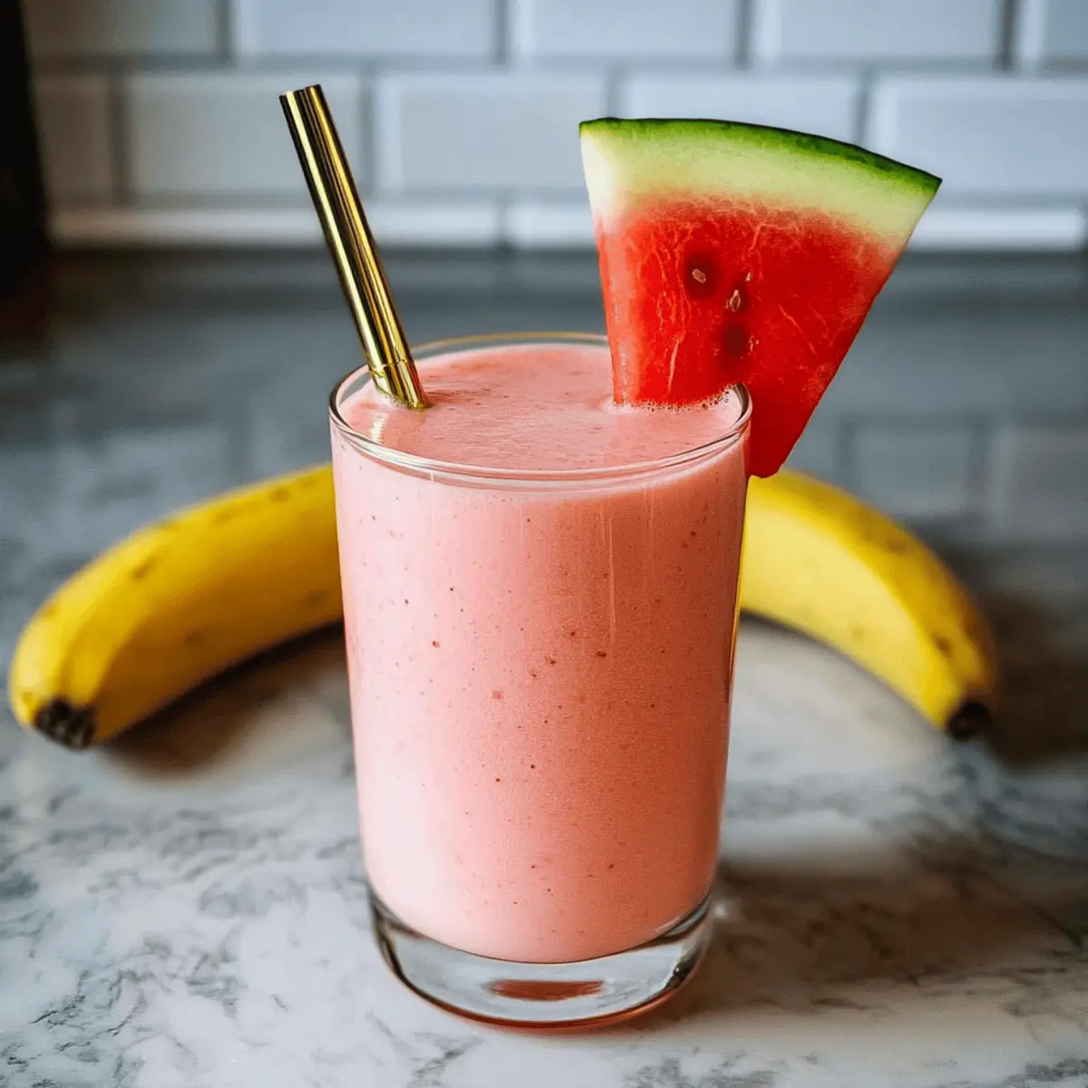 Jump to Recipe Print RecipeAs I stood in my kitchen, the sun pouring in and painting everything in golden hues, I couldn’t help but grab for the vibrant watermelon sitting on my counter. That’s how my 4-Ingredient Watermelon Banana Smoothie came to life—a quick concoction that embodies pure refreshment. With just four ingredients, this smoothie promises to be your go-to for busy mornings or those post-workout cravings. Not only is it a healthy choice, bursting with hydration and essential nutrients, but it’s also incredibly easy to whip up in under five minutes. Perfect for those who want a nutritious treat without a complicated mess! Curious to see how you can make this delightful beverage your own? Let’s dive in! Why is this smoothie a must-try? Quick and Easy: With just four ingredients, you can whip this delightful smoothie together in under five minutes, making it perfect for busy mornings. Hydrating Refreshment: The sweet watermelon not only adds a juicy burst of flavor but also keeps you hydrated—a must on warm days! Customizable: Switch out the banana for your favorite fruit or use dairy-free yogurt, allowing you to enjoy a unique twist every time, just like my Banana Split Bars if you’re in the mood for something cozy. Protein-Packed: The addition of Greek yogurt provides a creamy richness and a dose of protein, making this smoothie not just tasty but nourishing too. Crowd-Pleaser: Kids and adults alike will love this smoothie, making it an excellent choice for family gatherings or refreshing snacks. Guilt-Free Indulgence: At about 272 calories per serving, this smoothie is a deliciously healthy treat, perfect for anyone looking to indulge without guilt! Watermelon Banana Smoothie Ingredients For the Smoothie Banana – Adds natural sweetness and creaminess; approximately ¾ cup sliced will do the trick. Seedless Watermelon – Main ingredient that brings hydration and a fresh taste; chop into 1-inch cubes for easy blending. Vanilla Greek Yogurt – Provides creaminess and protein; swap with dairy-free yogurt for a vegan alternative. Brown Sugar (optional) – Enhances sweetness; try using a sugar substitute like Swerve for a healthier option. Feel free to experiment and customize your Watermelon Banana Smoothie to suit your taste! Step‑by‑Step Instructions for Watermelon Banana Smoothie Step 1: Prepare the Banana Start by slicing a ripe banana and placing it in a small bowl. If you desire extra sweetness, sprinkle the banana with a little brown sugar. Microwave the bowl for 20-30 seconds until warm, then allow it to cool slightly. This step enhances the banana’s natural sweetness for your Watermelon Banana Smoothie. Step 2: Combine Ingredients in Blender In a blender, add the chopped seedless watermelon, approximately 1-inch cubes, followed by the cooled banana and about ¾ cup of vanilla Greek yogurt. If using, you can include the optional brown sugar here. Ensure all ingredients are properly layered in the blender to achieve a smooth blend. Step 3: Blend Until Smooth Blend the mixture on high speed for about 30-45 seconds or until it reaches a smooth and creamy consistency. You may need to stop the blender and scrape down the sides to ensure everything is evenly mixed. The vibrant pink hue should be inviting, indicating your Watermelon Banana Smoothie is almost ready. Step 4: Adjust Consistency Check the thickness of your smoothie; if it’s too thick, add a little more chopped watermelon or a splash of water to reach your desired consistency. Blend again for another 10-15 seconds to fully combine any additions, ensuring your smoothie is refreshingly smooth and ready to enjoy. Step 5: Serve and Enjoy Pour the smoothie into a chilled glass for optimal freshness. This Watermelon Banana Smoothie is best served immediately, allowing you to savor its delightful flavor and creamy texture. Feel free to garnish with a slice of watermelon or banana on the rim for a delightful presentation. Watermelon Banana Smoothie Variations Feel free to unleash your creativity and make this smoothie your own with these fun twists! Tropical Twist: Replace watermelon with fresh pineapple or mango for a sun-kissed flavor. Imagine sipping on a tropical breeze, bringing a bit of the beach to your kitchen! Dairy-Free Delight: Use coconut yogurt in place of Greek yogurt for a deliciously creamy and vegan-friendly option. The subtle coconut flavor can transport you to an island escape with every sip. Nutty Addition: Stir in a tablespoon of almond or peanut butter for extra protein and a rich, nutty taste. This enhances the creaminess while adding a satisfying crunch if you sprinkle some nuts on top. Avocado Smoothie: Add half a ripe avocado for a boost of healthy fats and creaminess. This secret ingredient gives your smoothie a buttery texture that’s both indulgent and nutritious! Spice It Up: A dash of cinnamon or ginger can elevate the flavor profile, providing warmth and depth to your refreshing drink. It’s a delightful surprise that makes each sip extra special. Berry Boost: Toss in a handful of blueberries or strawberries for a fruity explosion and extra antioxidants. Combining flavors creates a smoothie that’s both vibrantly colorful and irresistibly tasty! Banana-Free Option: Go for an all-watermelon experience by swapping out the banana for more watermelon. This makes the smoothie lighter and refreshingly hydrating, perfect for hot summer days. And if you’re ever in the mood for something a bit different, don’t forget to check out my recipes for Banana Chips Homemade or Banana Chips Crunchy for a fun snack to enjoy alongside your smoothie! Expert Tips for Watermelon Banana Smoothie Chill Your Ingredients: Using chilled watermelon and yogurt enhances the smoothie’s refreshing taste, making it a perfect treat on warm days. Customize Sweetness: Adjust the brown sugar to your preference; start with a small amount and blend, adding more only if needed to avoid overpowerin