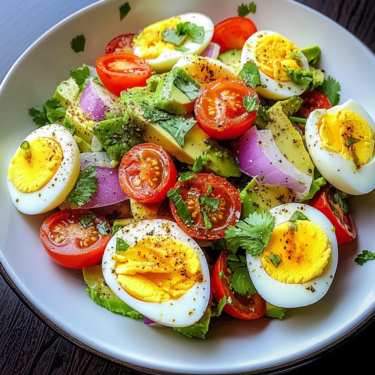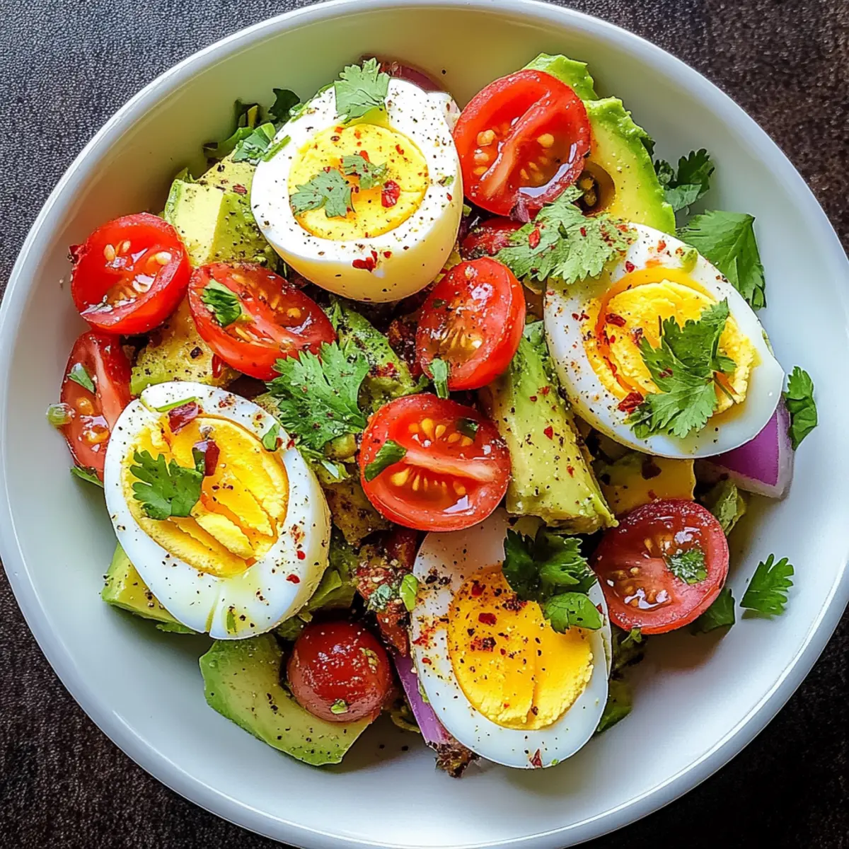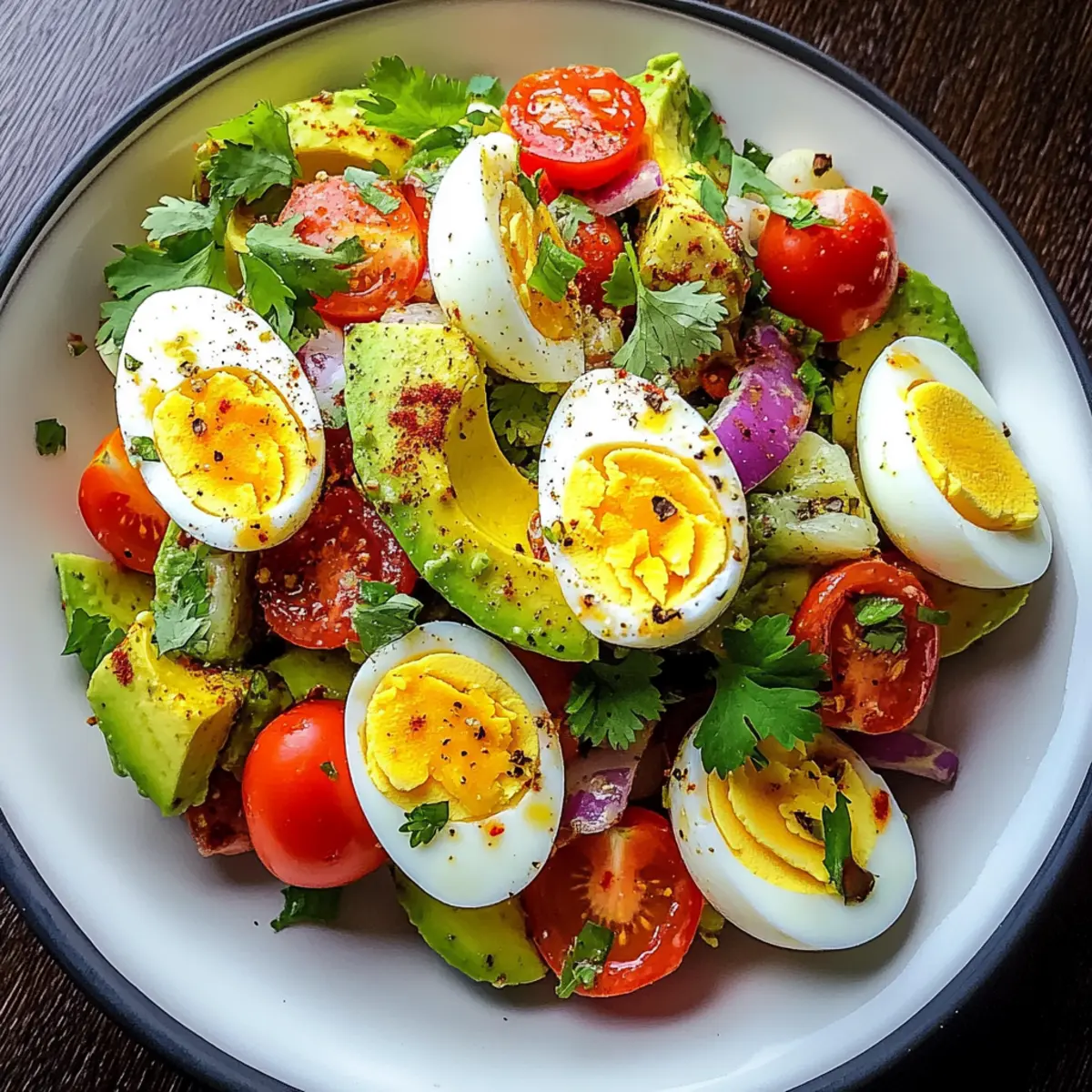 Jump to Recipe Print RecipeAfter an intense workout, you know that satisfied feeling when your body craves something nourishing yet light. That’s where my Workout Egg Avocado Salad steps in—a delightful blend of protein-rich hard-boiled eggs and creamy avocados. With every bite, you’ll enjoy the refreshing crunch of cherry tomatoes and the zesty kick from lime juice, making it the perfect post-exercise meal or quick lunch. Best of all, this salad comes together in just 30 minutes, giving you a healthy fuel-up without the fuss. Whether you’re a seasoned chef or just starting out, this beginner-friendly recipe is completely gluten-free and packed with nutrients to help you recover and thrive. Are you ready to whip up a bowl of goodness that satisfies your hunger without weighing you down? Why is This Salad a Must-Try? Nourishing and packed with protein, this salad is perfect for post-workout recovery. Effortless to make, it comes together in just 30 minutes, ideal for busy lives. Flavorful ingredients like creamy avocados and zesty lime create a vibrant taste profile. Versatile enough for lunch or dinner, it’s also gluten-free and perfect for meal prep. Want more excitement in your meals? Try incorporating this Workout Egg Avocado Salad with a side of Quinoa Crunch Salad or enjoy it on whole-grain toast for an extra boost! Workout Egg Avocado Salad Ingredients This salad is packed with wholesome goodness to fuel your body post-exercise! For the Salad Eggs – A protein powerhouse for muscle recovery; feel free to swap in scrambled eggs for a different texture. Avocados – Source of healthy fats that provide creaminess and satisfaction; ensure they are ripe for optimal flavor and texture. Red Onion – Adds sharpness and crunch; substitute with green onions for a milder flavor if you prefer. Cherry Tomatoes – Provide sweetness and acidity, enhancing taste; any ripe tomato variety can be used here. Cilantro – Offers freshness and brightens the salad; parsley is a good substitute for a different flavor profile. For the Dressing Lime Juice – Adds tang and prevents avocado from browning; feel free to use lemon juice as an alternative. Olive Oil – Provides a silky finish and depth; consider avocado oil for a slightly different taste. Salt & Pepper – Essential for flavor enhancement; freshly cracked pepper is recommended for a better flavor experience. Red Pepper Flakes – Add optional spice for those who enjoy a kick; simply omit if you’re seeking a milder dish. This vibrant Workout Egg Avocado Salad is a delightful blend of flavors and textures, perfect for energizing your post-workout meal! Step‑by‑Step Instructions for Workout Egg Avocado Salad Step 1: Boil the Eggs Place your eggs in a medium pot and cover them with cold water, allowing for about an inch above the eggs. Bring the water to a boil over medium-high heat. Once it reaches a rolling boil, cover the pot, remove it from the heat, and let the eggs sit for 10–12 minutes to cook perfectly. Step 2: Prepare the Avocado Mixture While your eggs are cooking, take ripe avocados and halve them. Scoop the flesh into a large bowl and mash gently with a fork, leaving some small chunks for texture. Add finely chopped red onion, halved cherry tomatoes, and chopped cilantro to the bowl, creating a colorful base for your Workout Egg Avocado Salad. Step 3: Season the Avocado Mixture Drizzle the mixture with fresh lime juice and olive oil, stirring gently to combine. This not only enhances the flavor but also helps prevent the avocados from browning. Keep mixing until all ingredients are evenly distributed and you can see the vibrant greens of the avocado contrasting beautifully with the other veggies. Step 4: Cool and Peel the Eggs Once the eggs have rested in the hot water, prepare an ice bath by filling a bowl with ice and cold water. Transfer the eggs to this ice bath for about 5 minutes to cool them down quickly. This will make peeling much easier, ensuring you have nicely shelled eggs for your salad. Step 5: Chop the Eggs After cooling, gently tap each egg on a hard surface and peel under running water to help remove the shell. Once peeled, chop the eggs into bite-size pieces. Their firm texture will complement the creamy avocado in your Workout Egg Avocado Salad perfectly. Step 6: Combine the Ingredients Fold the chopped eggs into the avocado mixture, being careful not to mash them too much. Season with salt, freshly cracked pepper, and optional red pepper flakes for a hint of spice. Gently mix until all ingredients are nicely incorporated, balancing flavors for a delicious salad. Step 7: Adjust Seasoning and Serve Taste your salad and adjust the seasoning as needed with additional salt or lime juice. Serve immediately chilled or at room temperature, either on a bed of greens, in lettuce wraps, or spooned onto whole-grain toast for an energizing meal anytime. Make Ahead Options These Workout Egg Avocado Salad components are perfect for meal prep, saving you time during busy weekdays! You can boil and chop the eggs up to 3 days in advance, storing them in an airtight container in the refrigerator for freshness. Also, you can prepare the avocado mixture (excluding the lime juice) and refrigerate it up to 24 hours ahead—just be sure to cover it tightly to prevent browning. When you’re ready to enjoy your salad, mix in the lime juice, fold in the chopped eggs, and season to taste. This way, your meal will be just as colorful and delicious, with minimal effort on the day you serve it! Expert Tips for Workout Egg Avocado Salad Fresh Ingredients: Use the freshest avocados and vegetables for the best flavor. Wilting ingredients can dull the bright taste of your salad. Egg Cooking: Be cautious not to overcook the eggs; this can lead to a rubbery texture. Use an ice bath post-cooking to ensure easy peeling. Chunky Avocado: Aim for slightly chunky mashed avocado. A creamy base with some texture enhances the overall mouthf